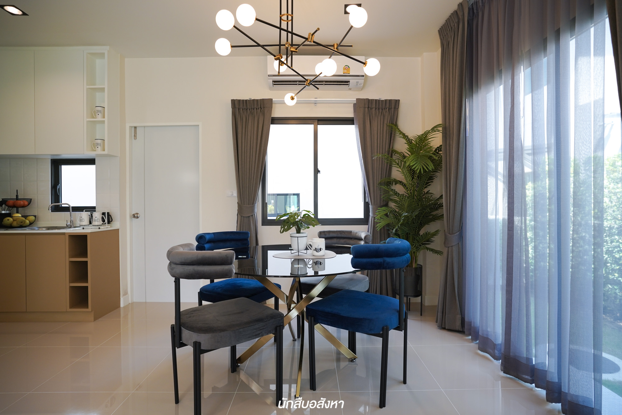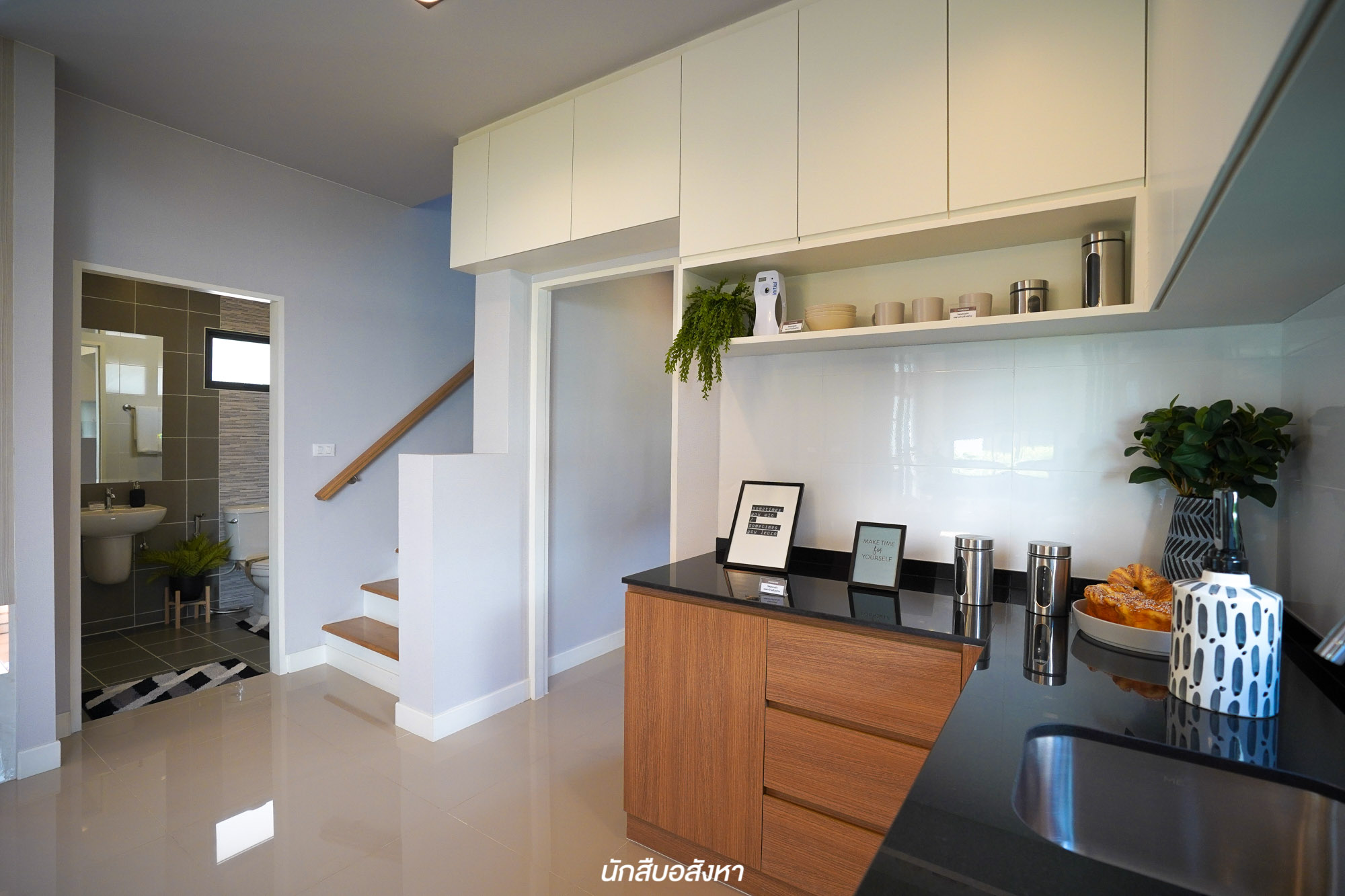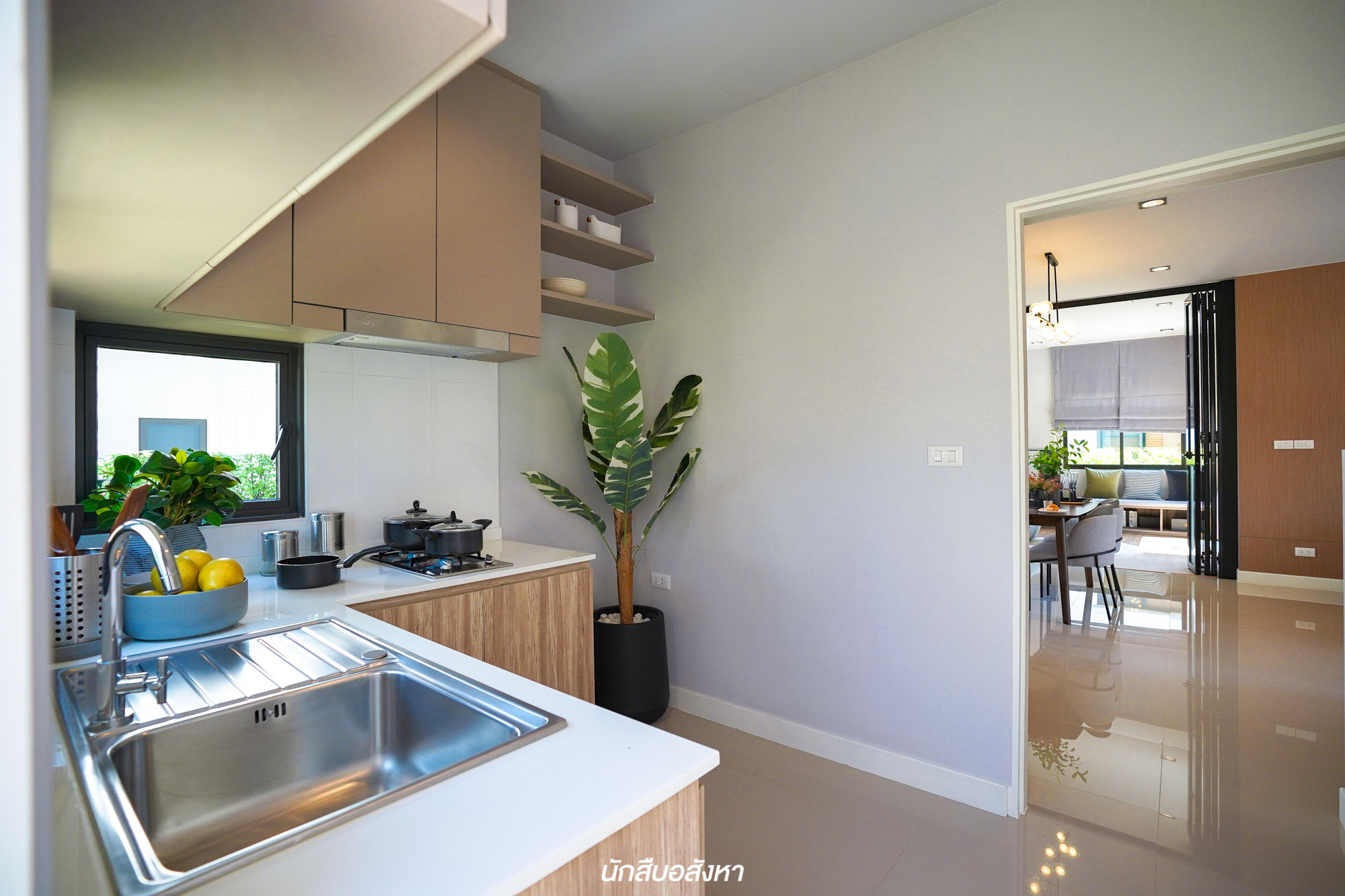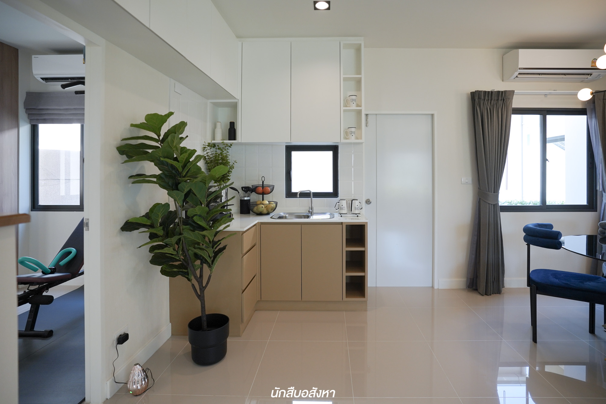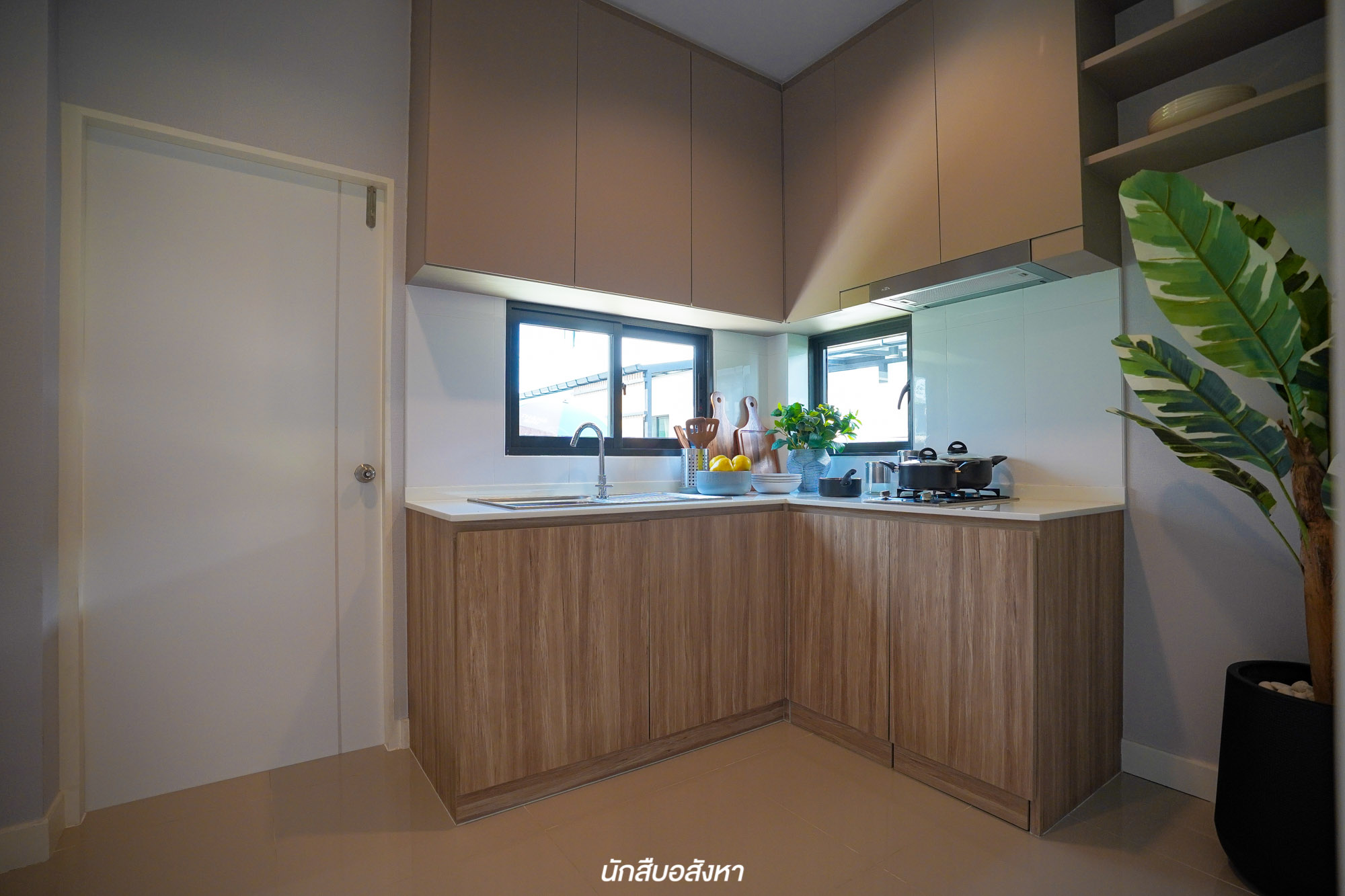 โซนเตรียมอาหาร จะมีหน้าต่างช่องเล็กมาให้เพื่อเสริมการใช้งานให้กับลูกบ้านด้วย สามารถปรับเปลี่ยนโซนนี้ได้ตามการใช้งานได้เลย ด้านข้างจะเป็นประตูออกไปหลังบ้าน