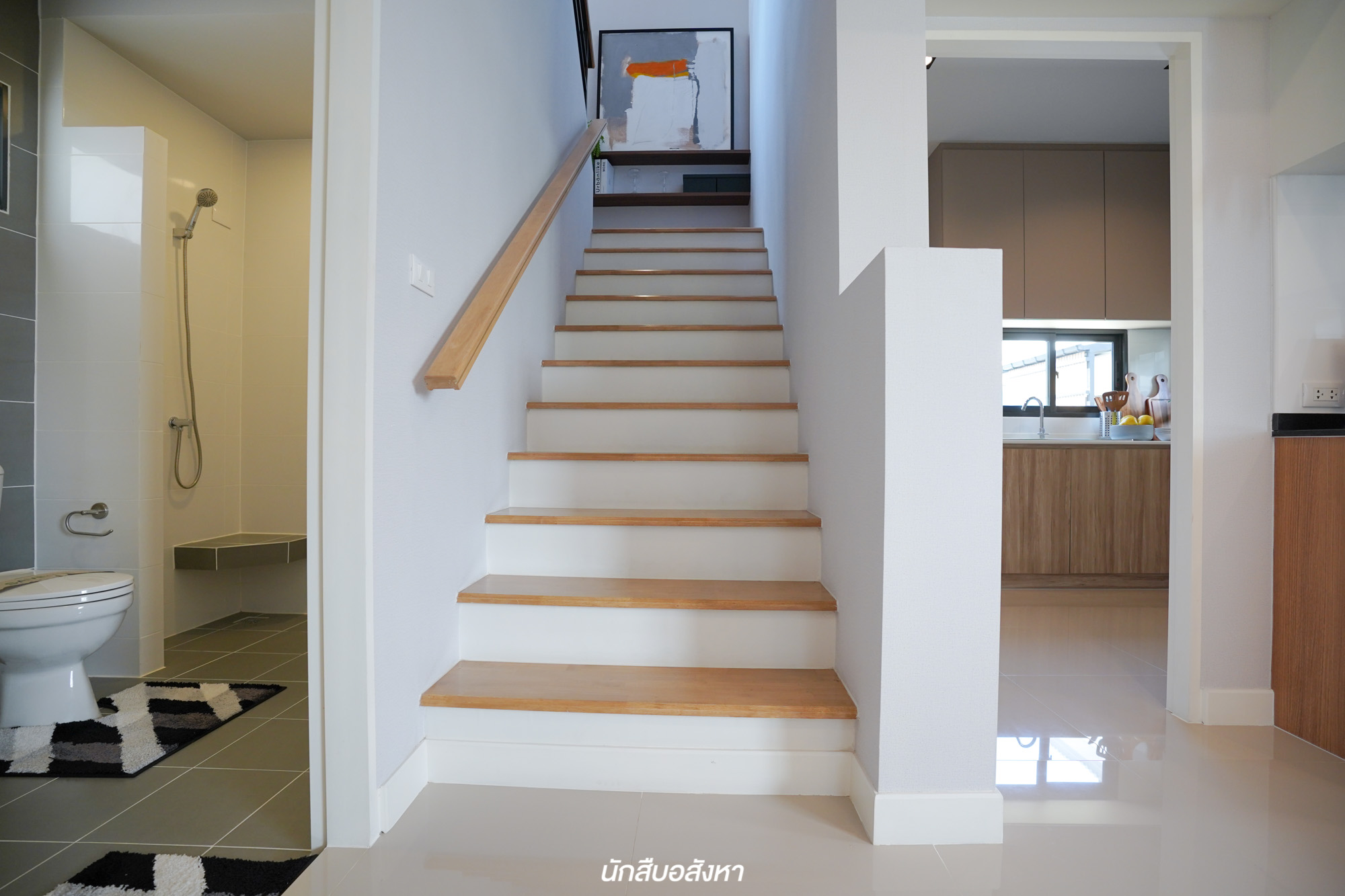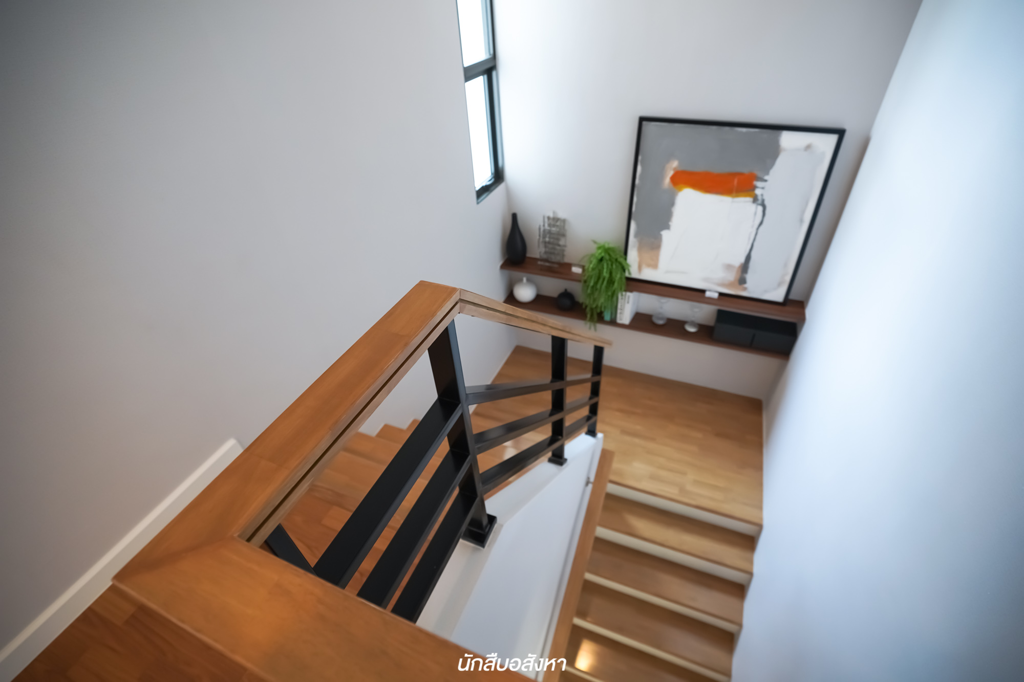 บันไดขึ้นชั้น 2 จะเห็นได้ว่าโปร่งมากเพดานสูงมีช่องแสงธรรมชาติที่สามารถเปิดได้ด้วย ทำให้พื้นที่ดูโปร่ง ไม่ดูอึดอัด