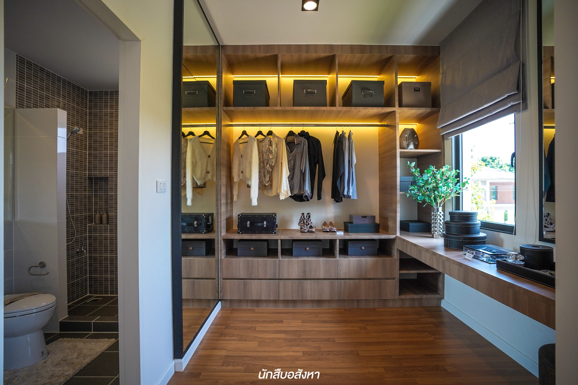 โซน Walk in closet ที่สามารถทำบานกั้นระหว่างโซนนอนได้ด้วย มีหน้าต่างเพิ่มความสว่างในห้องได้อีก และเชื่อมไปยังห้องน้ำที่อยู่ในห้องได้ด้วย