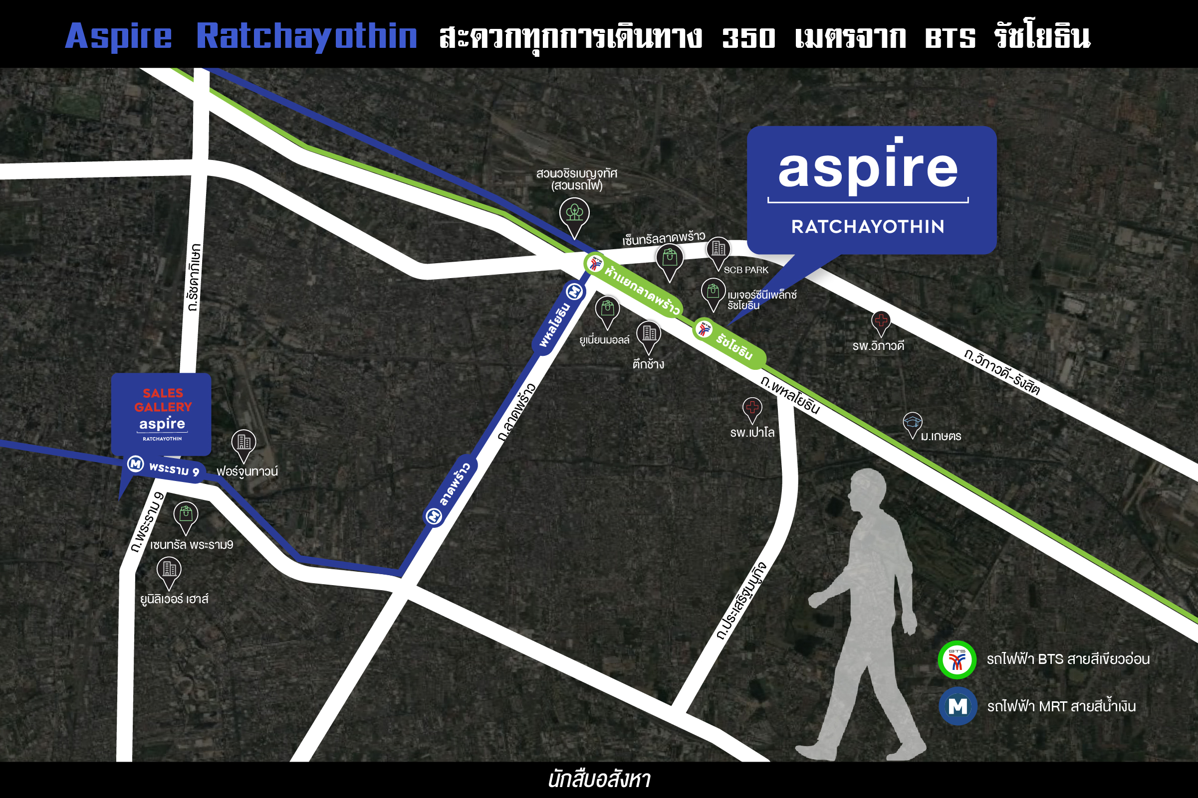 “Aspire Ratchayothin” ตั้งอยู่ในซอยพหลโยธิน 35 บนทำเลศักยภาพ “รัชโยธิน” ใกล้ BTS สถานี รัชโยธิน ในระยะที่เดินสบายๆ 350 เมตร นอกจากนี้ซอย 35 ยังสามารถทะลุ ลัดไปยังถนนรอบด้านได้อีกหลายเส้นทาง ไม่ว่าจะเป็นถนนรัชดาภิเษก ถนนวิภาวดีรังสิต หรือถนนงามวงศ์วาน จะเดินทางเข้าเมืองหรือออกเมืองก็สะดวกครับ และยังแวดล้อมไปด้วยสิ่งอำนวยความสะดวก รองรับทุกไลฟ์สไตล์ อาทิ