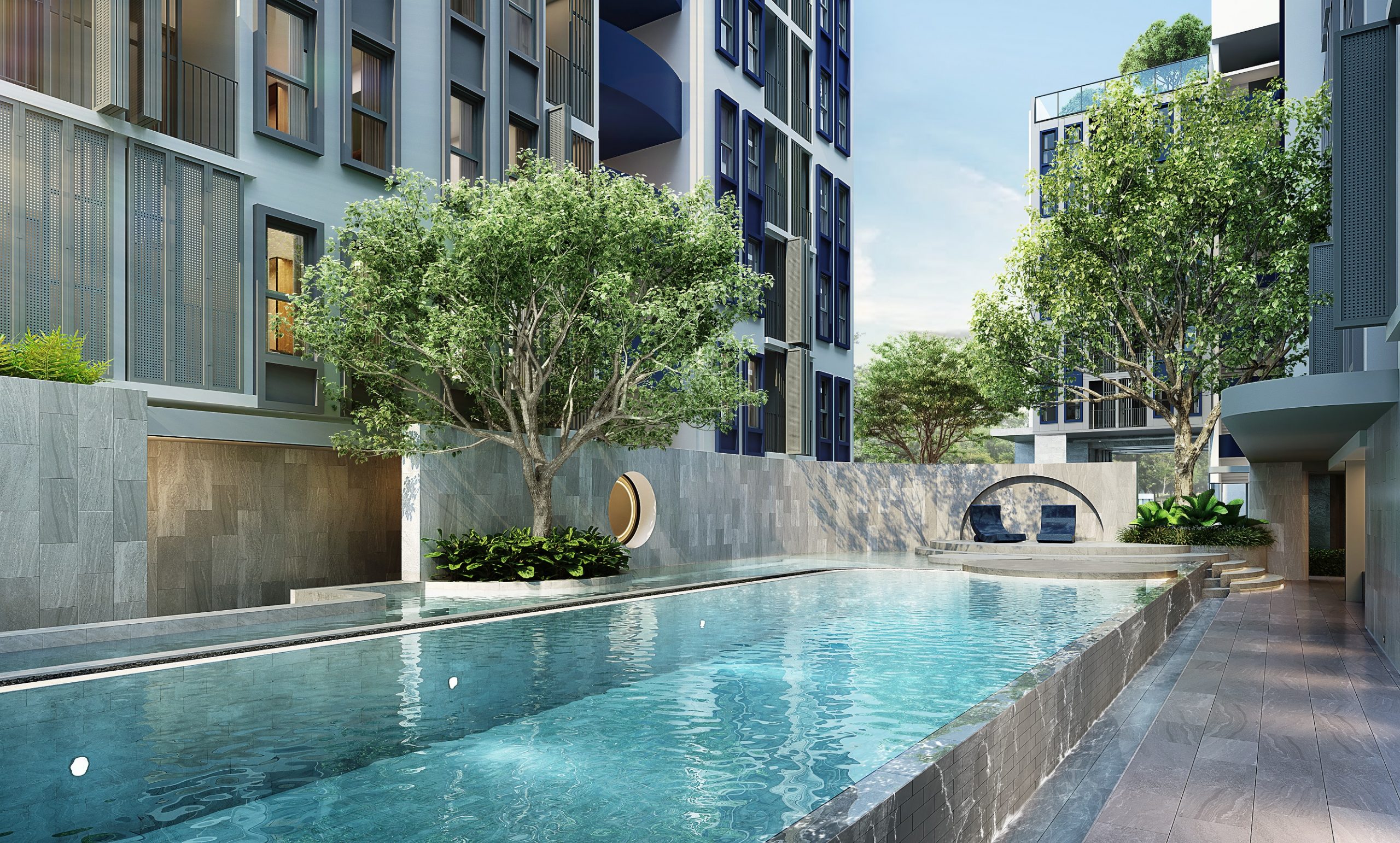 The Aqua สระว่ายน้ำระบบน้ำเกลือพร้อม Jacuzzi ยาวกว่า 35 เมตร ดีไซน์ให้เป็นคอร์ทยาร์ดแลนด์มาร์กของโครงการ และพื้นที่นั่งเล่นเชื่อมต่อริมสระน้ำ