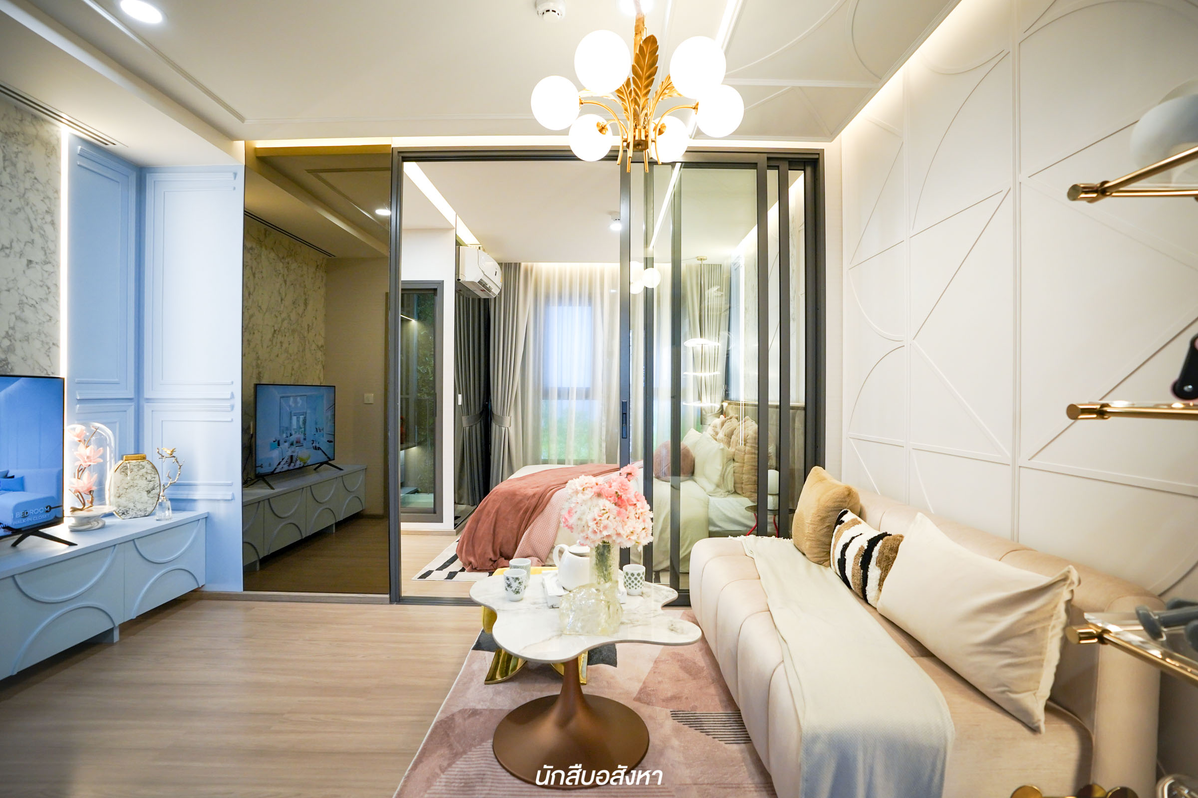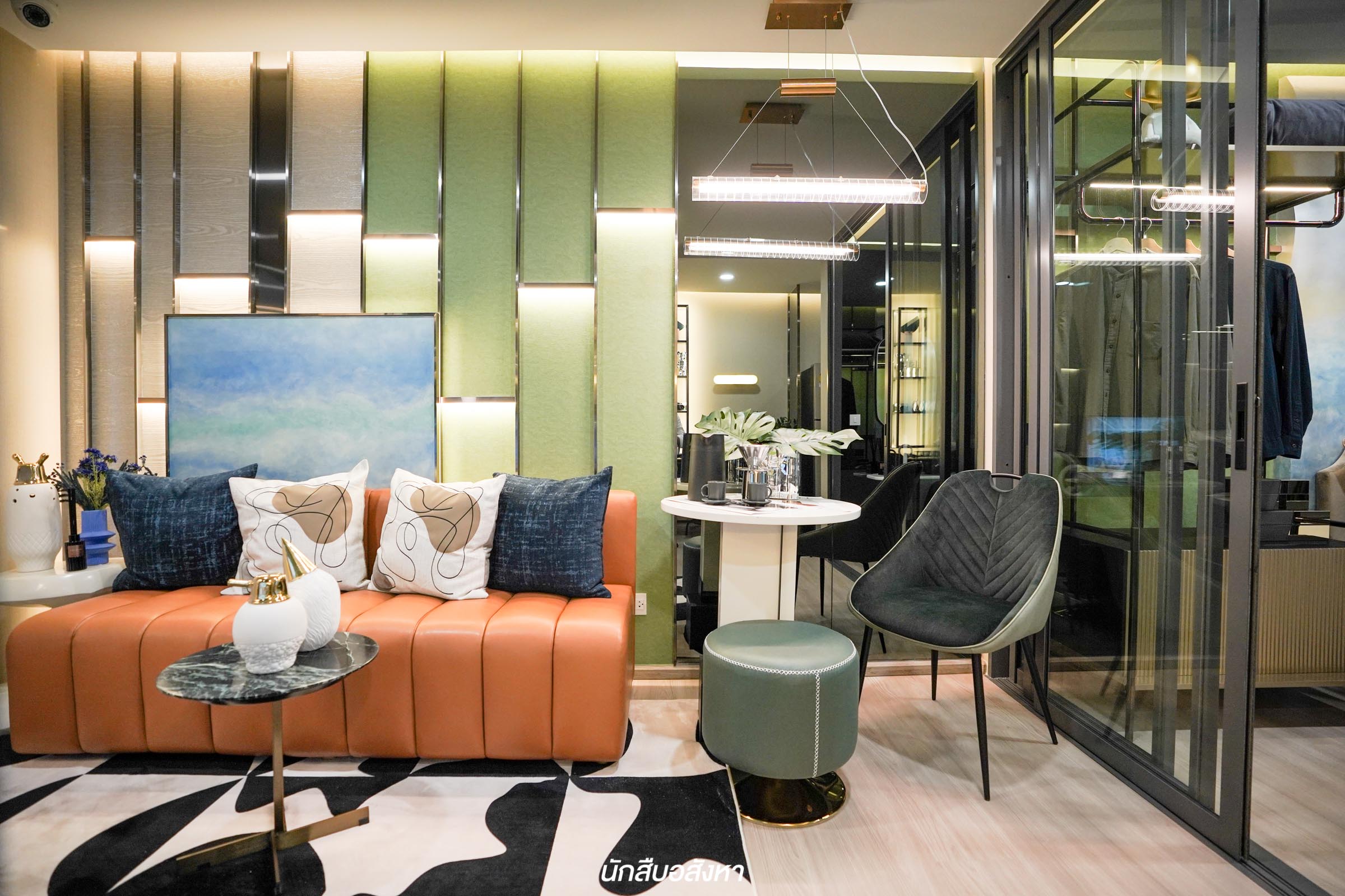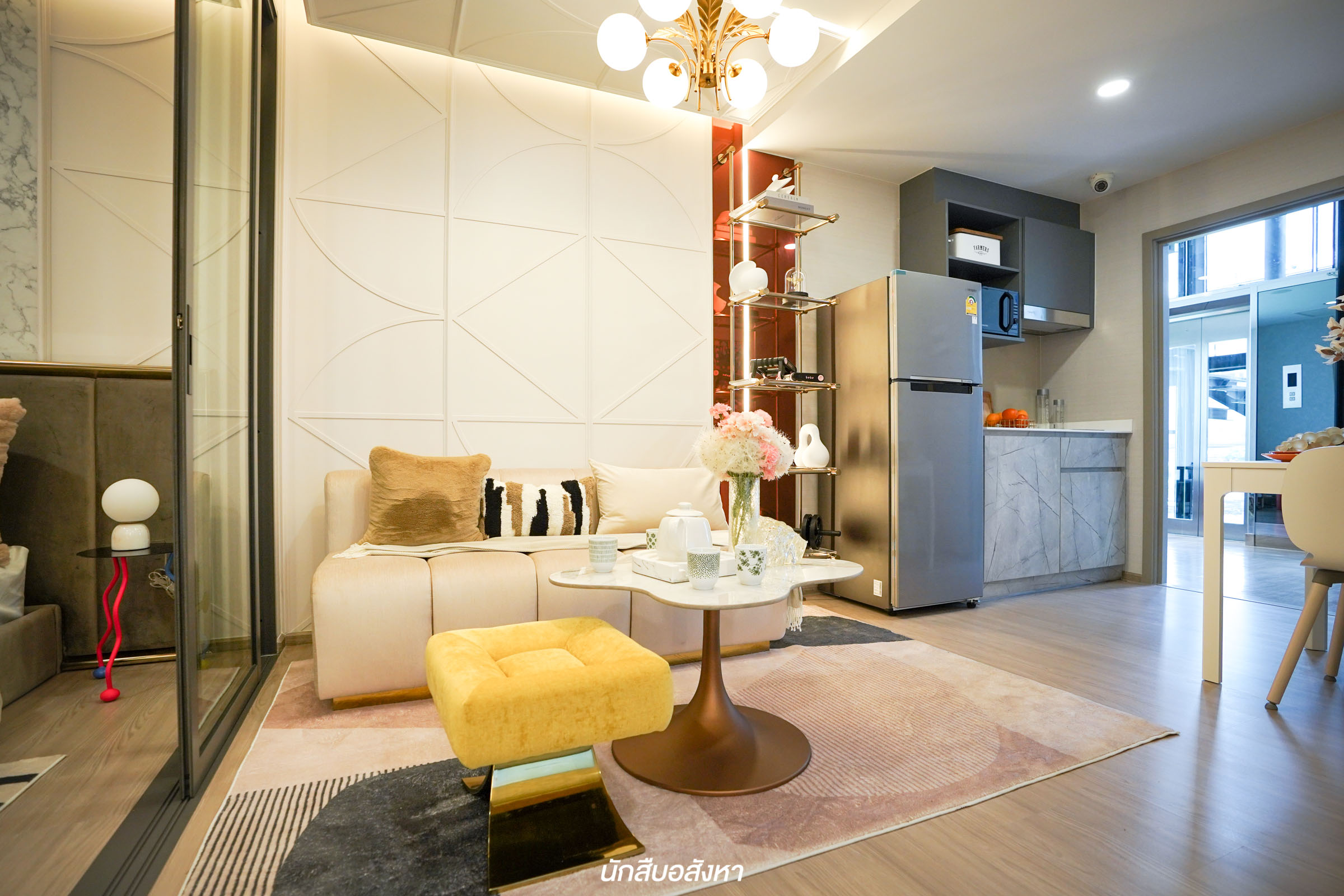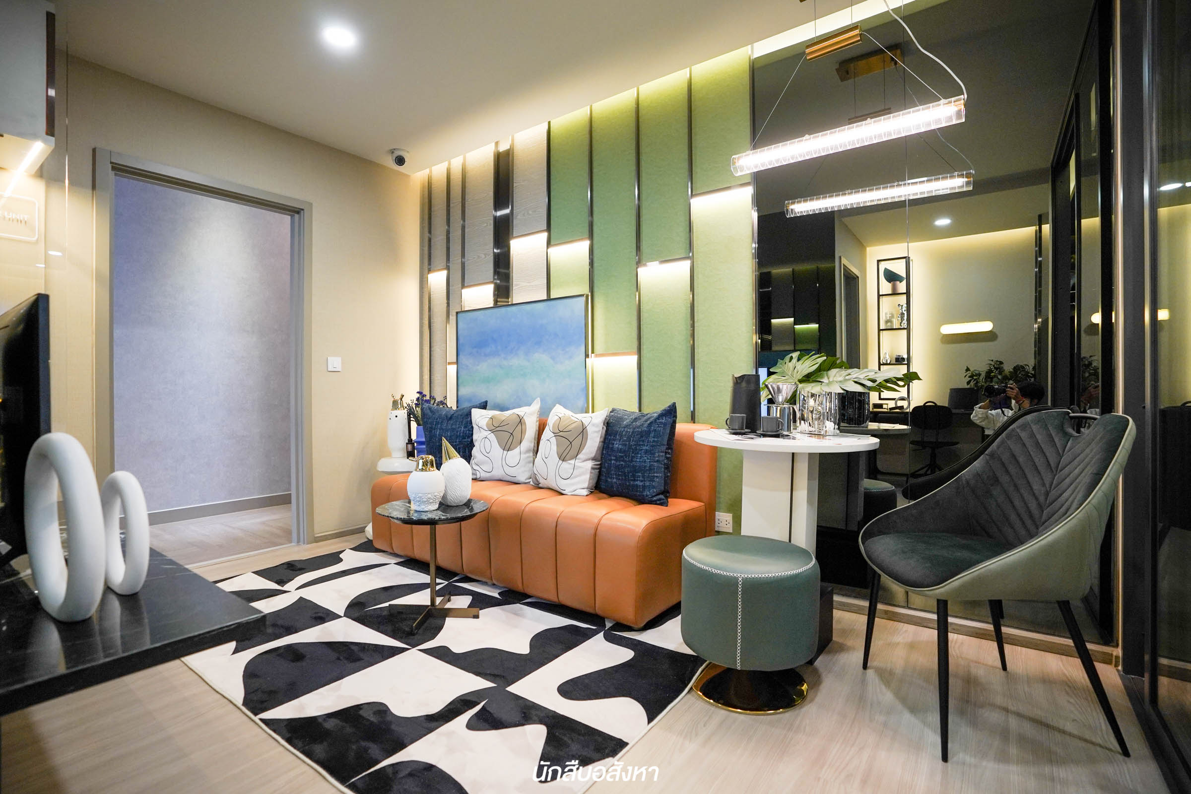 ถัดเข้ามาเป็น Living Area ขนาดกว้างสามารถวางโซฟาขนาด 2-3 ที่นั่ง, โต๊ะตัวกลาง, ชั้นวางทีวี อีกทั้งยังเหลือพื้นที่สำหรับวางเฟอร์นิเจอร์ หรือจัดเป็นมุม Live ขายของ Online เรียกว่าลงตัวทุกไลฟ์สไตล์คนรุ่นใหม่เลยครับ