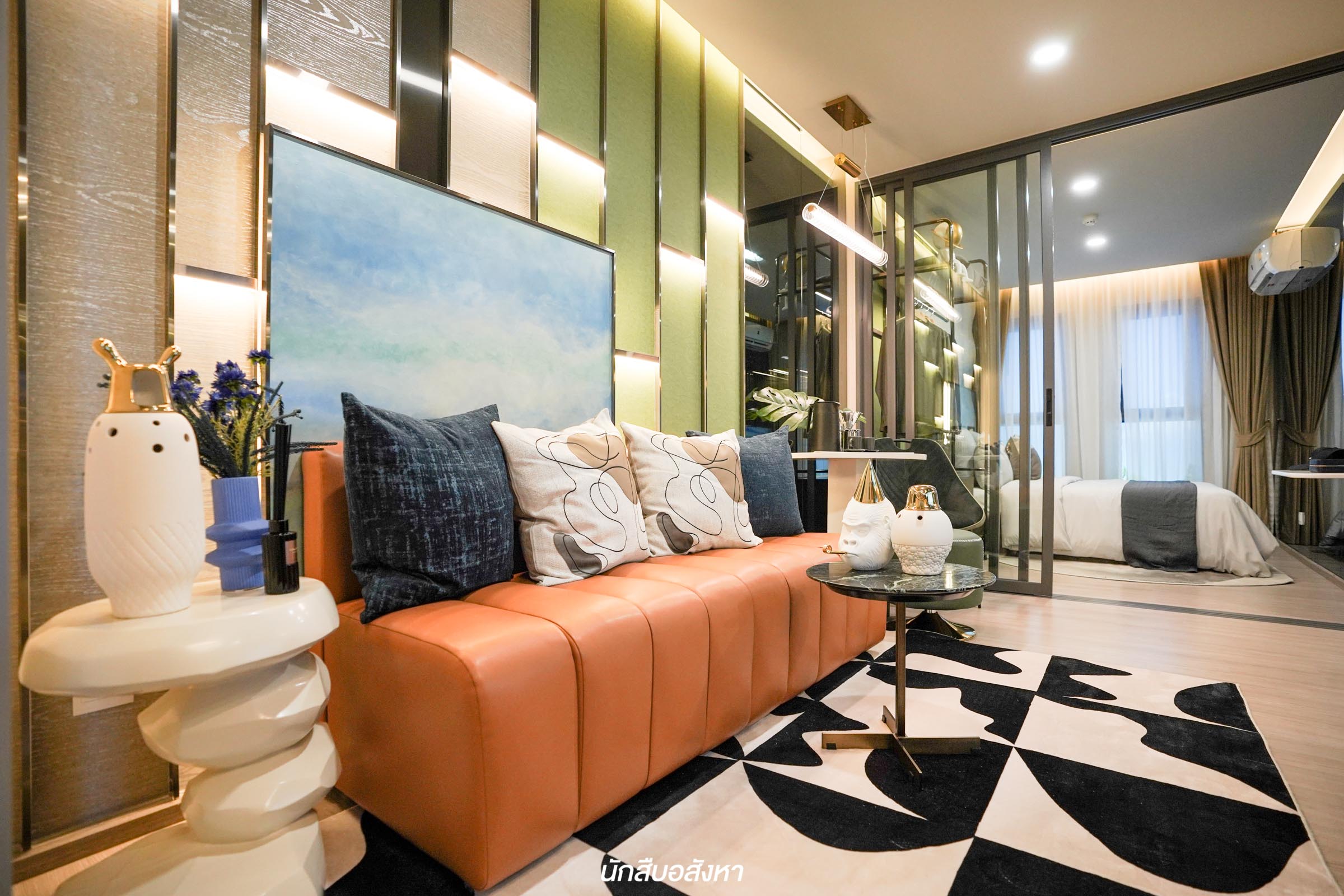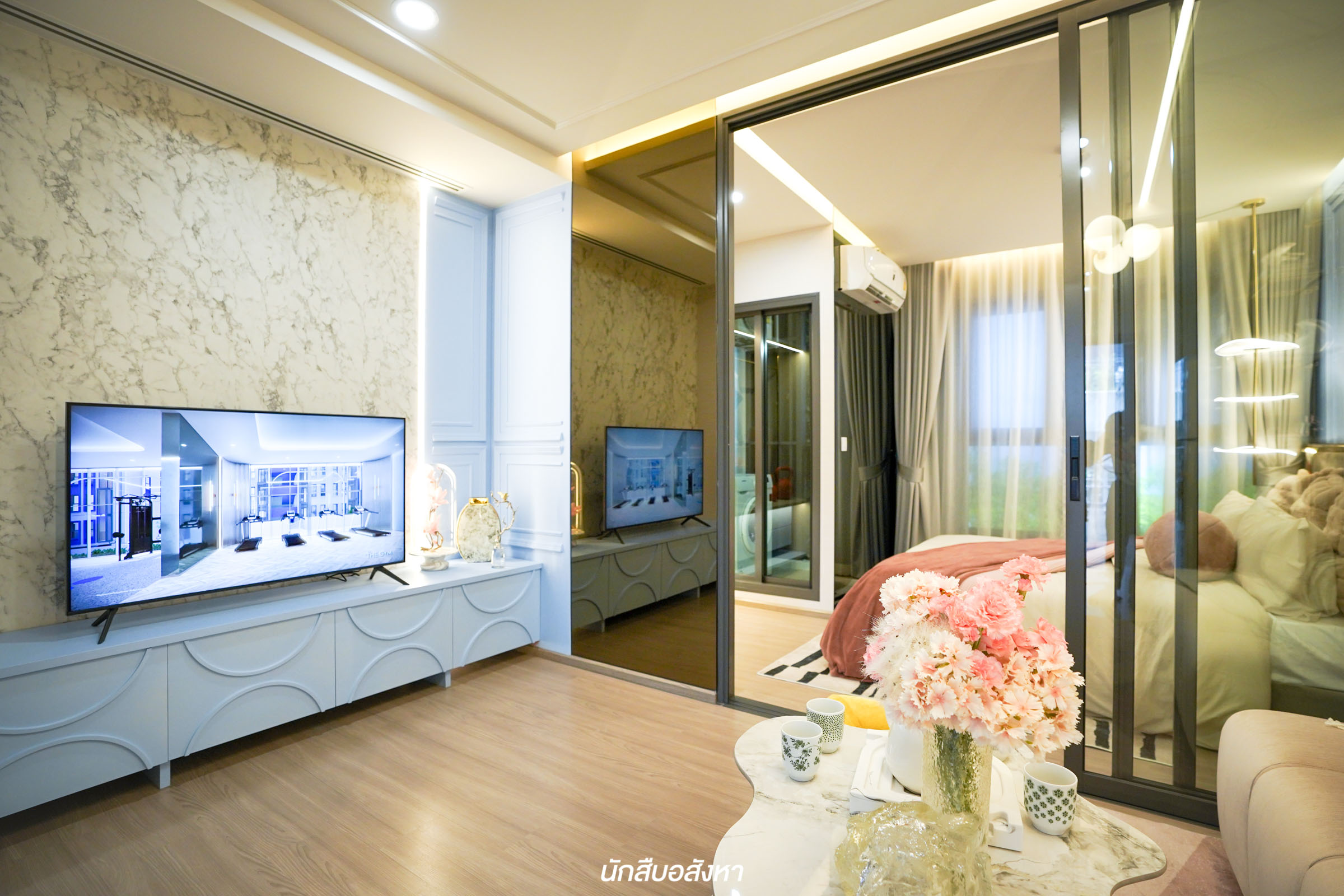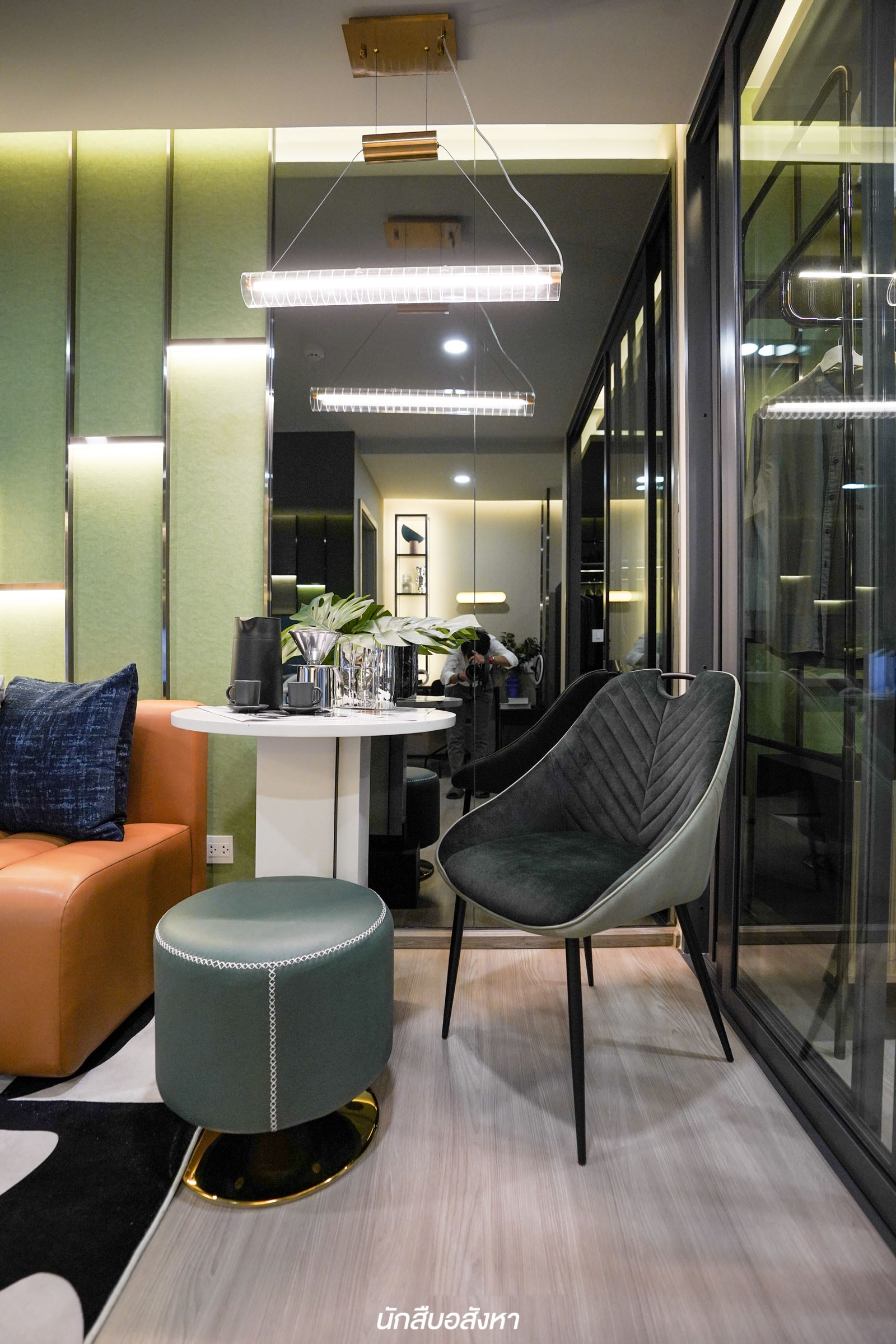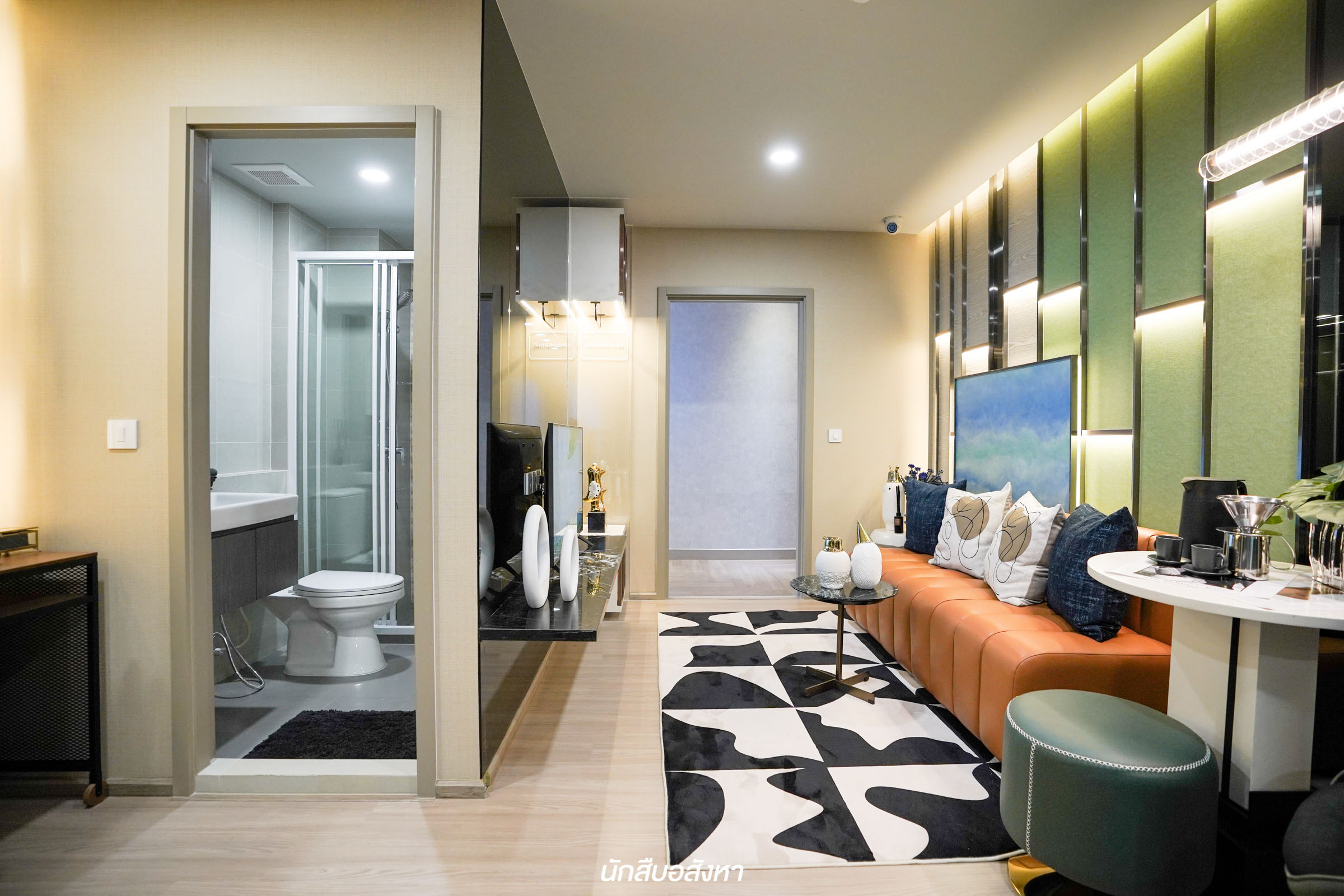ถัดเข้ามาเป็น Living Area ขนาดกว้างสามารถวางโซฟาขนาด 2-3 ที่นั่ง, โต๊ะตัวกลาง, ชั้นวางทีวี อีกทั้งยังเหลือพื้นที่สำหรับวางเฟอร์นิเจอร์ หรือจัดเป็นมุม Live ขายของ Online เรียกว่าลงตัวทุกไลฟ์สไตล์คนรุ่นใหม่เลยครับ