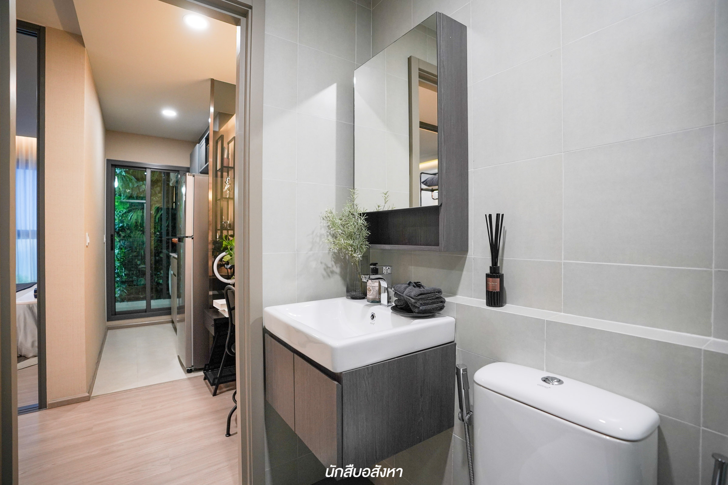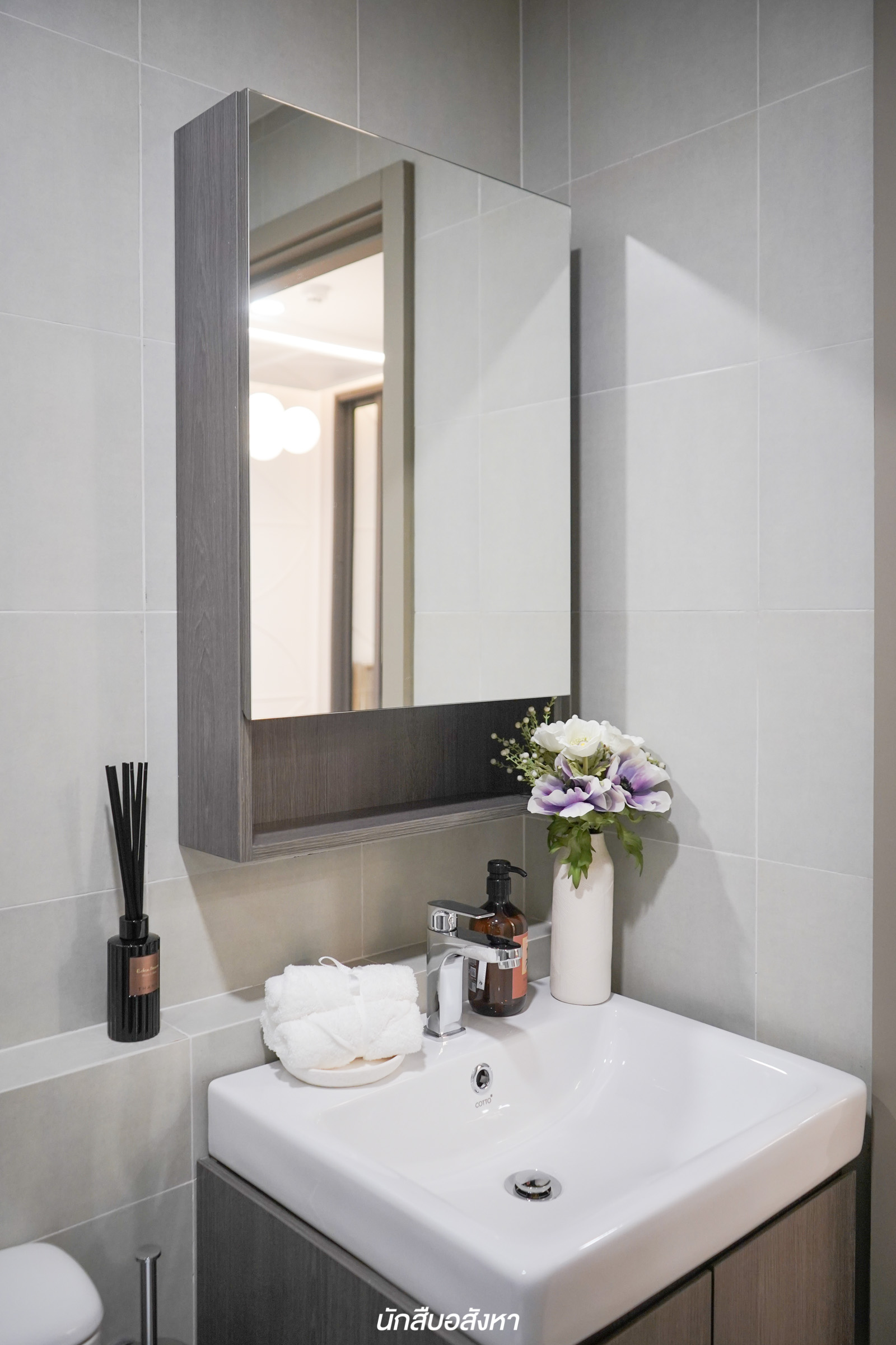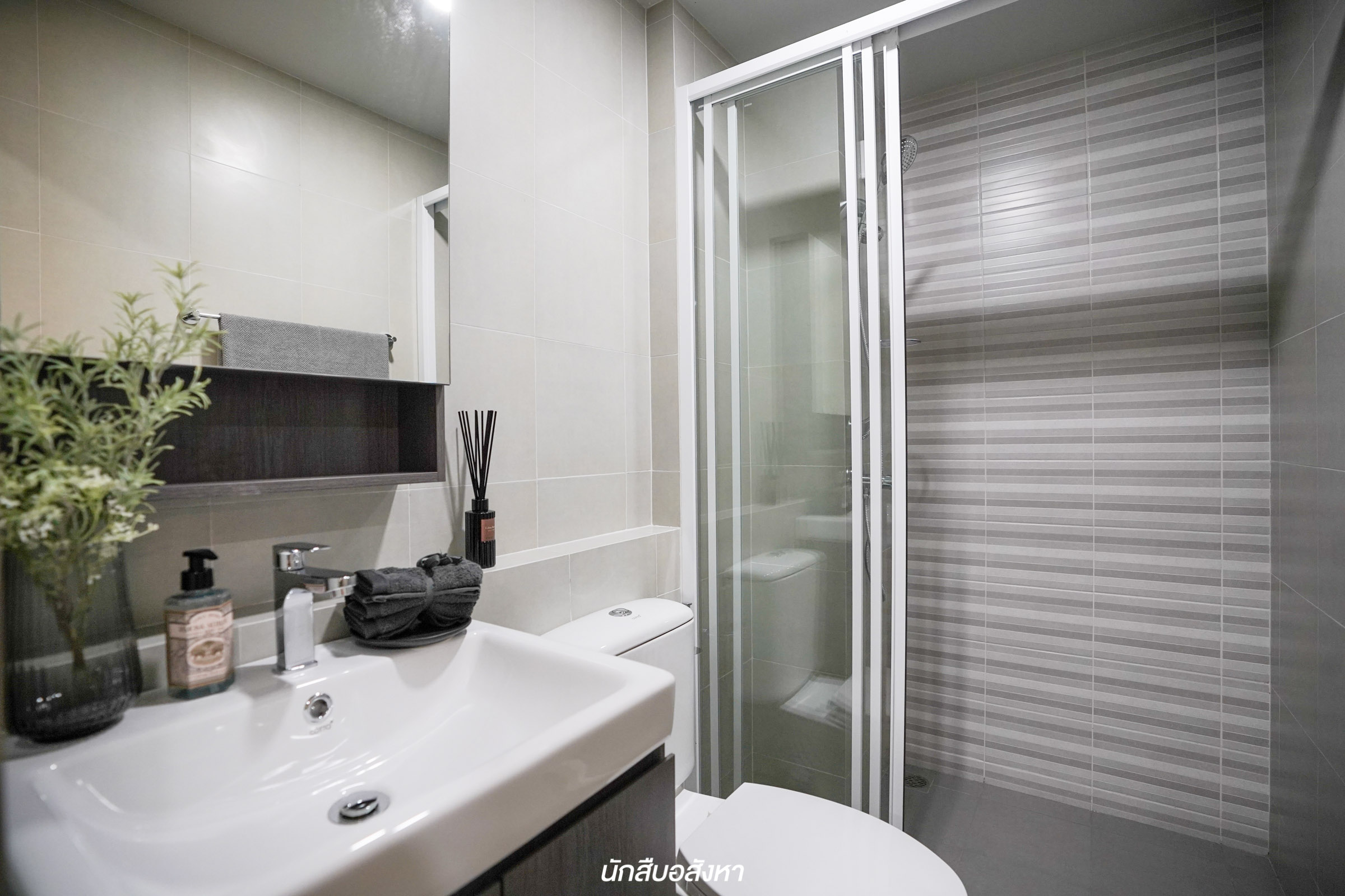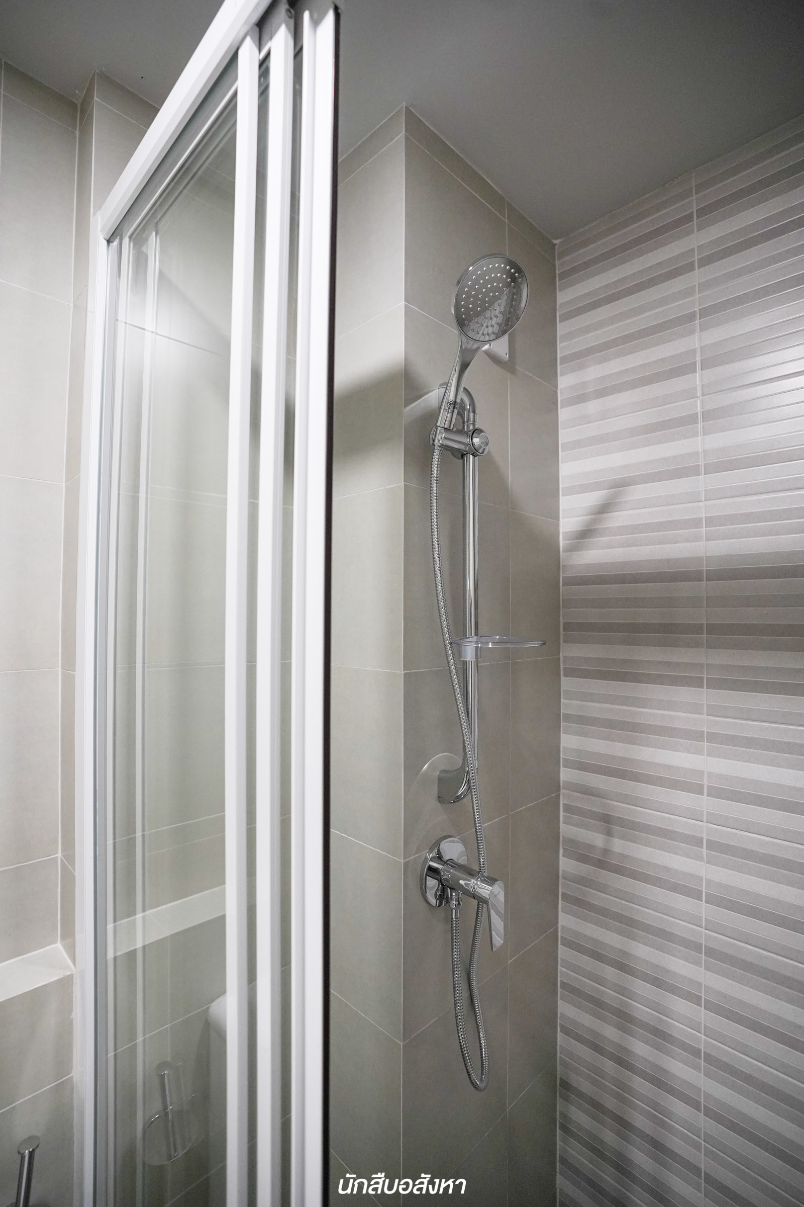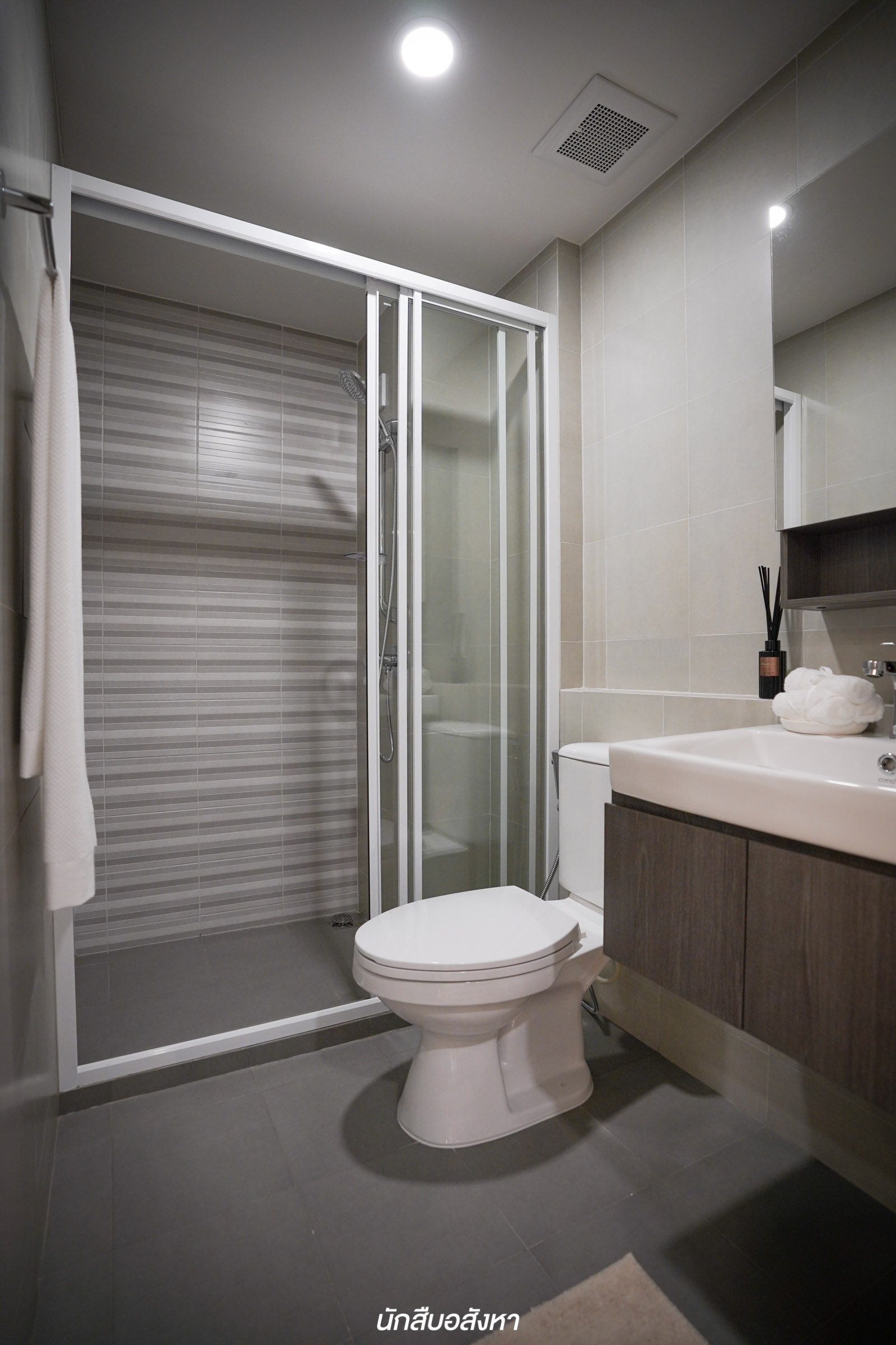 ห้องน้ำอยู่บริเวณโซนหน้าห้อง โดยภายในมีการแบ่งโซนแห้ง โซนเปียกอย่างเป็นสัดส่วน ด้วยกระจกกั้น ทำให้ใช้งานและทำความสะอาดได้อย่างสะดวก