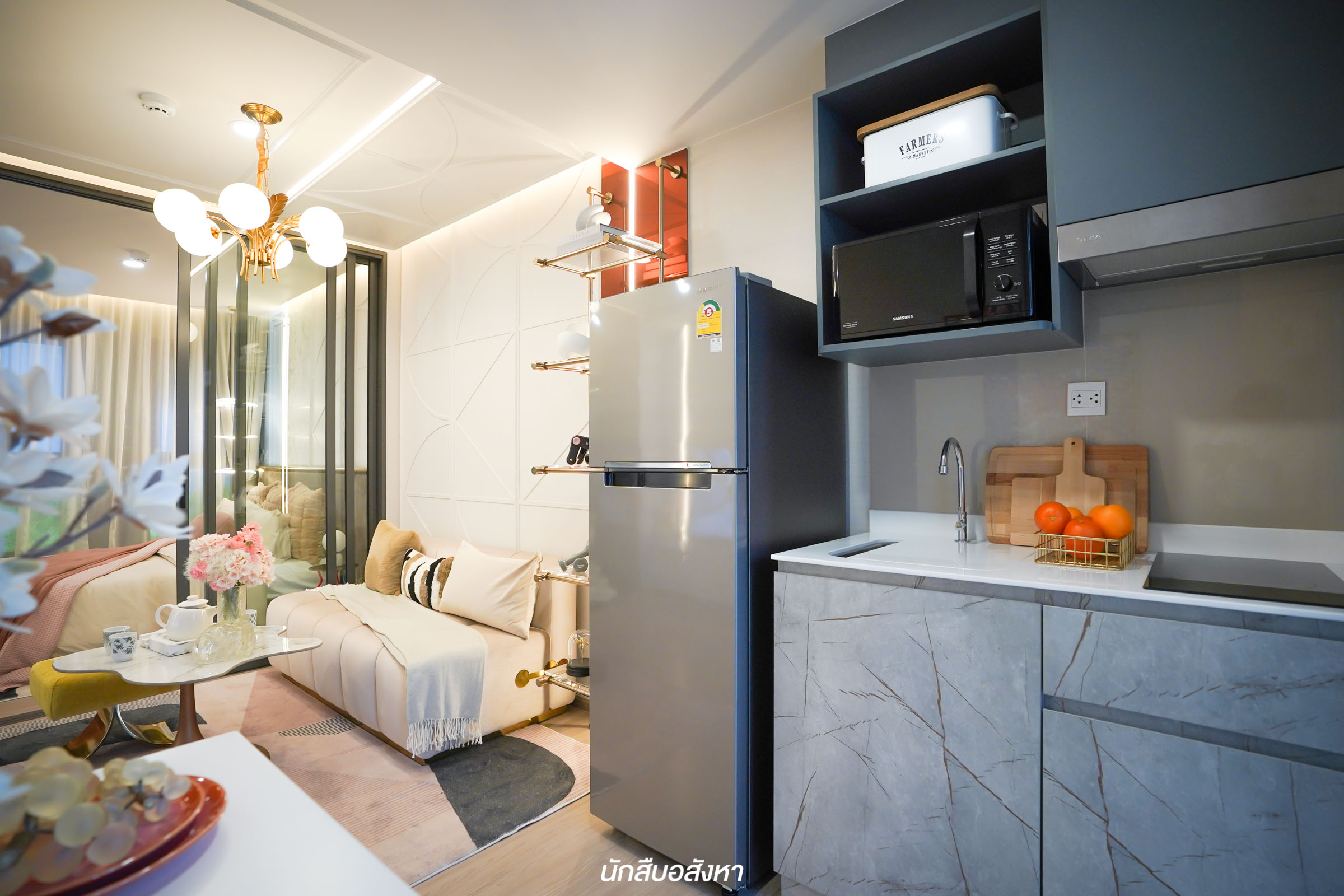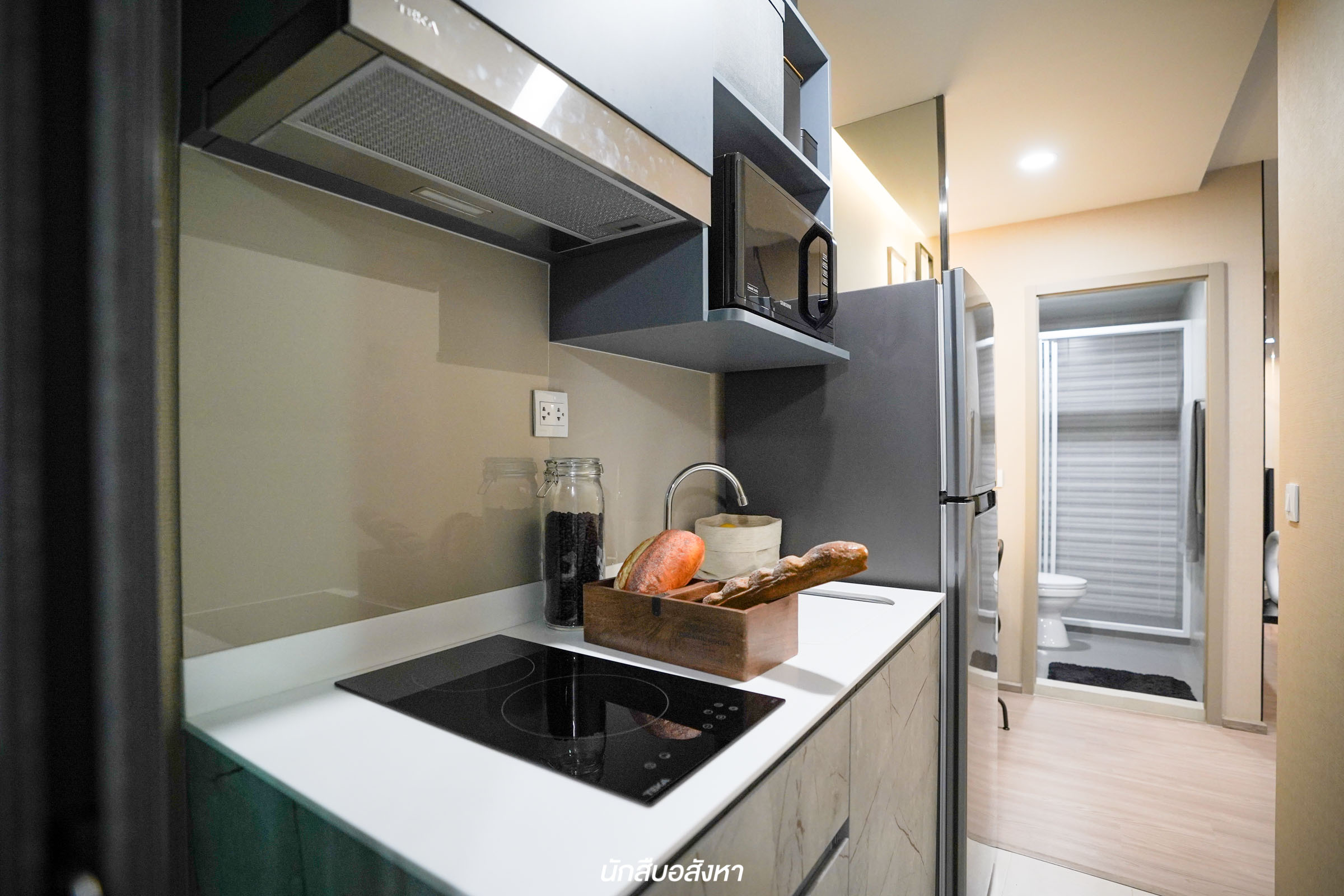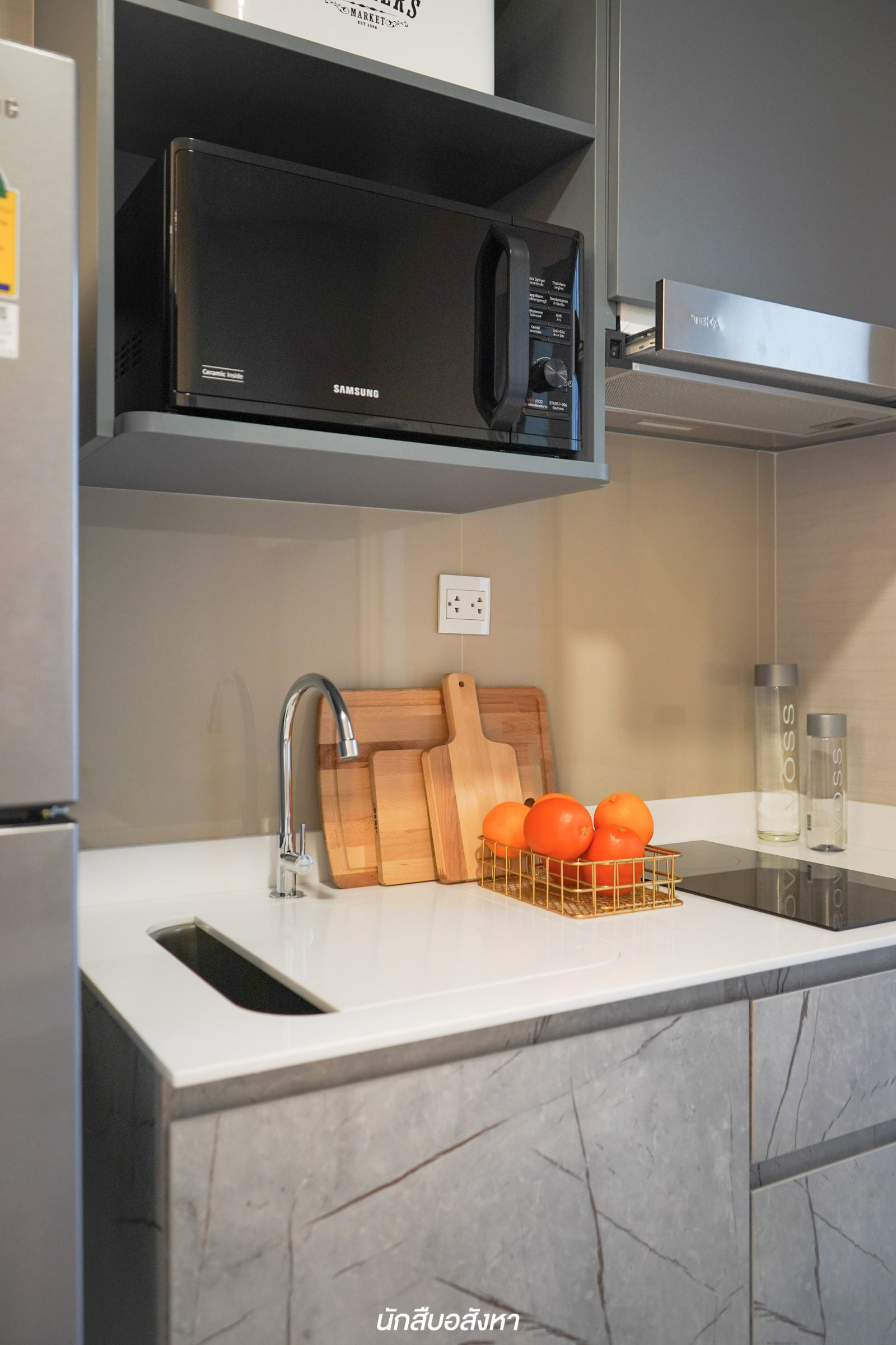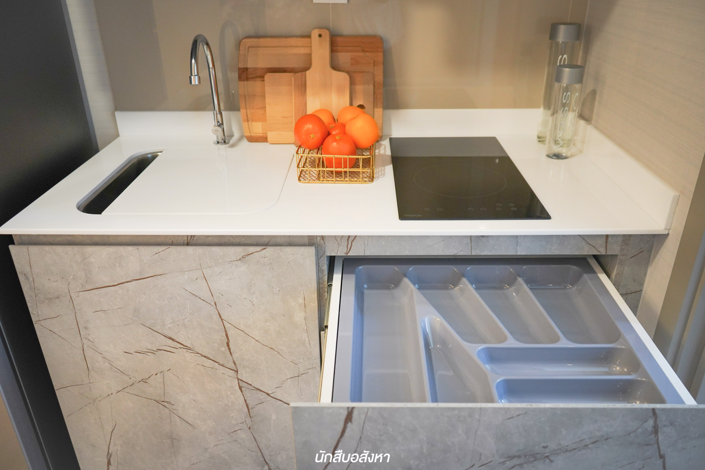 เมือเข้ามาพบกับพื้นที่โซนครัว โดยมีระยะการใช้งานได้อย่างสะดวก เหมาะสำหรับการทำอาหารมื้อเบาๆ หรือเวฟอาหารครับ อีกทั้งทางโครงการให้ชุดครัวมาพร้อม ไม่ว่าจะเป็น เคาน์เตอร์, ที่เก็บของด้านบน และ Hood & Hob ครับ