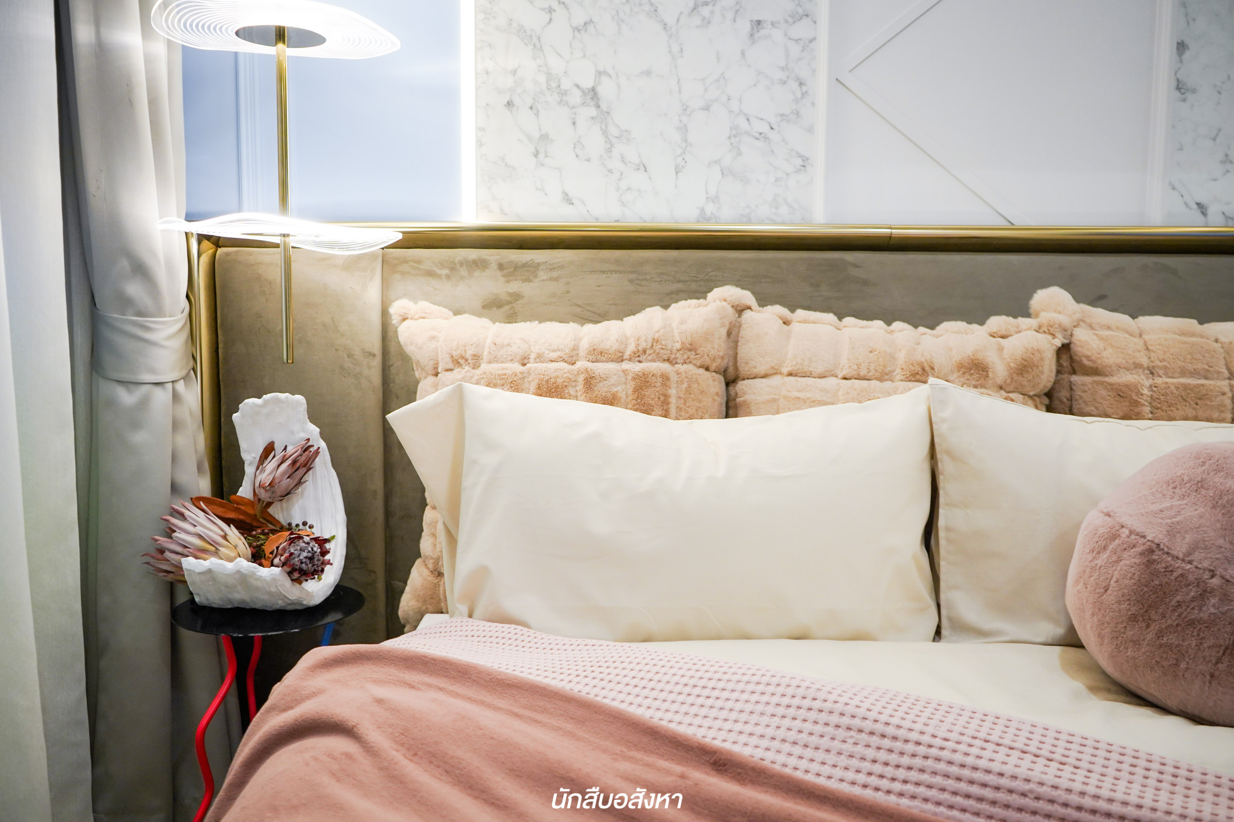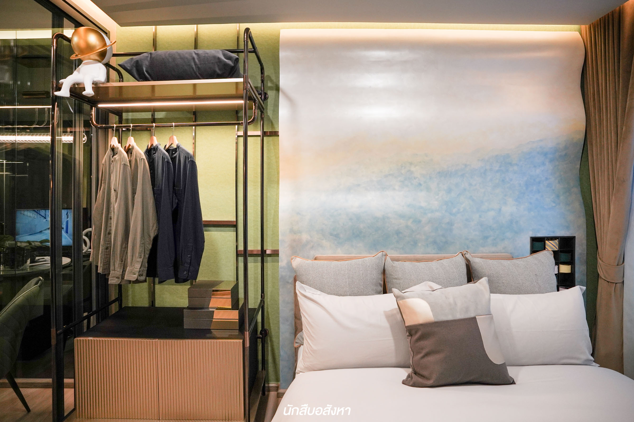 พื้นที่ปลายเตียง สามารถวางตู้เสื้อผ้าจัดเป็นมุม Walk-in closet ได้ครับ