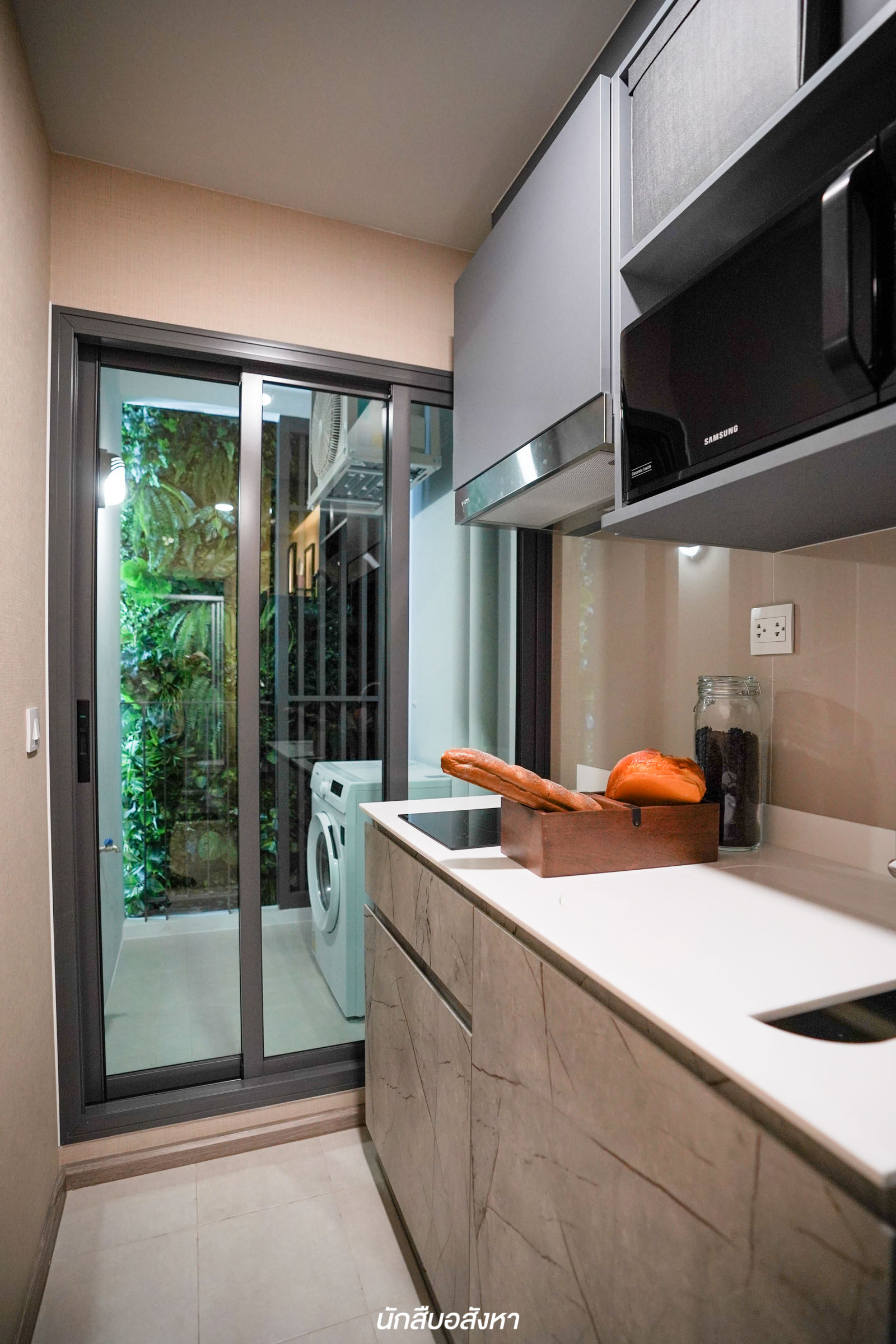 สำหรับห้องนี้ผมชอบตรงห้องครัวที่เชื่อมต่อกับระเบียงครับ สามารถเปิดประตูเพื่อถ่ายเทอากาศหรือระบายกลิ่นออกไปทางระเบียงได้เลย โดยทางโครงการให้ชุดครัว ทั้ง เคาน์เตอร์ พร้อมที่เก็บของด้านบน, Hood & Hob และอ่างล้างจานครับ