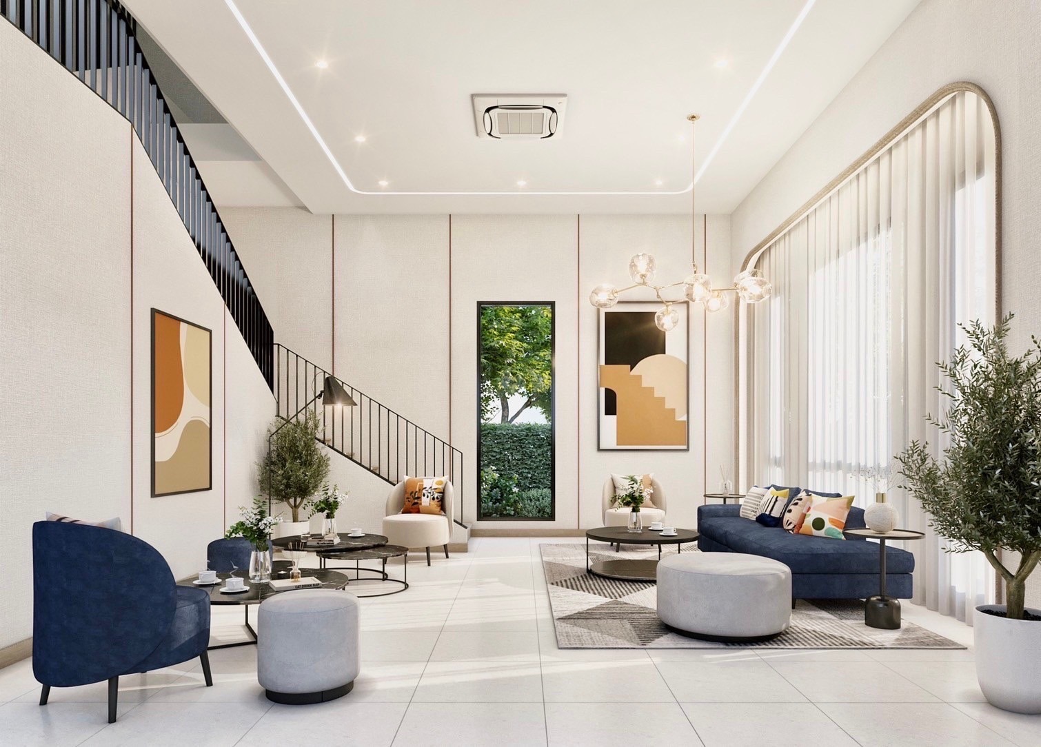 Co-Living Space : ส่วนที่ถัดเข้าไปในอาคารมุมแรกจะพบกับ Co-Living Space แบบ Double Volume ให้ความโปร่งสบาย และความหรูหรา มุมนี้สามารถใช้เป็นที่รับรองแขกของครอบครัว ถ้าไม่ต้องการให้แขกเข้าไปในพื้นที่ส่วนตัว