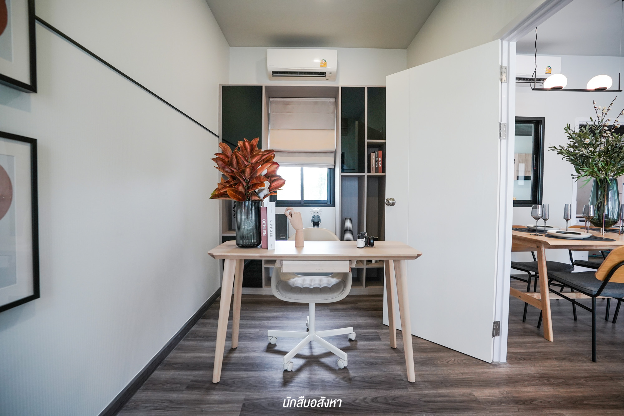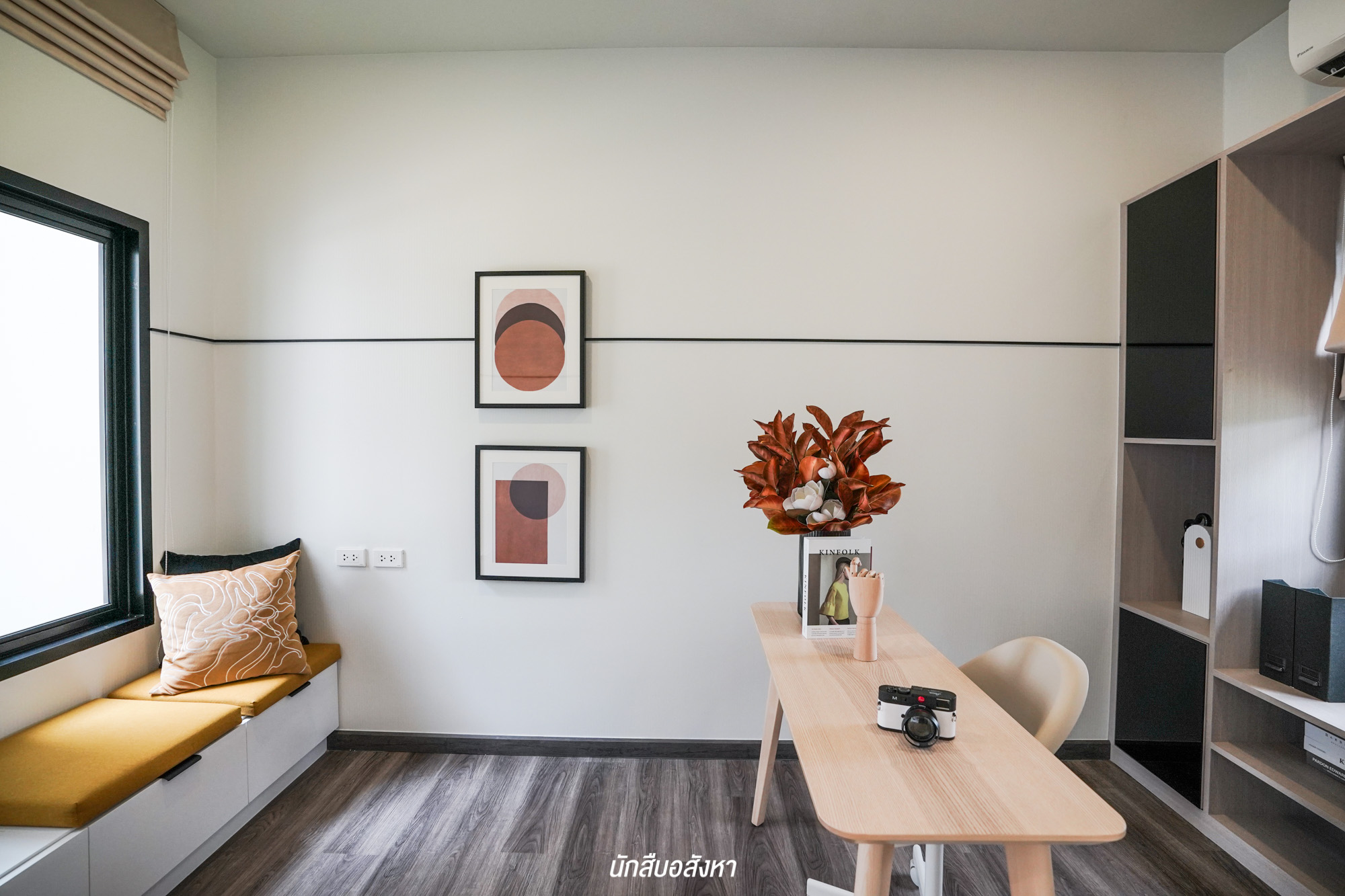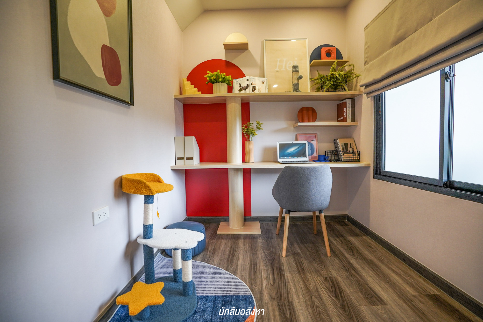 ถัดมาเป็นห้องอเนกประสงค์ โครงการตกแต่งเป็นห้องทำงาน ได้พื้นที่ที่เป็นแนวยาว มีหน้าต่าง 2 ฝั่ง หน้าบ้าน-หลังบ้าน ซึ่งจะช่วย Flow อากาศภายในห้องได้ดีขึ้น ขนาดของห้องยังเปลี่ยนเป็นห้องนอนผู้สูงอายุแทนก็ได้