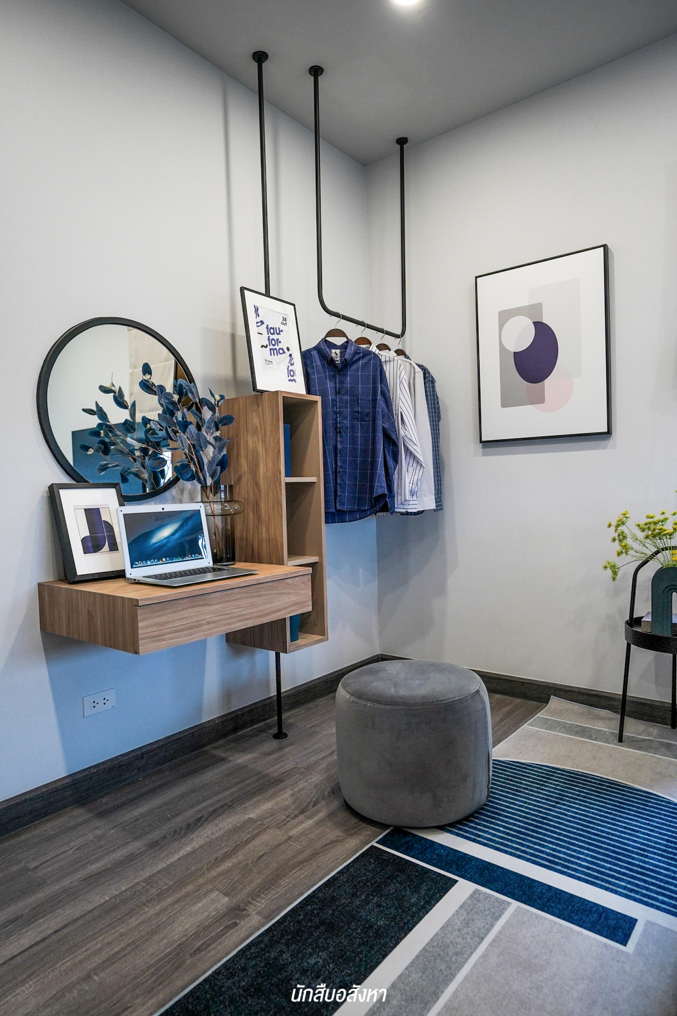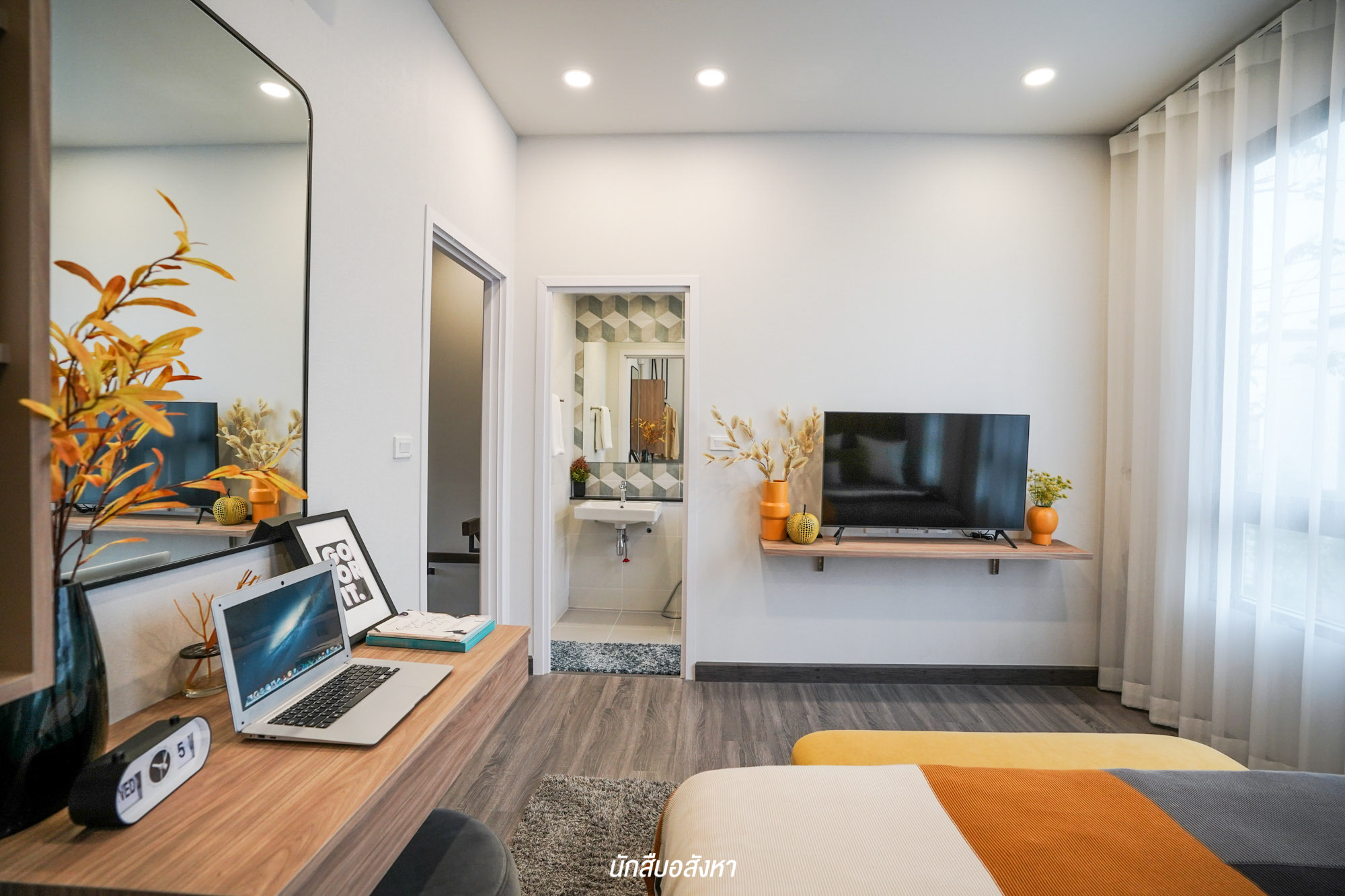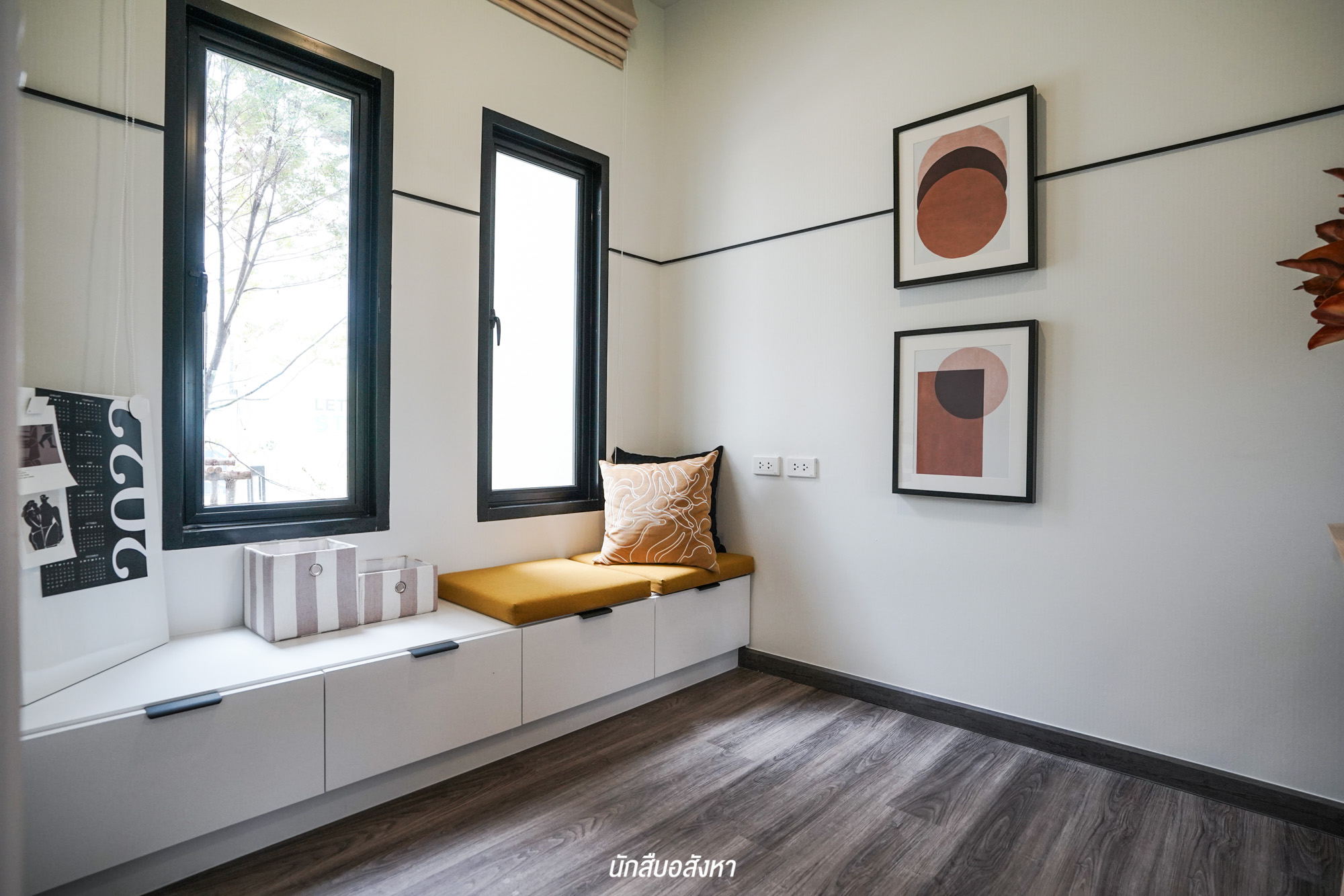 ถัดมาเป็นห้องอเนกประสงค์ โครงการตกแต่งเป็นห้องทำงาน ได้พื้นที่ที่เป็นแนวยาว มีหน้าต่าง 2 ฝั่ง หน้าบ้าน-หลังบ้าน ซึ่งจะช่วย Flow อากาศภายในห้องได้ดีขึ้น ขนาดของห้องยังเปลี่ยนเป็นห้องนอนผู้สูงอายุแทนก็ได้