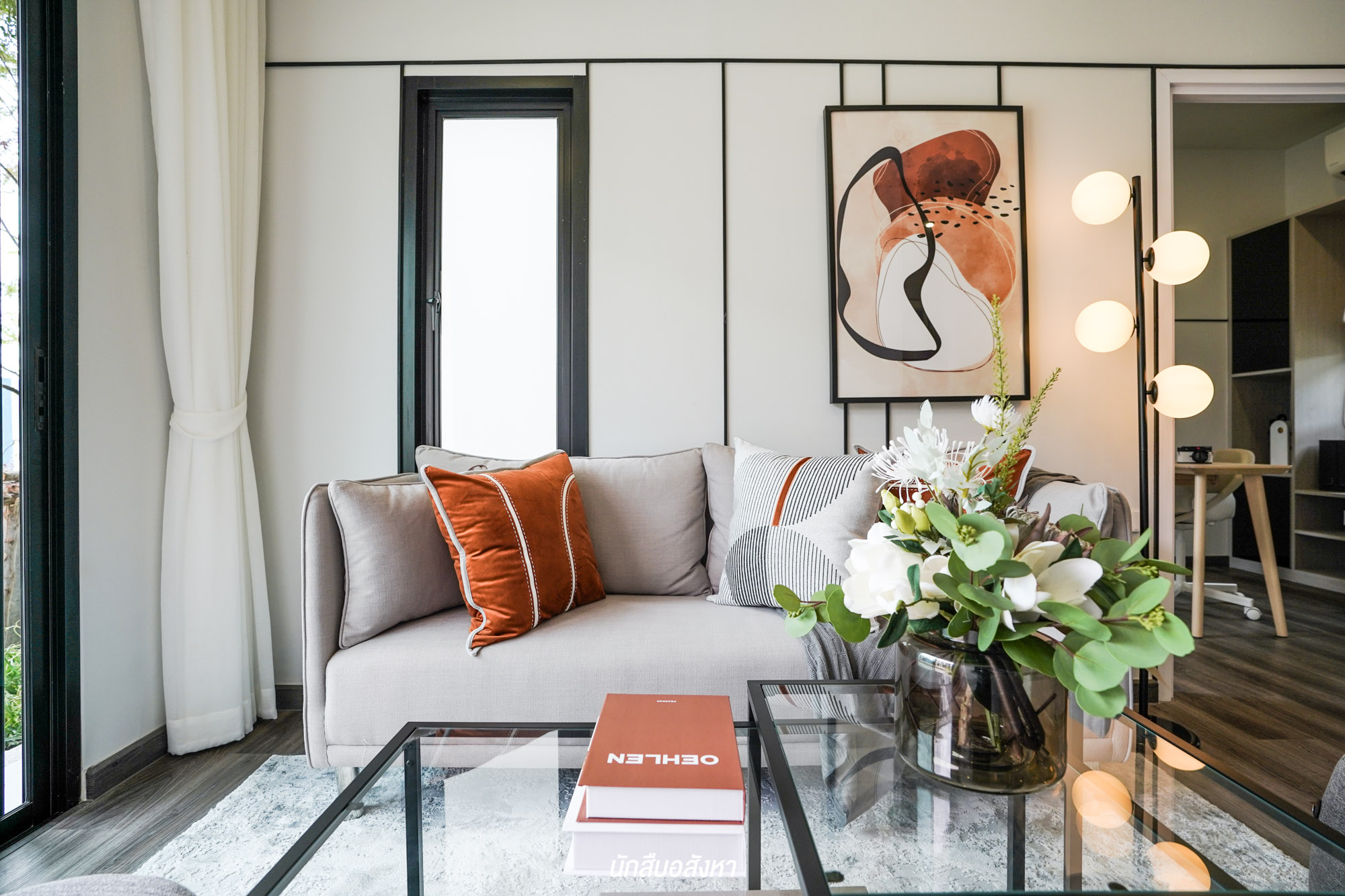 สำหรับมุมแรกโครงการเขาจัดวางโซฟาขนาด 2 ที่นั่งและโต๊ะกลาง 1 ตัว ติดตั้งทีวีที่ผนังในระยะที่พอดี เว้นทางเดินผ่านได้สะดวก