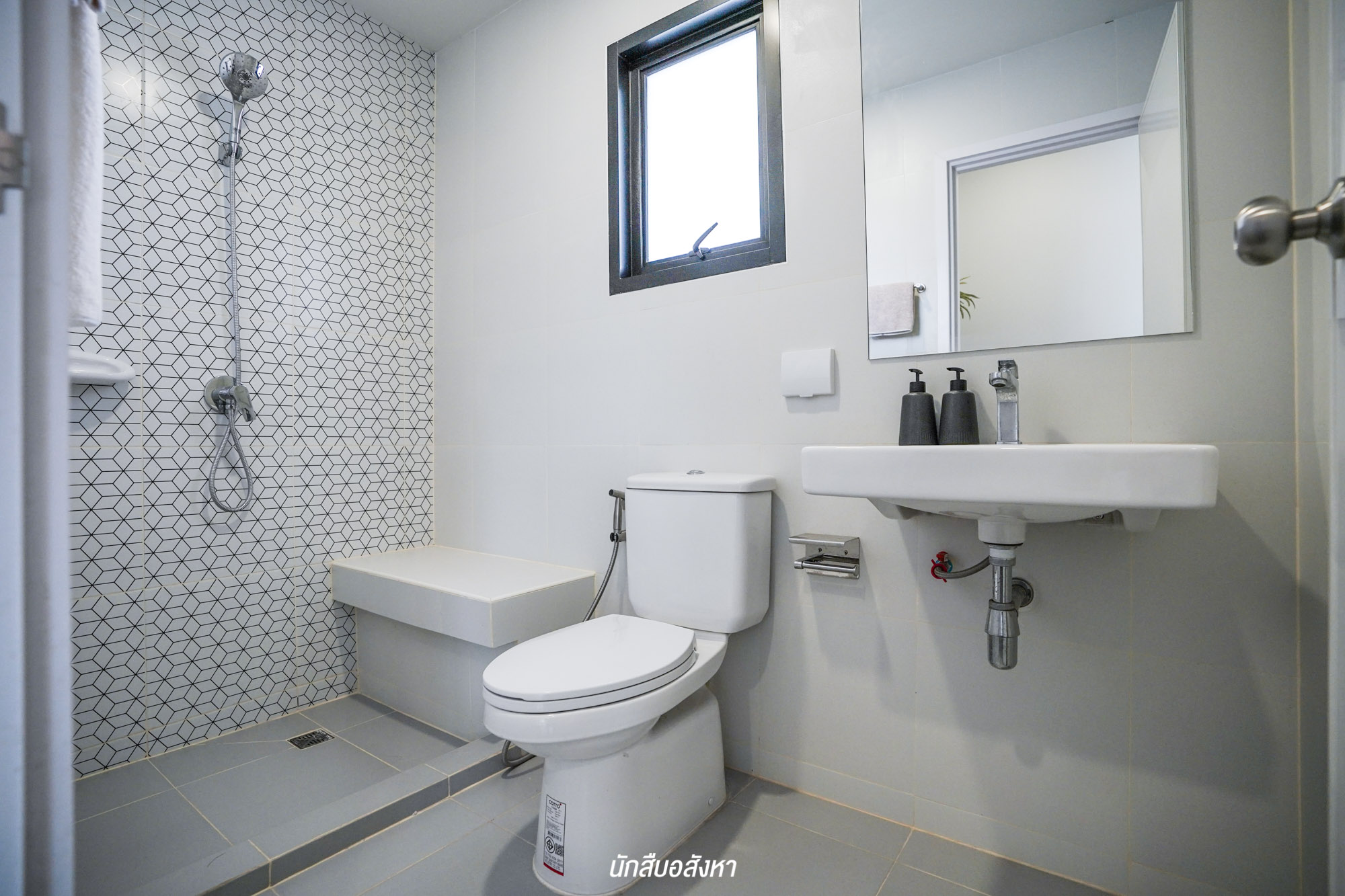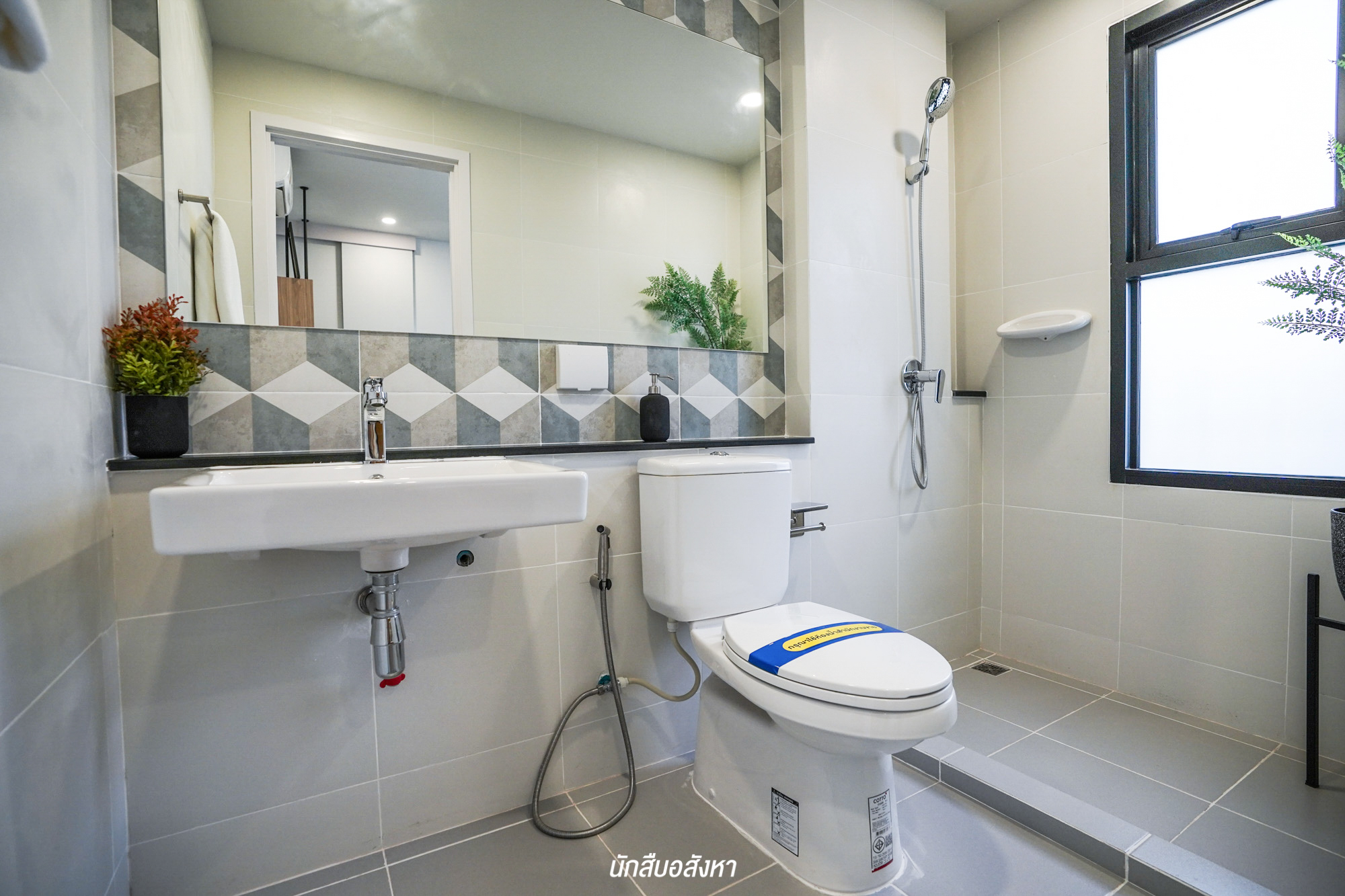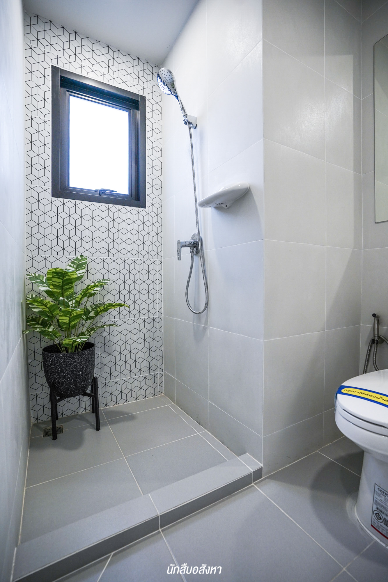 สำหรับห้องน้ำภายในห้องนอน ถ้าสังเกตดีๆ จะเห็นว่าทั้ง 2 ห้องน้ำชั้นบนจะวางแปลนให้อยู่ติดกำแพงบ้าน ทำให้สามารถเพิ่มช่องแสง และโครงการใช้กรอบหน้าต่างที่เปิดได้บางส่วน นอกจากจะช่วยดึงแสงเข้าห้องน้ำยังเปิดให้อากาศถ่ายเทด้วย และผมมองว่าฟังก์ชันนี้ค่อนข้างสำคัญมาก เพราะหากใช้งานไปนานๆ เป็นไปได้ว่าห้องน้ำจะเกิดการอับชื้นได้ ฟังก์ชันนี้จึงเข้ามาแก้ปัญหาตรงนี้ไปได้ครับ