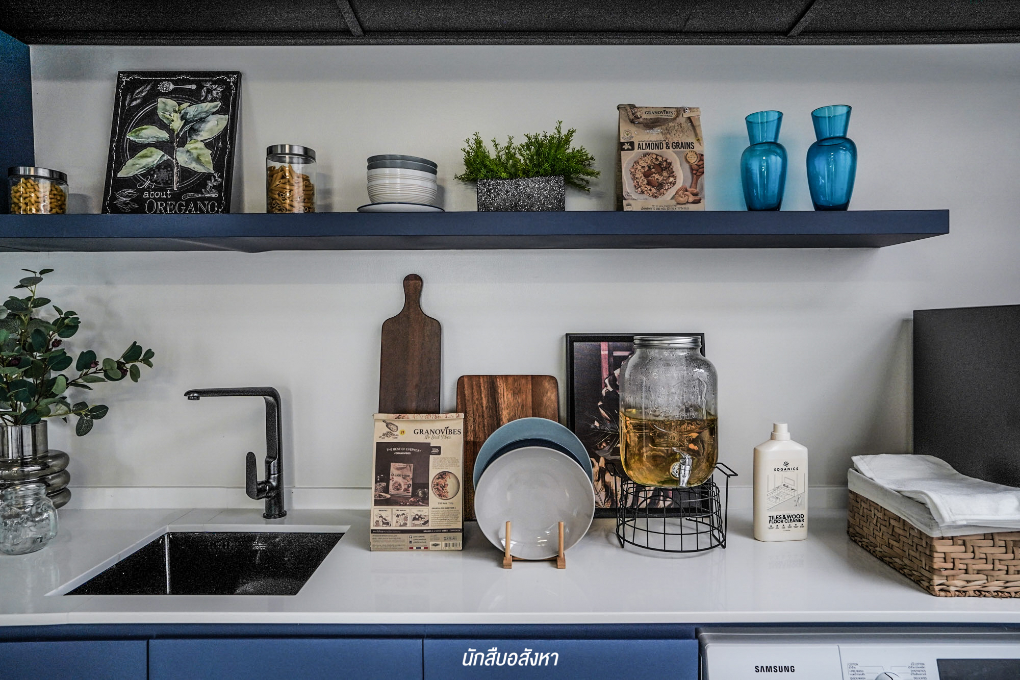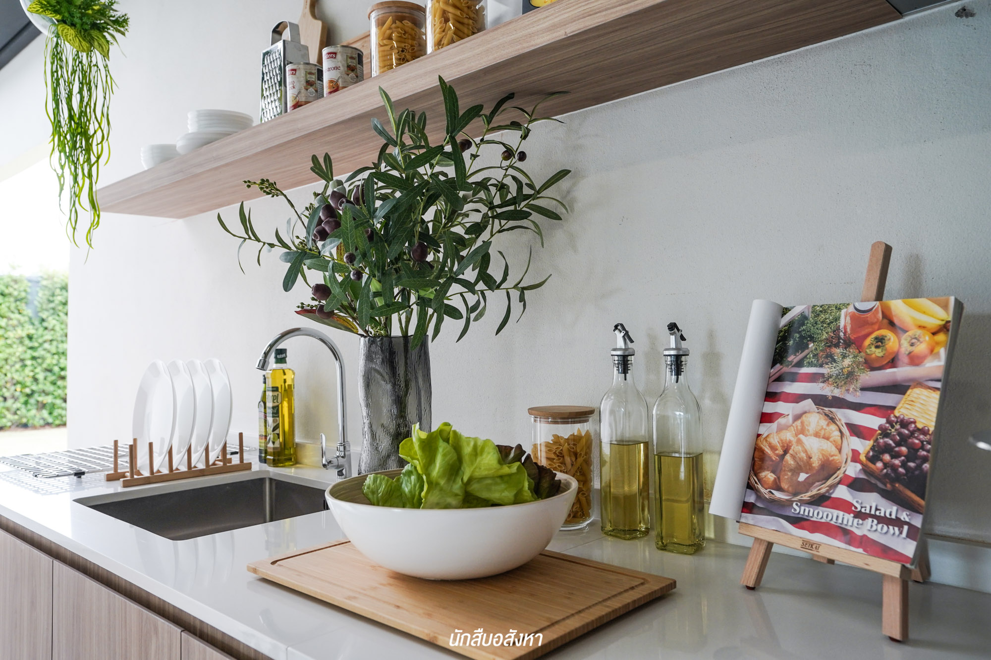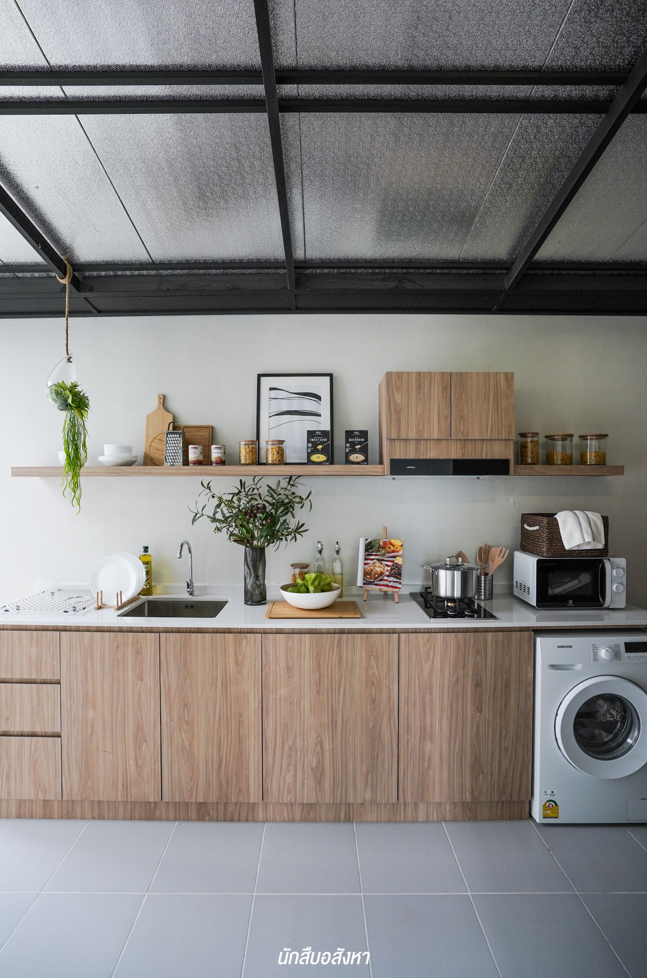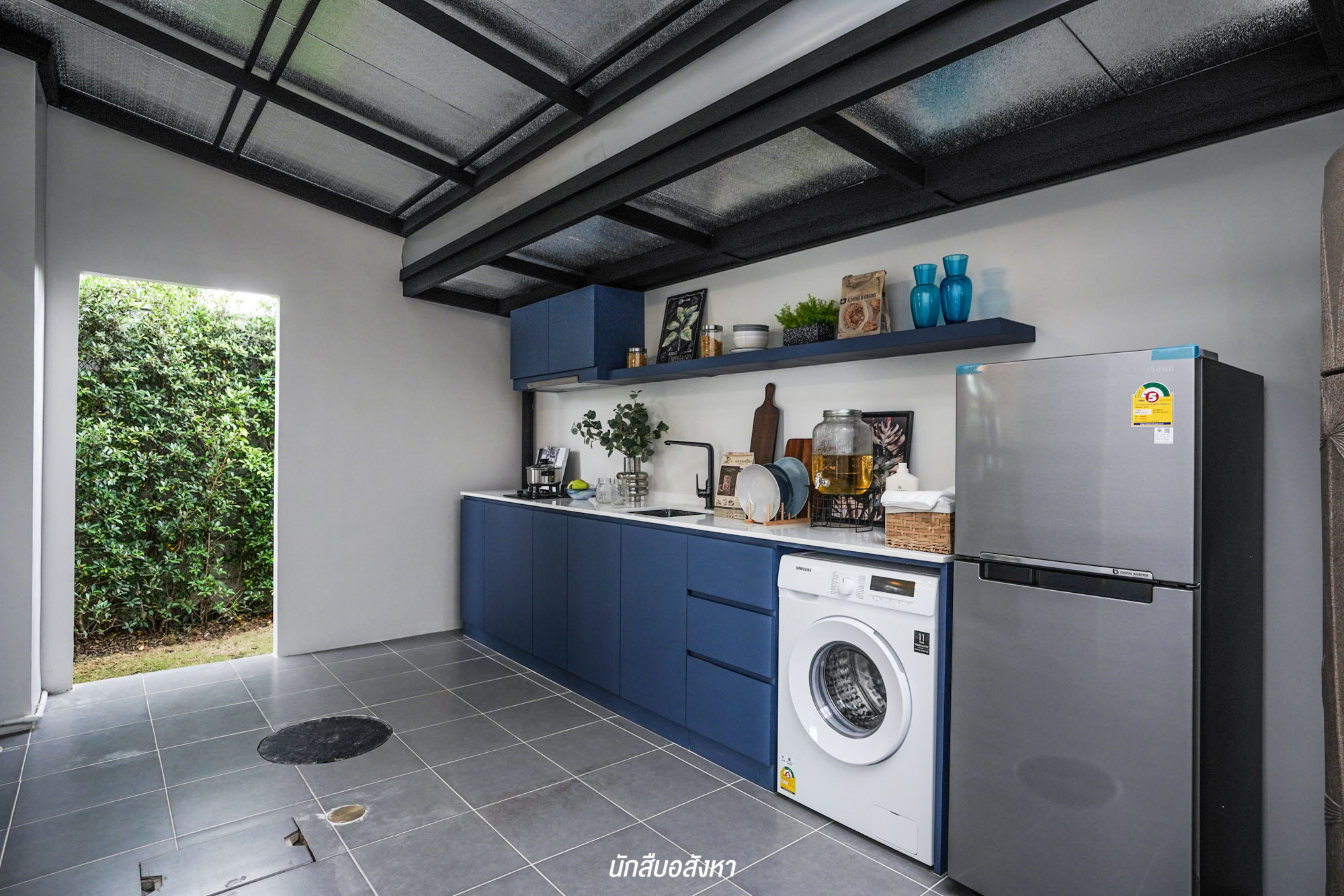 ต่อที่ห้องครัว แน่นอนว่าพื้นที่ครัวมีความกว้างกว่า ได้ความยาวถึง 8 เมตร ส่วนฟังก์ชันอื่นได้เหมือนกัน ไม่ว่าจะเป็นลงเสาเข็มเท่าตัวบ้าน 21 เมตร หรือกำแพงสูง 2.5 เมตร เพิ่มความโปร่งให้ห้องครัว เหมาะกับคนชอบทำอาหาร หรือแบ่งทำ Laundry Area ก็สะดวกดีครับ