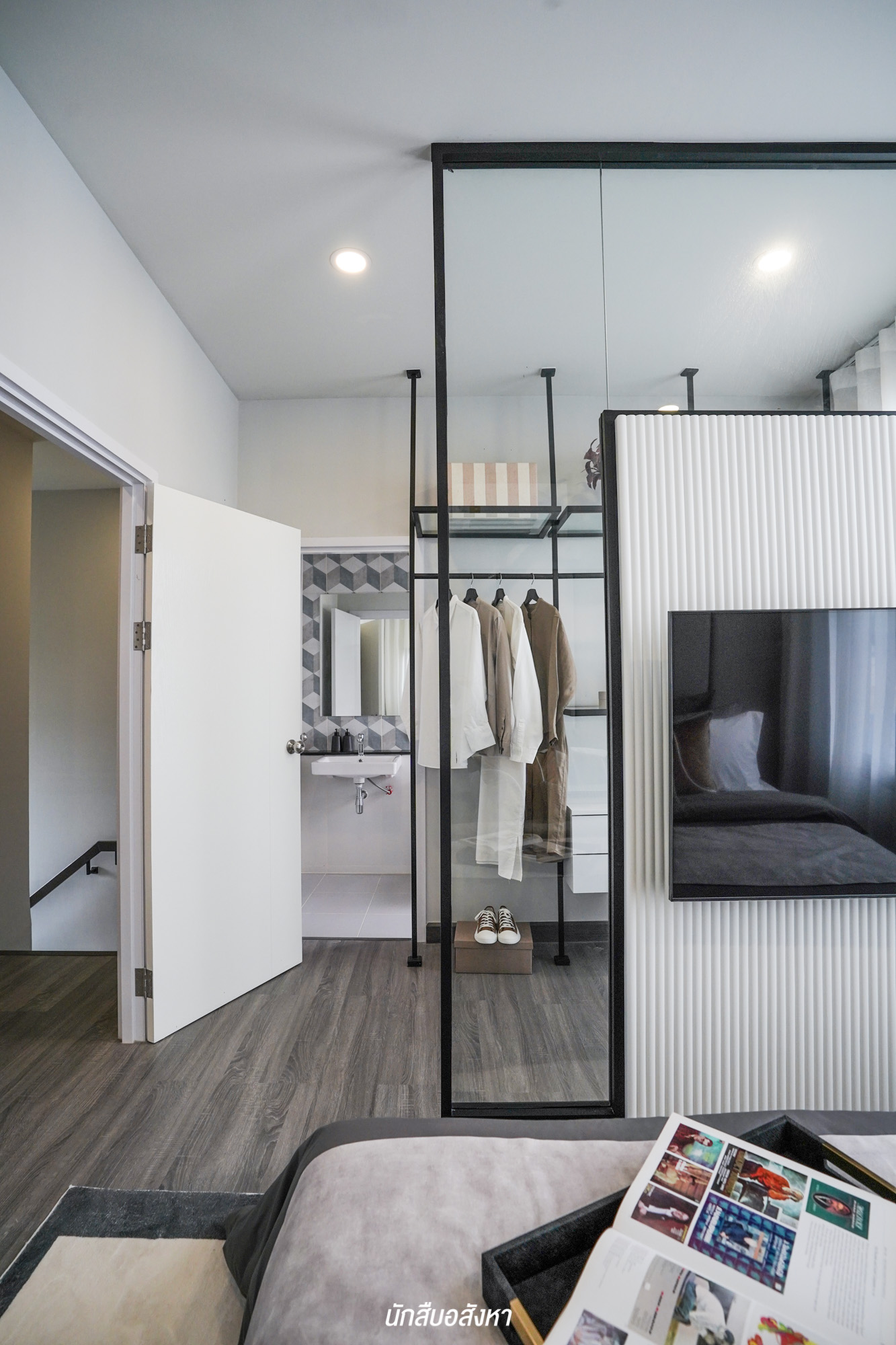ห้องนี้คือ Master Bedroom ห้องแรก ซึ่งอยู่ด้านหน้าของตัวบ้าน ห้องนี้จะได้หน้ากว้างเท่าหน้าบ้านเลย มี Floor To Ceiling 2.8 เมตร รู้สึกถึงความโปร่งสบาย ตัวห้องแบ่งฟังก์ชันเป็นสัดส่วน ข้อดีคือสามารถจัดวางเฟอร์นิเจอร์ได้ง่ายขึ้น อย่างห้องนี้วางเตียง King Size แล้วยังเหลือพื้นที่ด้านข้างและปลายเตียง สำหรับบิวท์อินตู้เสื้อผ้า หรือทำเป็นมุมแต่งตัว