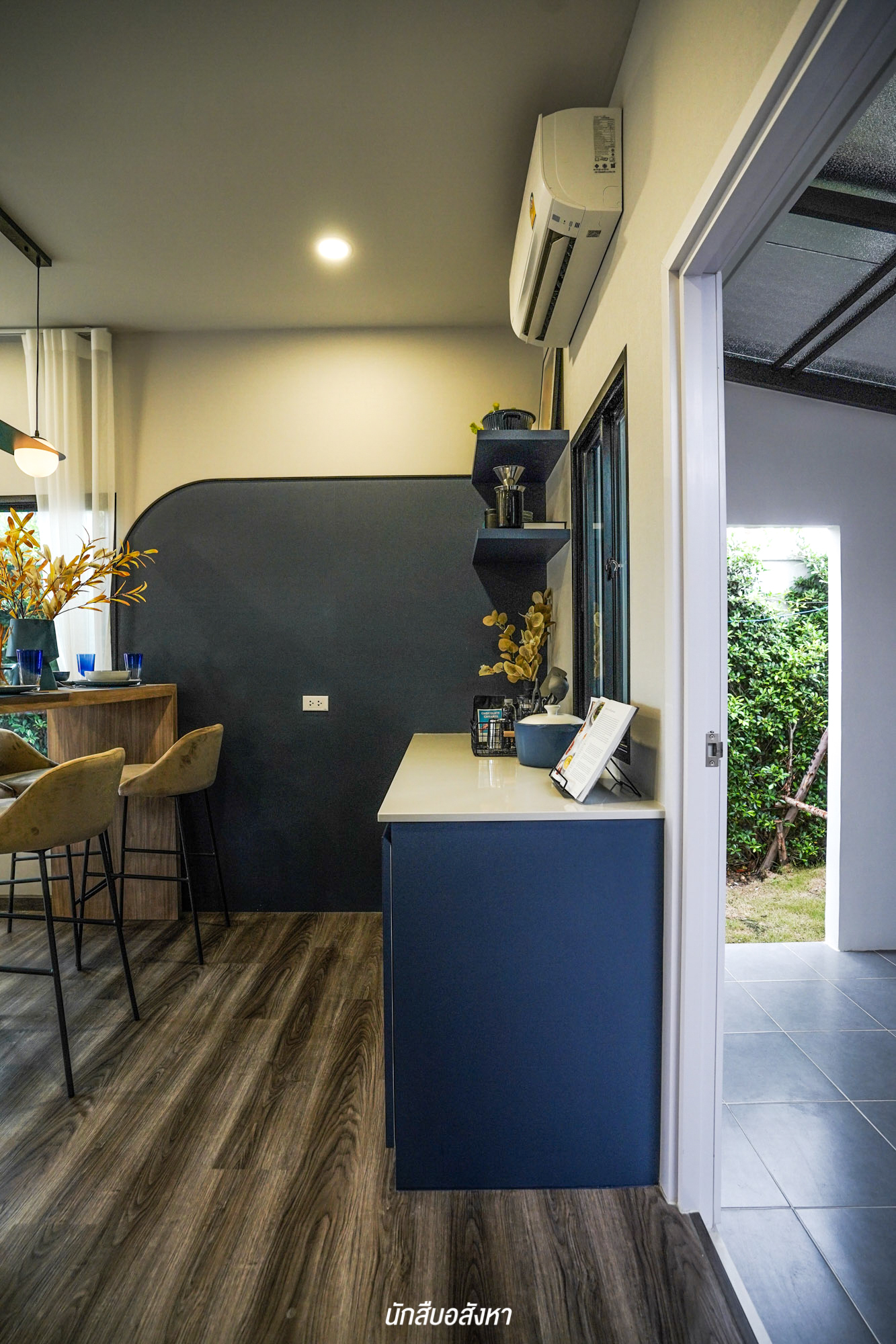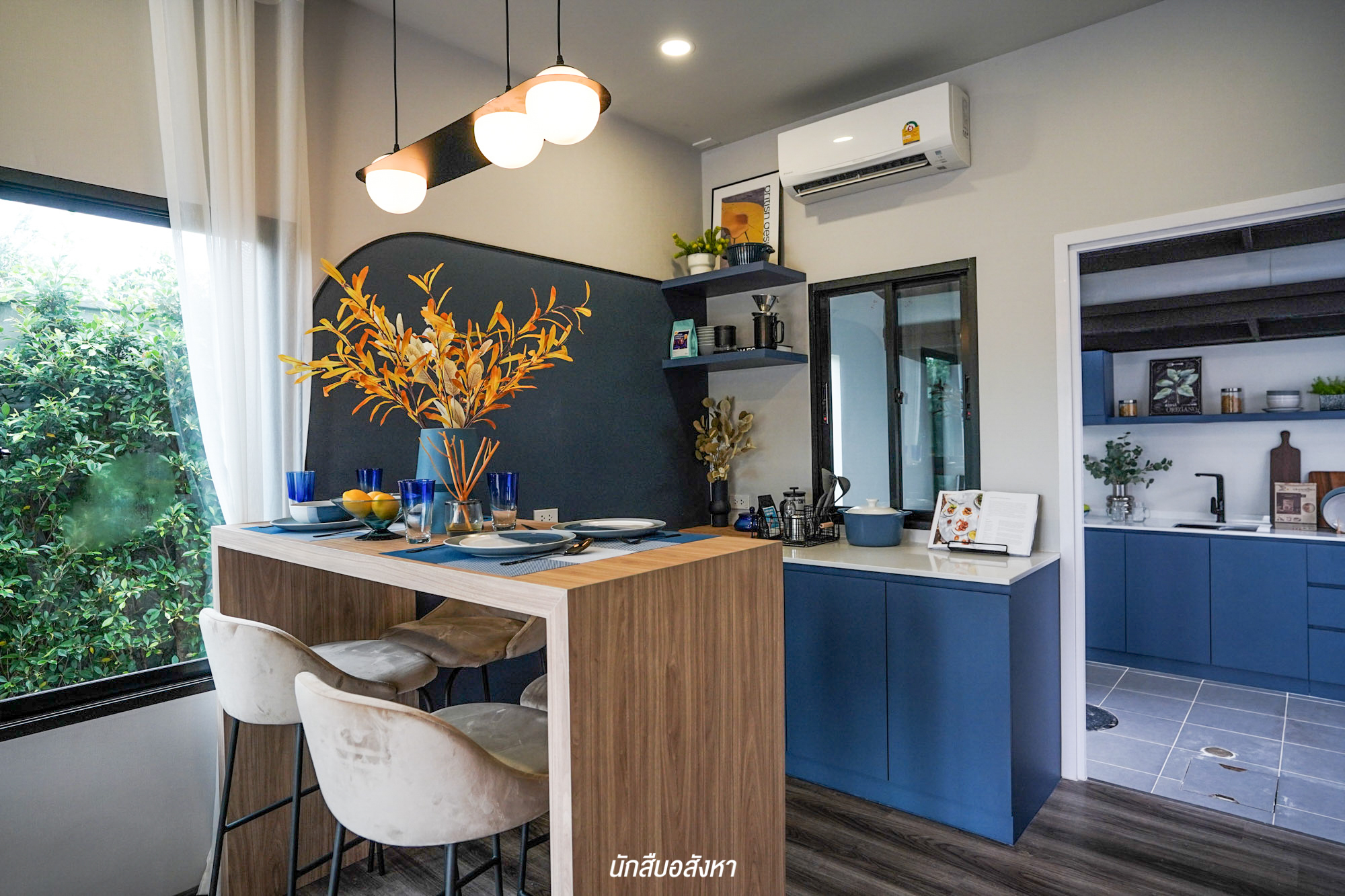 ถัดมาจะเป็นมุมรับประทานอาหาร 2 ที่นั่ง อารมณ์แบบเคาน์เตอร์บาร์ ซึ่งหากสมาชิกเยอะหน่อยก็เพิ่มเก้าอี้ได้อีก 2 – 3 ตัว ผนังโครงการบิวท์อินตู้เก็บของ เพื่อให้เห็นถึงฟังก์ชันที่เพิ่มมากขึ้น และมีกระจกด้านหลังที่เชื่อมกับครัวด้วย ตรงนี้ก็สามารถที่จะช่วยดึงแสงจากโซนหลังบ้านเข้ามาหรือ จะทำเป็นช่องที่ยื่นรับ-ส่งอาหาร ก็ได้