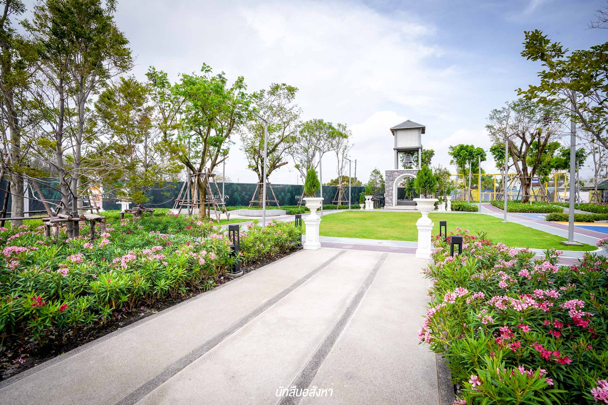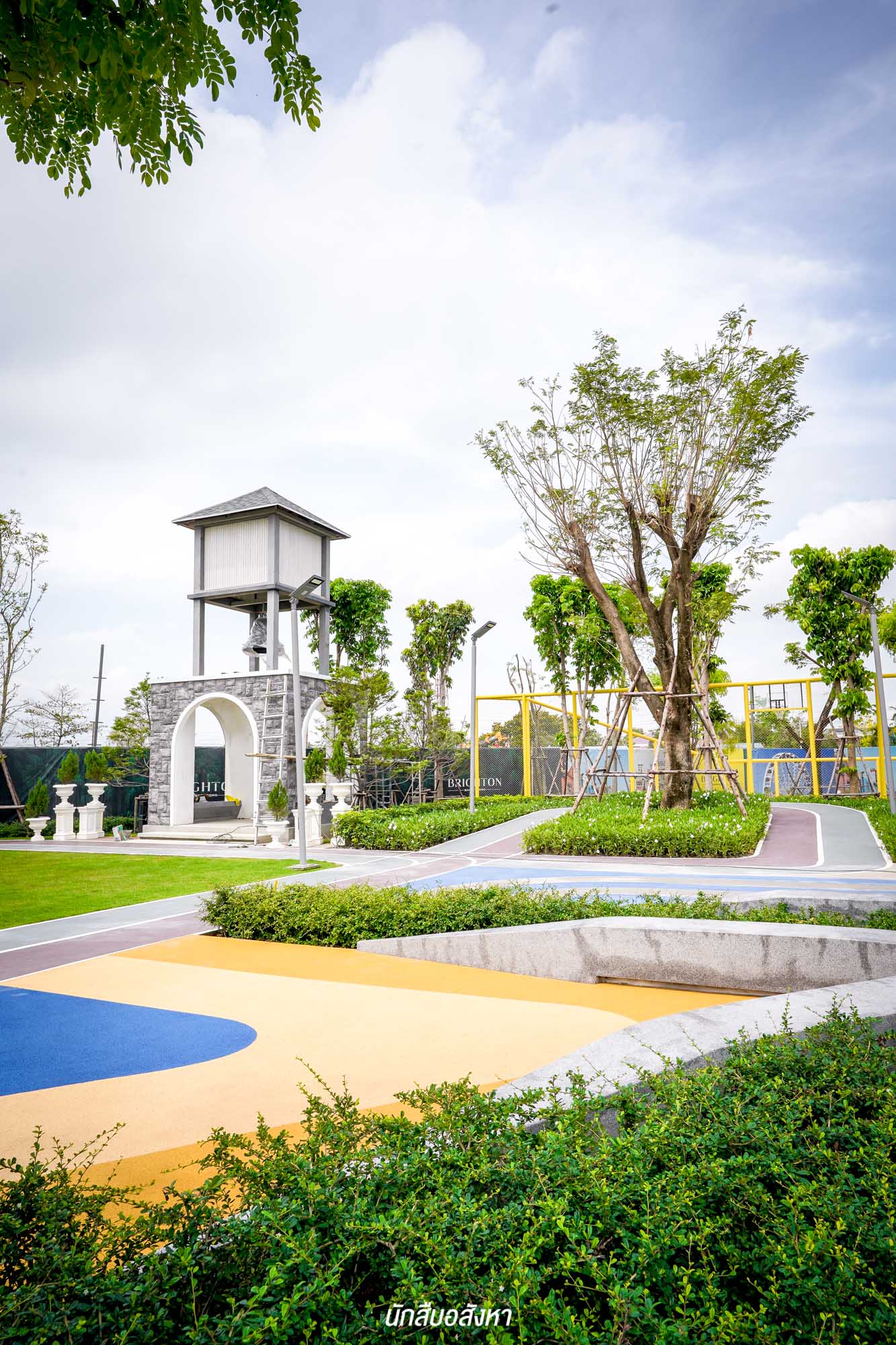 สวนสีเขียวขนาดใหญ่ : จะอยู่ด้านถัดไปจากตัวคลับเฮาส์เลยครับ ตกแต่งสไตล์สวนอังกฤษ มีหอนาฬิกาที่ใช้งานได้จริง ลูกบ้าน สามารถใช้พื้นที่ส่วนนี้ในการออกกำลังกายและทำกิจกรรมร่วมกับครอบครัวได้เลย