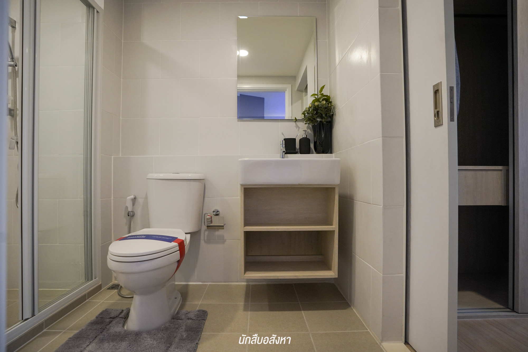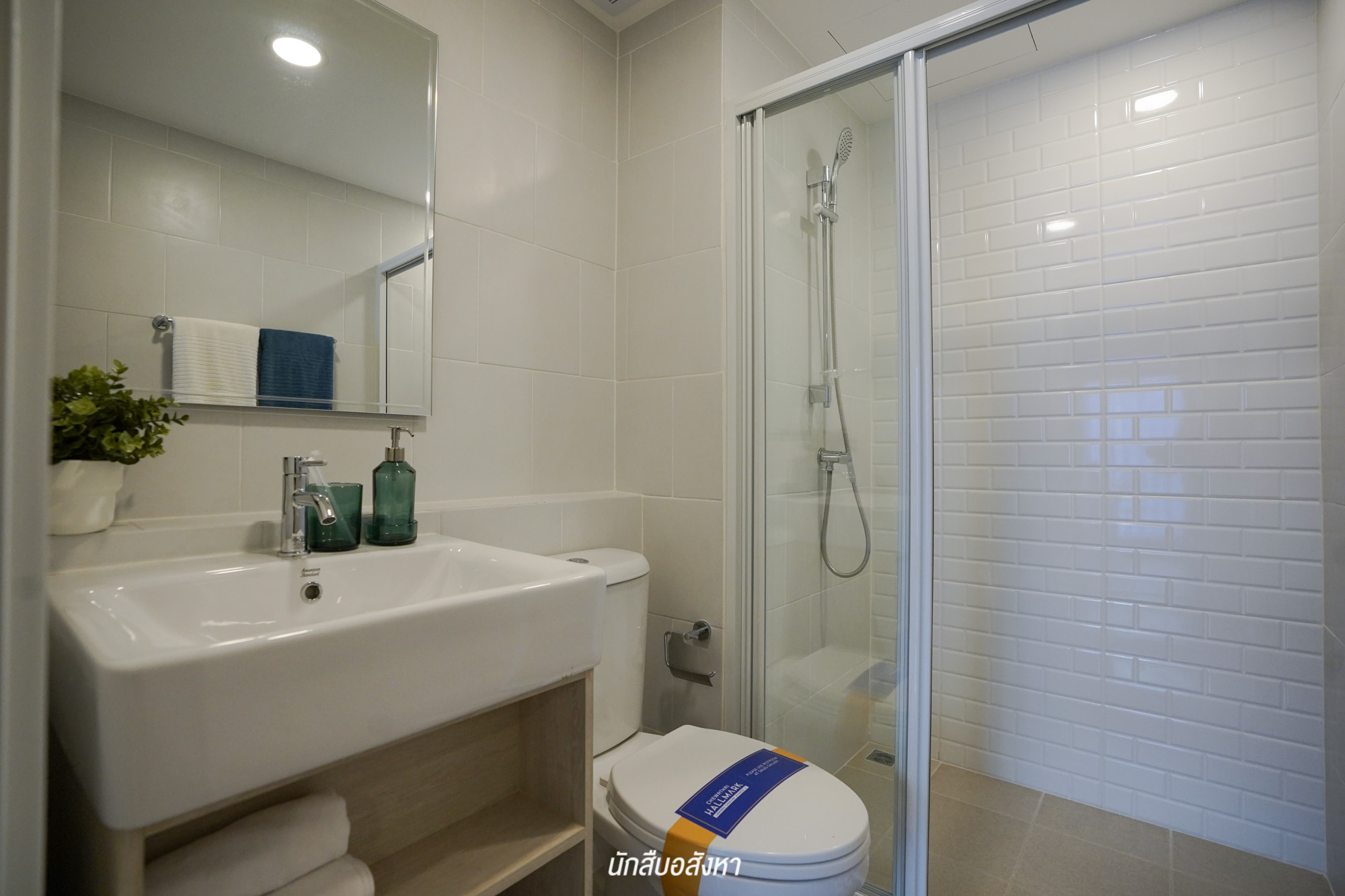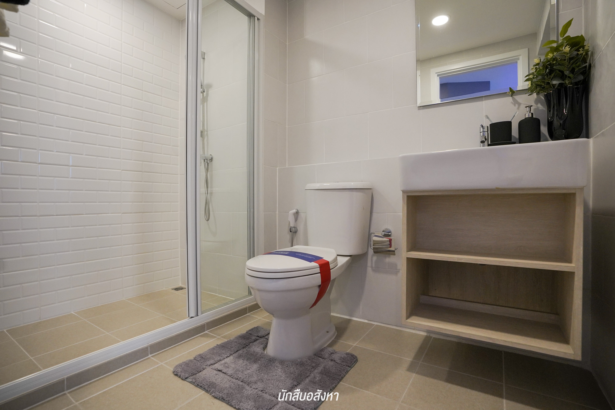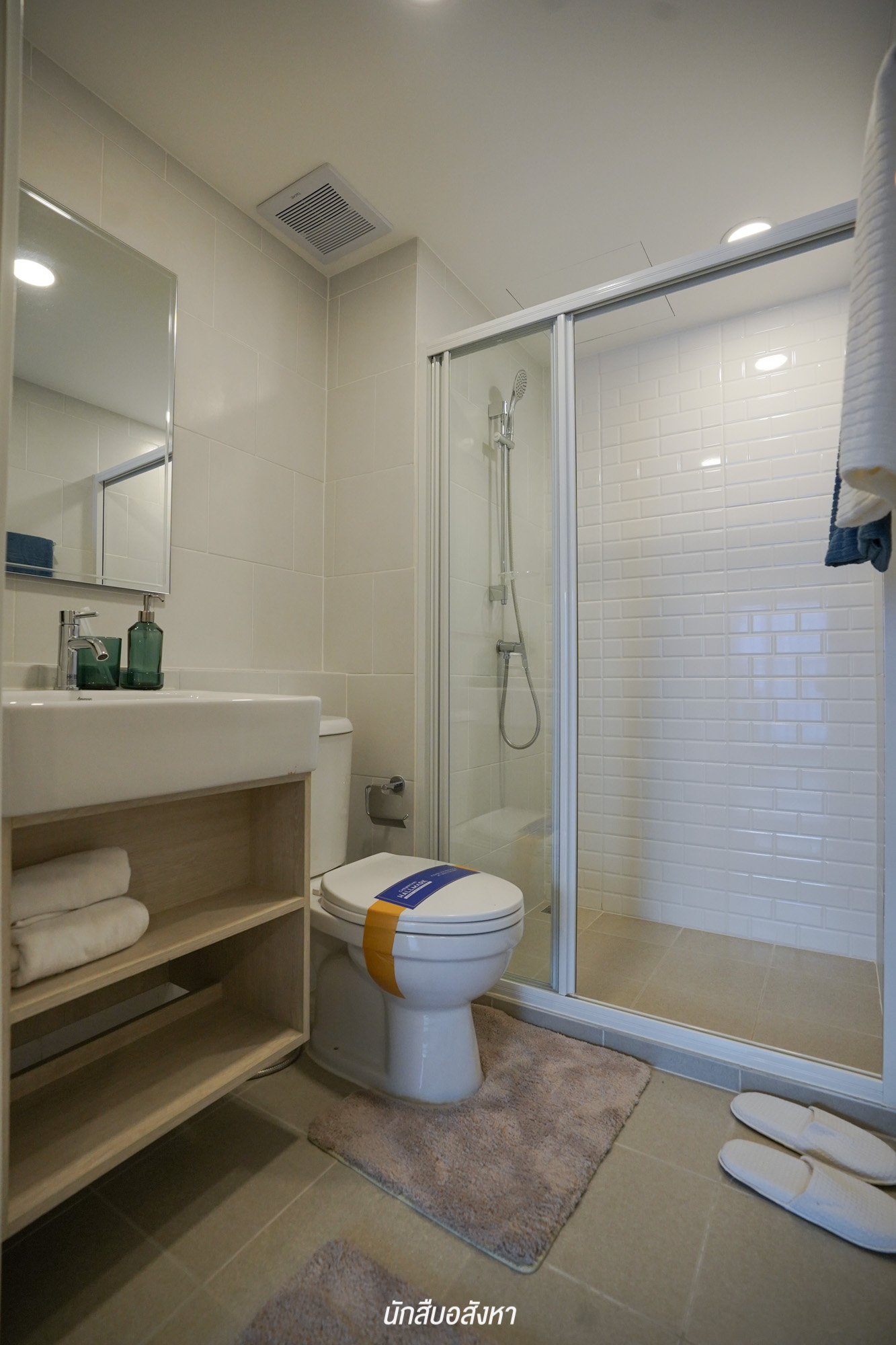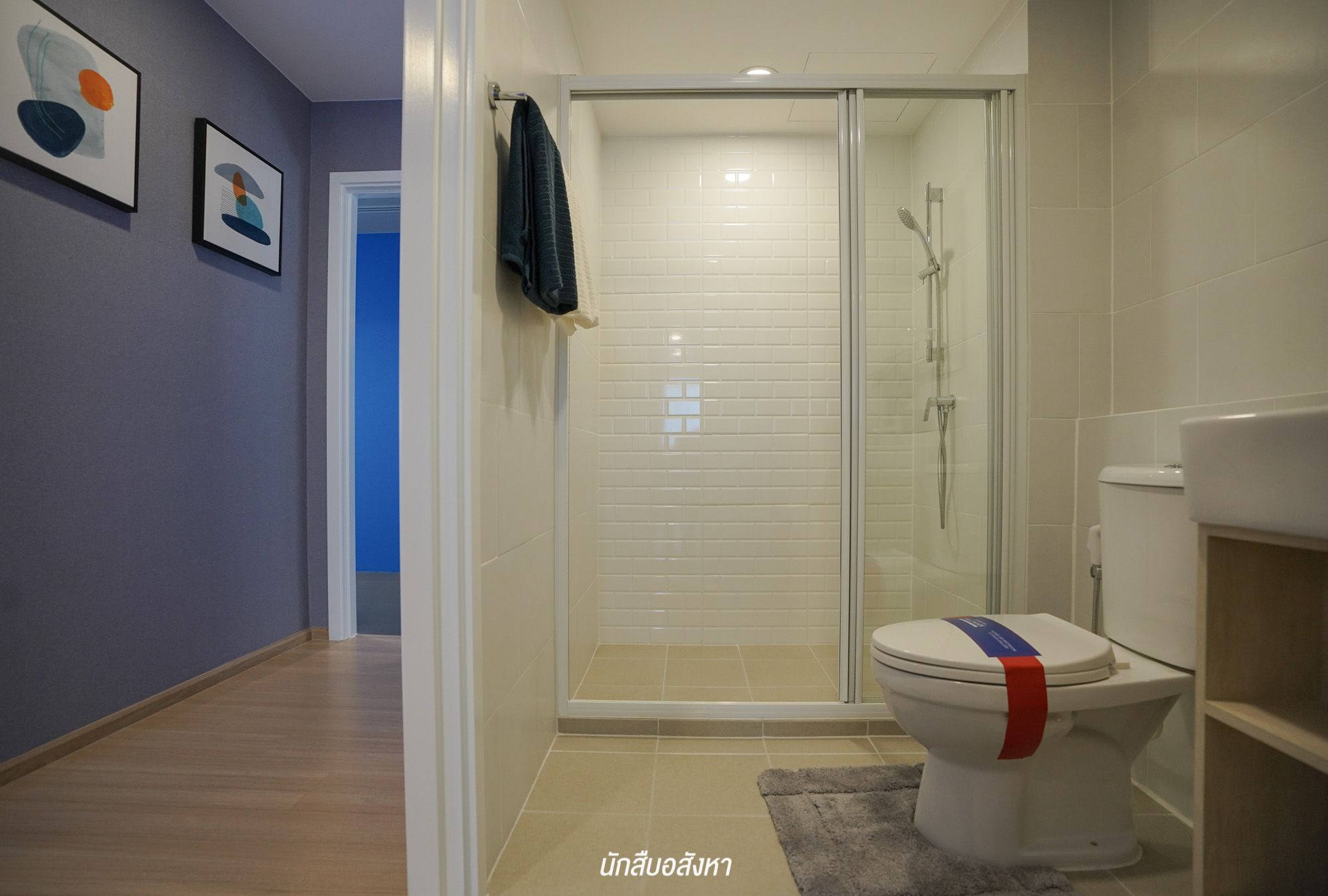 เมื่อเข้ามาทางซ้ายมือพบกับ ห้องน้ำ ภายในห้องการแบ่งโซนเปียก โซนแห้ง ด้วยกระจกฉากอาบน้ำ พร้อมอุปกรณ์และสุขภัณฑ์ จาก American Standard โดยห้องน้ำมีประตูที่เชื่อมไปยังห้องนอน เพิ่มความสะดวกในการใช้งานครับ