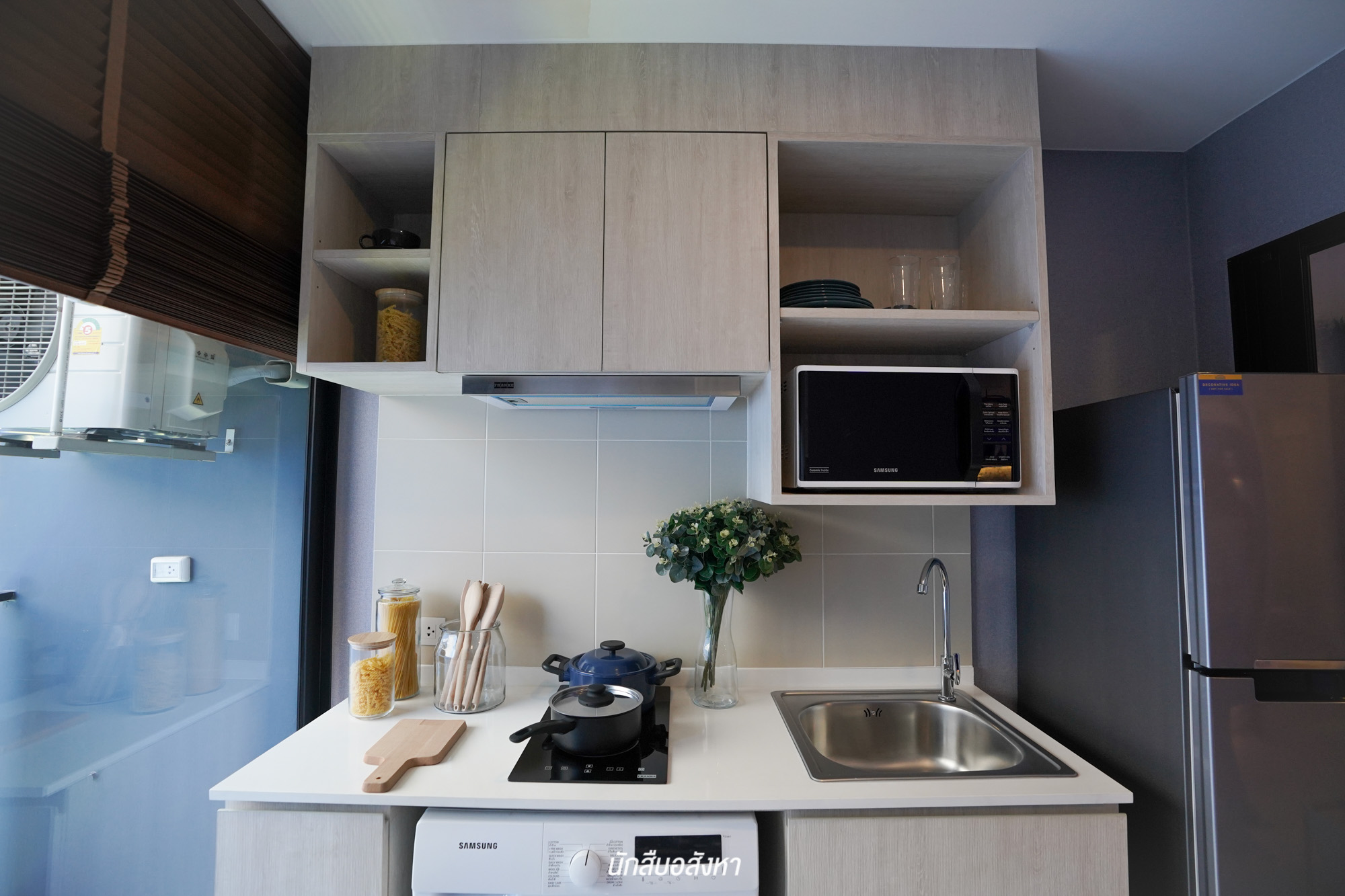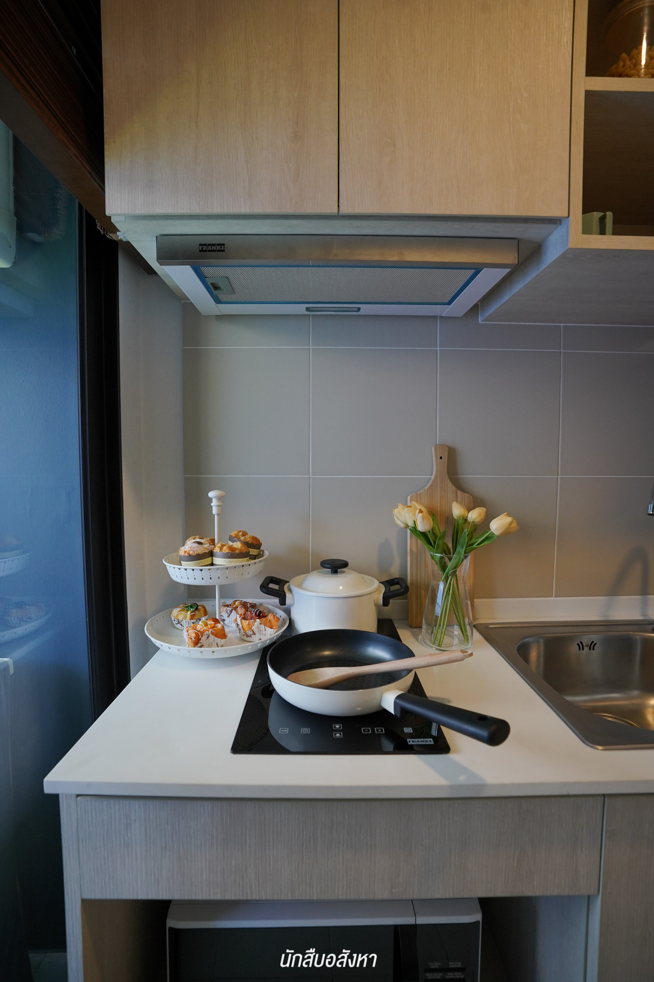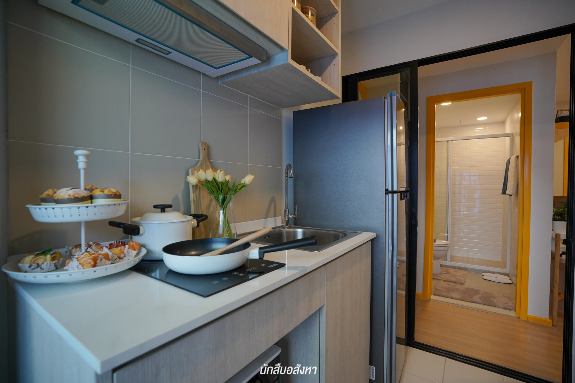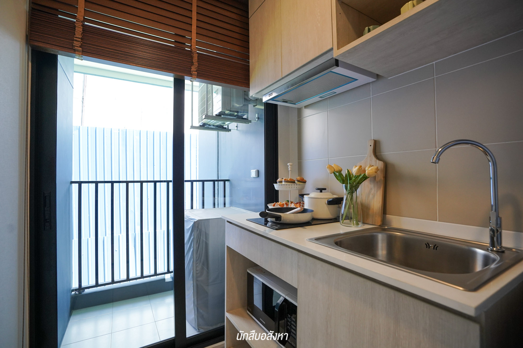 อีกหนึ่งจุดเด่นของโครงการคือครัวปิด พร้อมเชื่อมต่อกับระเบียง ทำให้อากาศถ่ายเทได้อย่างสะดวก สามารถทำอาหารได้อย่างจัดเต็ม หมดปัญหาเรื่องกลิ่น ควัน เข้าไปรบกวนพื้นที่โซนอื่นๆ ครับ โดยภายในห้องครัวมาพร้อมกับเคาน์เตอร์ครัว ช่องเก็บของด้านบน, อ่างล้างจานแบบ 1 หลุม ที่ทางโครงการให้มาครับ และยังมีพื้นที่ช่องว่างด้านล่างสำหรับวางไมโครเวฟ อีกทั้งยังเหลือพื้นที่ด้านข้างสำหรับวางตู้เย็น