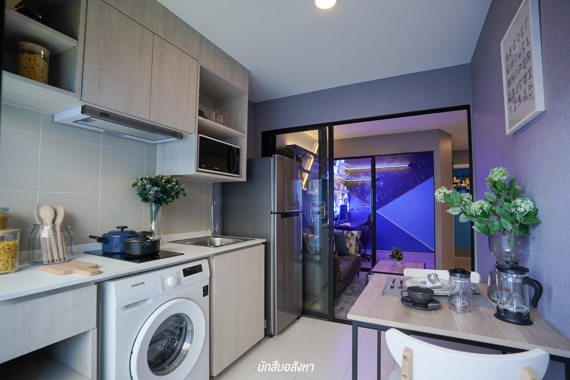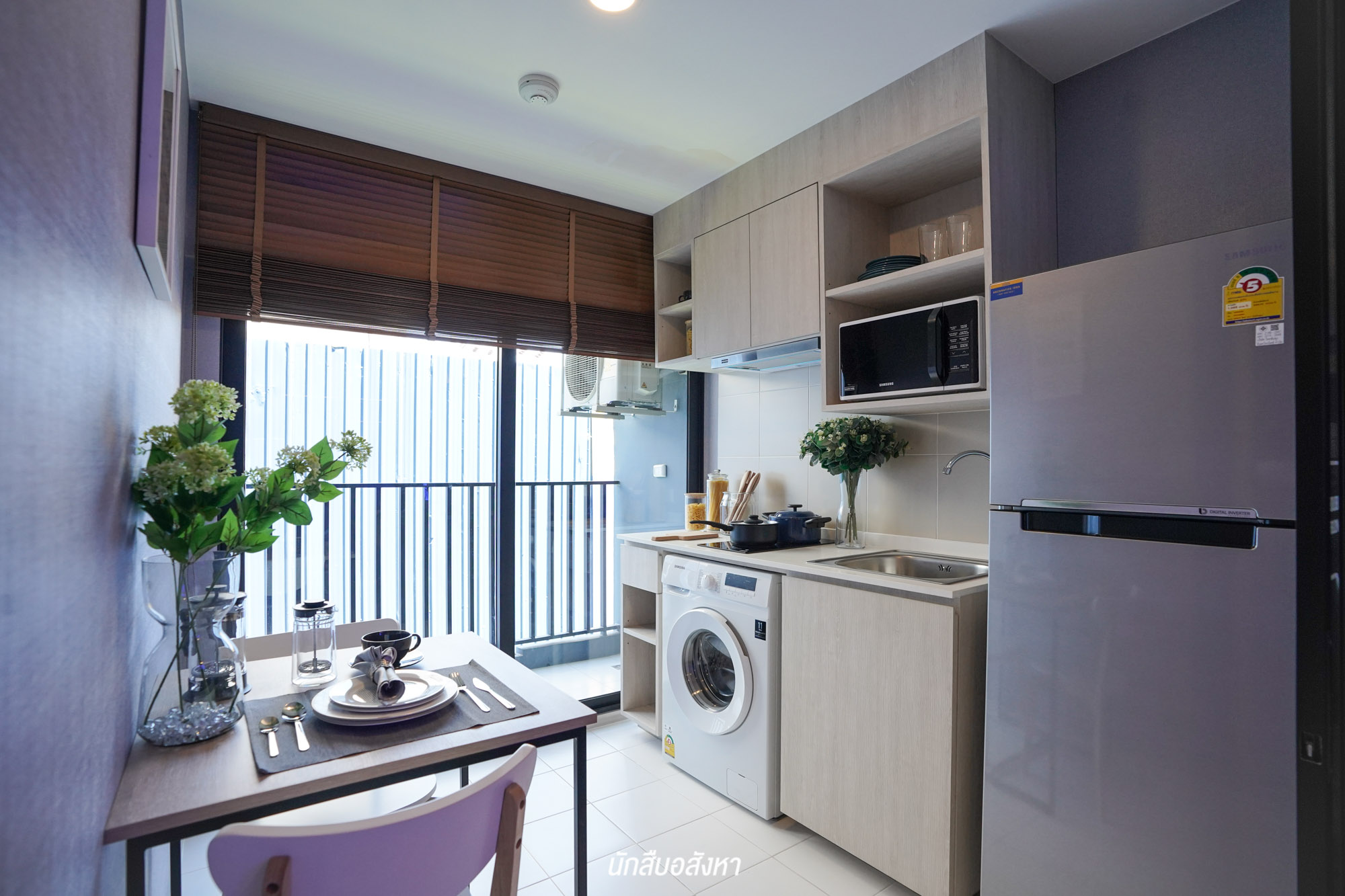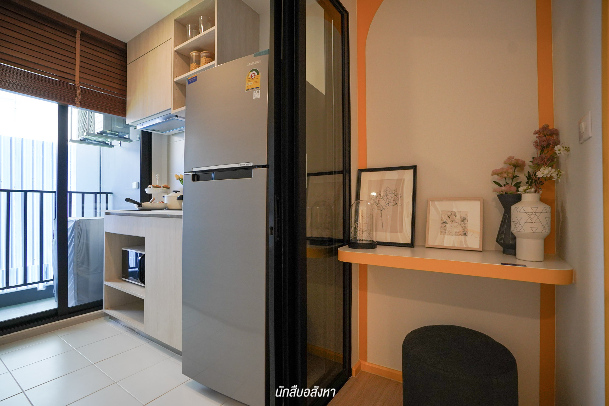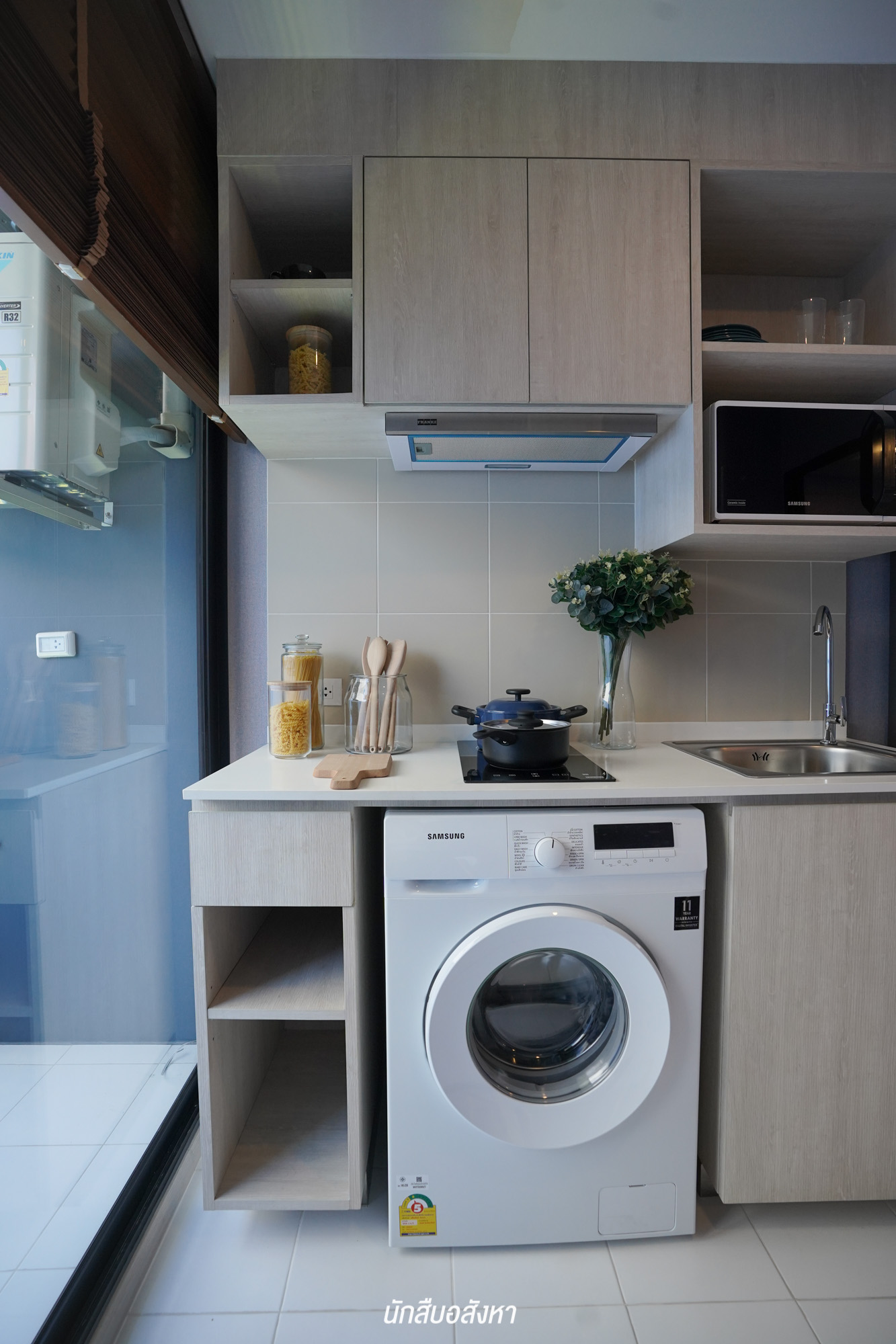 อีกหนึ่งจุดเด่นของโครงการคือครัวปิด พร้อมเชื่อมต่อกับระเบียง ทำให้อากาศถ่ายเทได้อย่างสะดวก สามารถทำอาหารได้อย่างจัดเต็ม หมดปัญหาเรื่องกลิ่น ควัน เข้าไปรบกวนพื้นที่โซนอื่นๆ ครับ โดยภายในห้องครัวมาพร้อมกับเคาน์เตอร์ครัว ช่องเก็บของด้านบน, อ่างล้างจานแบบ 1 หลุม ที่ทางโครงการให้มาครับ และยังมีพื้นที่ช่องว่างด้านล่างสำหรับวางไมโครเวฟ อีกทั้งยังเหลือพื้นที่ด้านข้างสำหรับวางตู้เย็น