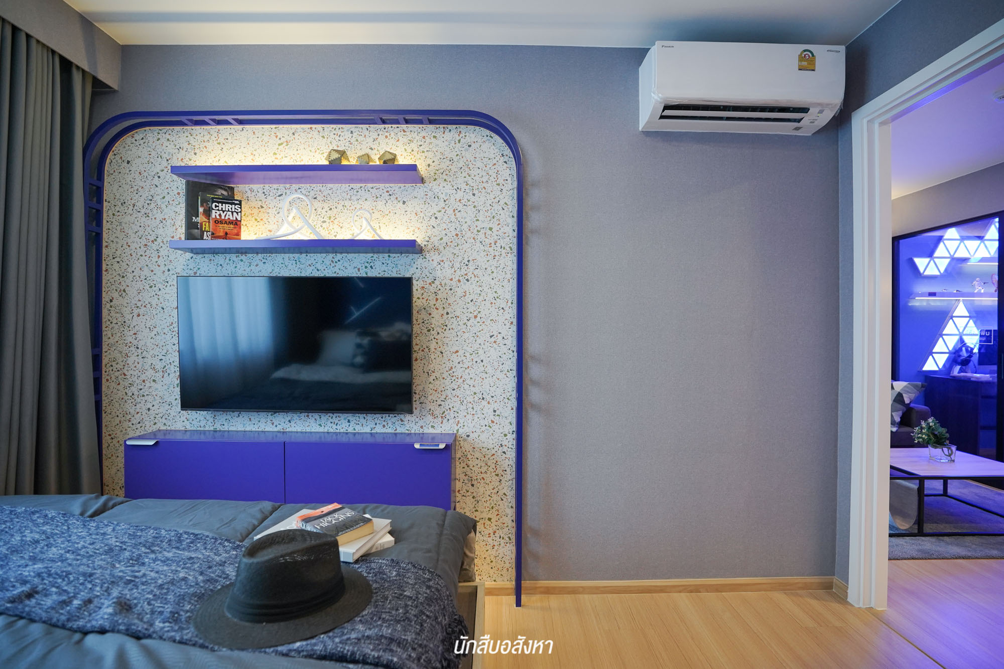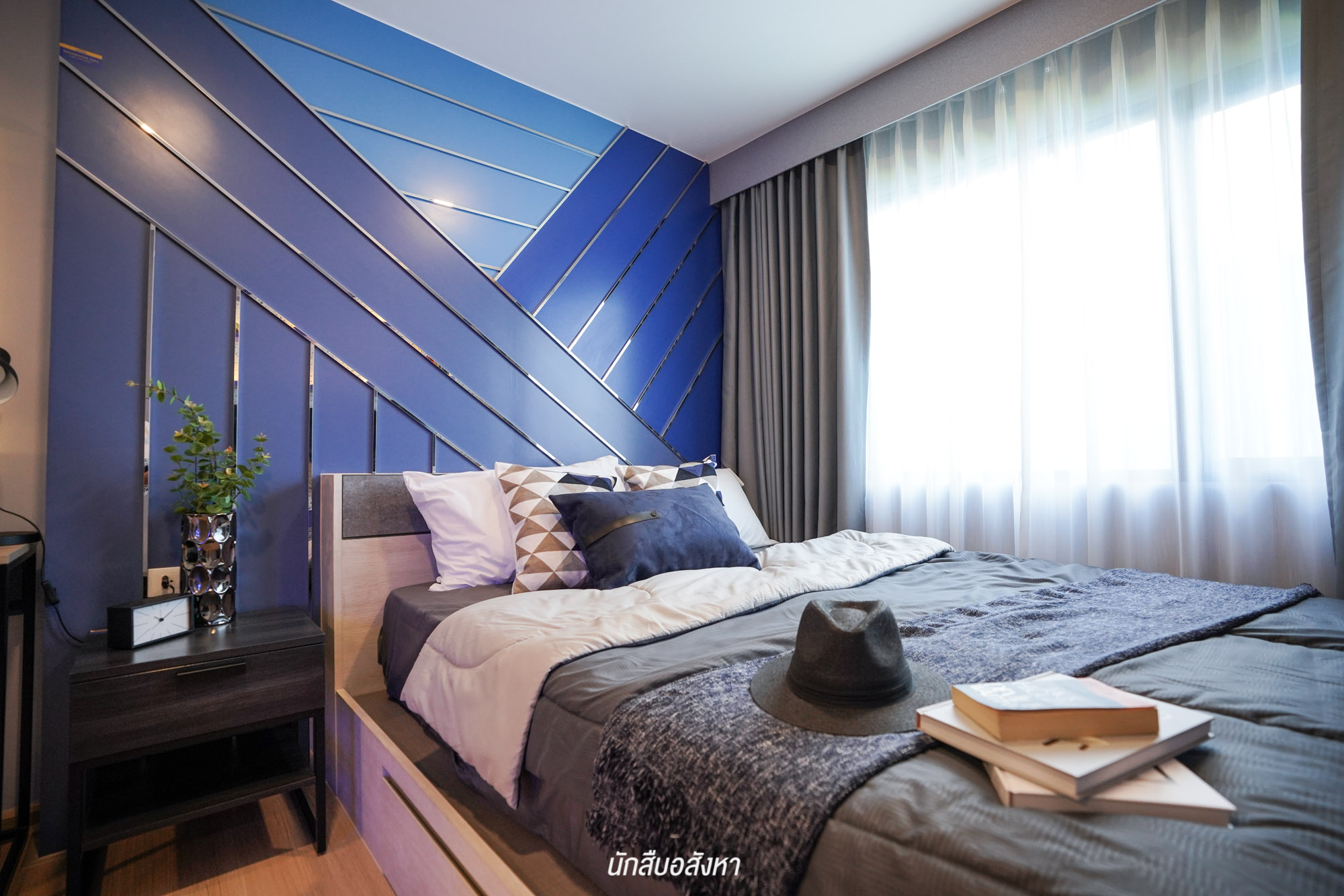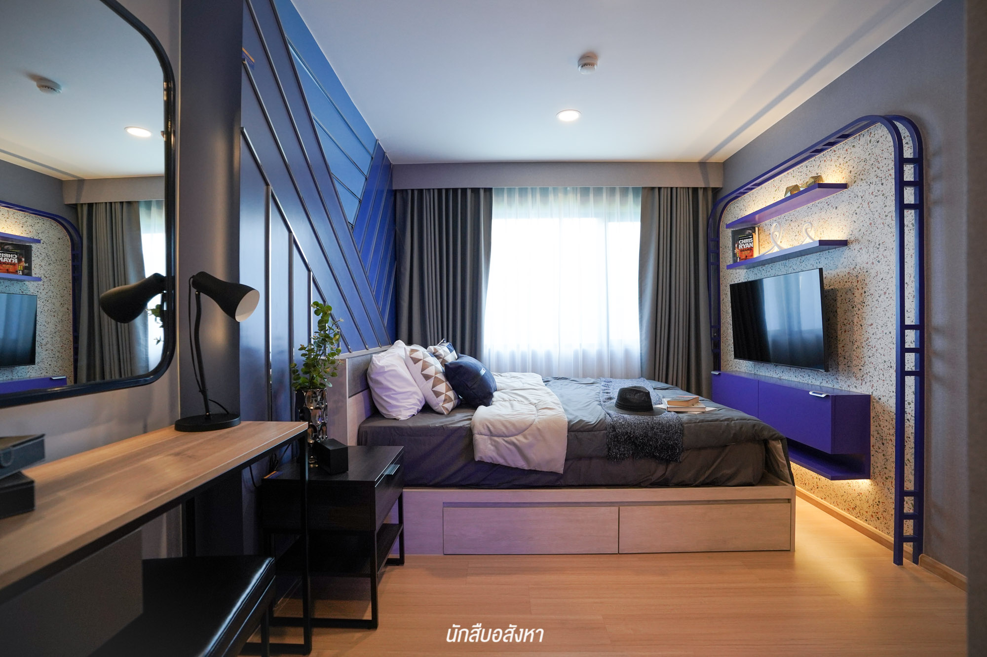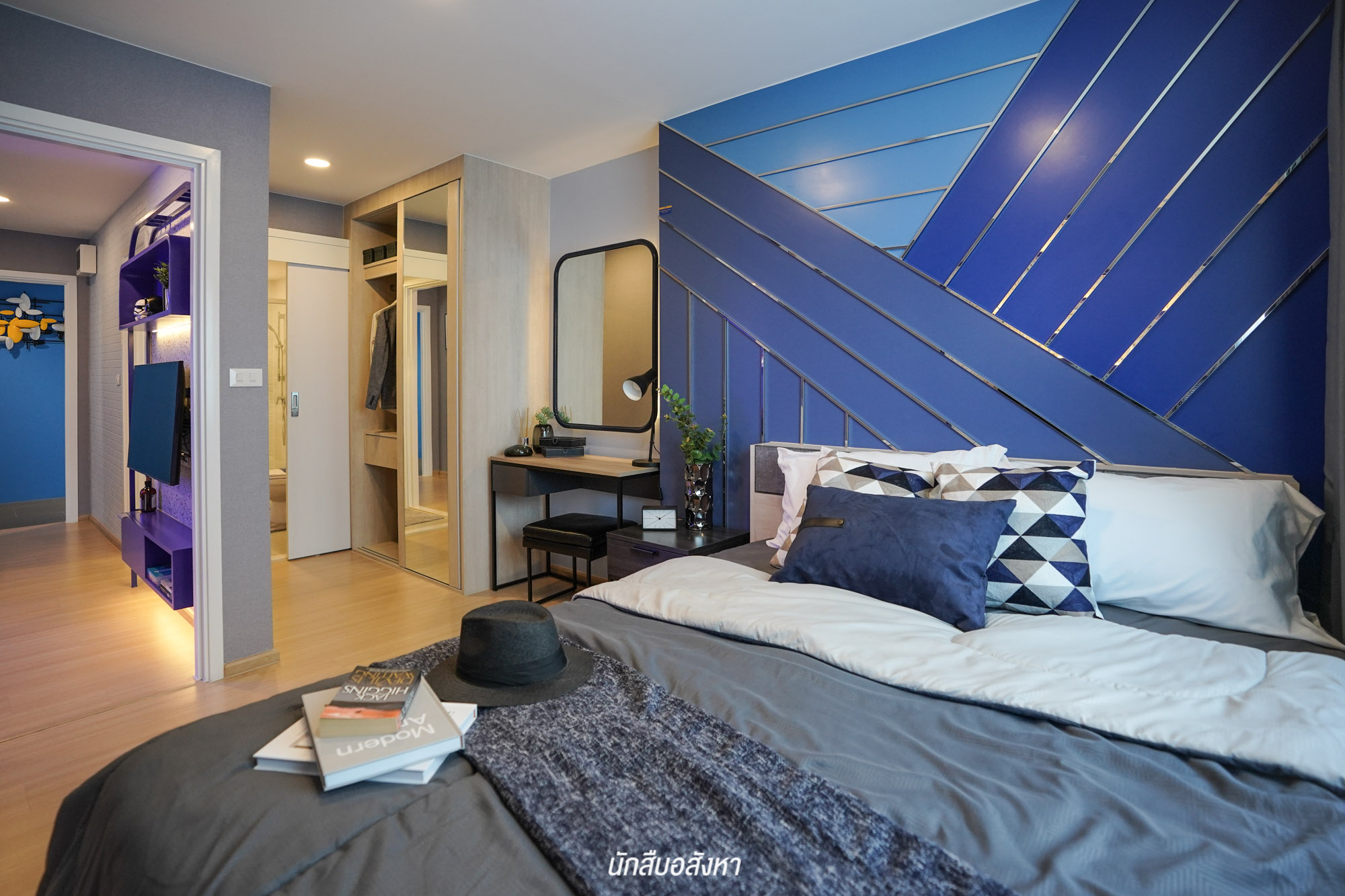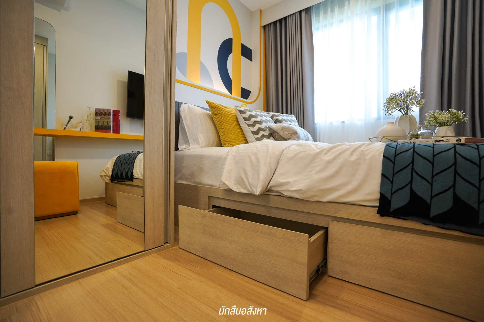 ในส่วนของห้องนอนมีการกั้นโซนอย่างเป็นสัดส่วนด้วยประตูบานเลื่อน ภายในห้องมีขนาดกว้าง พร้อม สามารถจัดสรรพื้นที่ครบทุกฟังก์ชัน ไม่ว่าจะเป็นมุมพักผ่อน สามารถวางเตียงนอนขนาด 5 ฟุต ได้ โดยฐานเตียงมีที่สำหรับเก็บของ และมุมแต่งตัว ด้วย Built-in ตู้เสื้อผ้า, โต๊ะเครื่องแป้ง