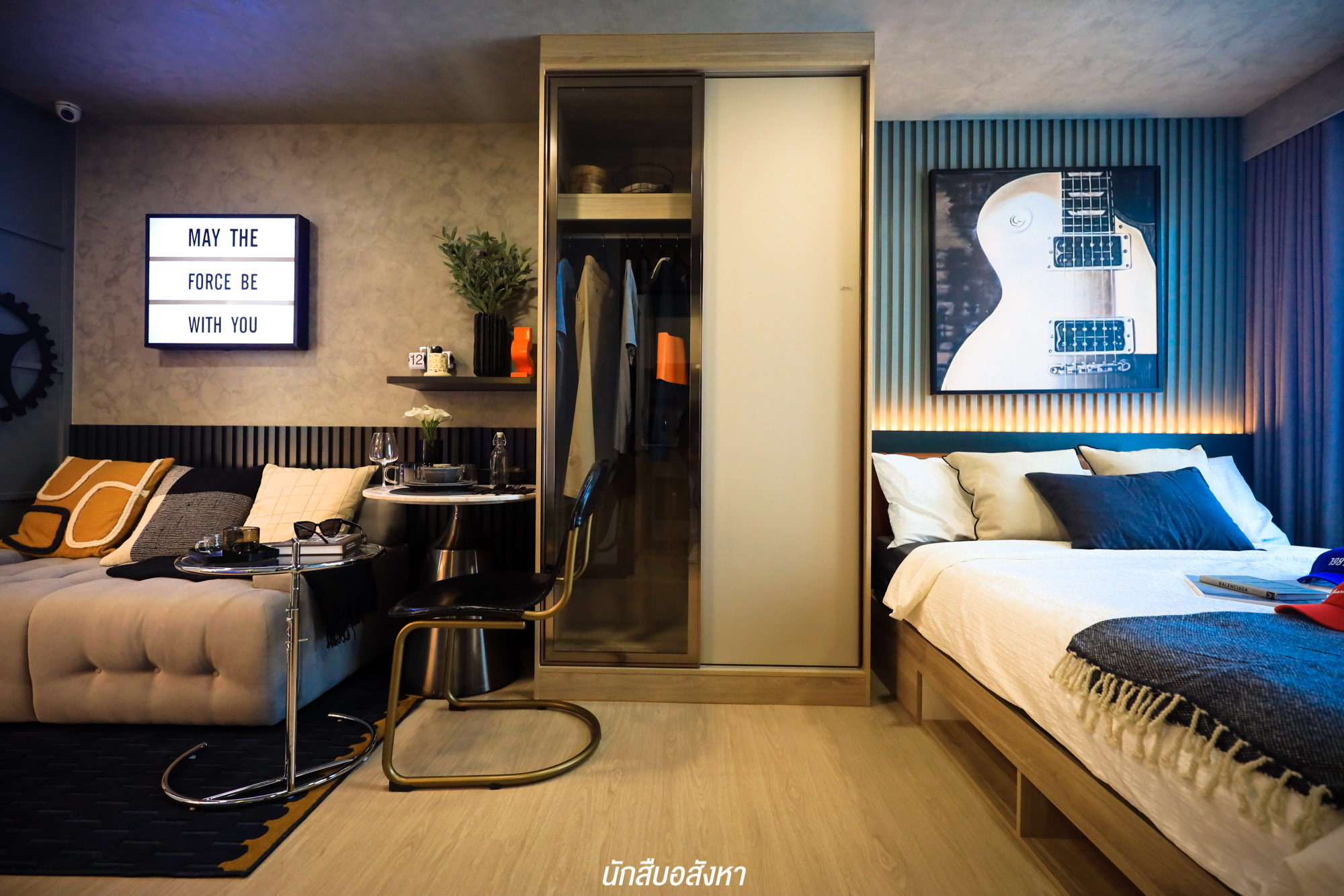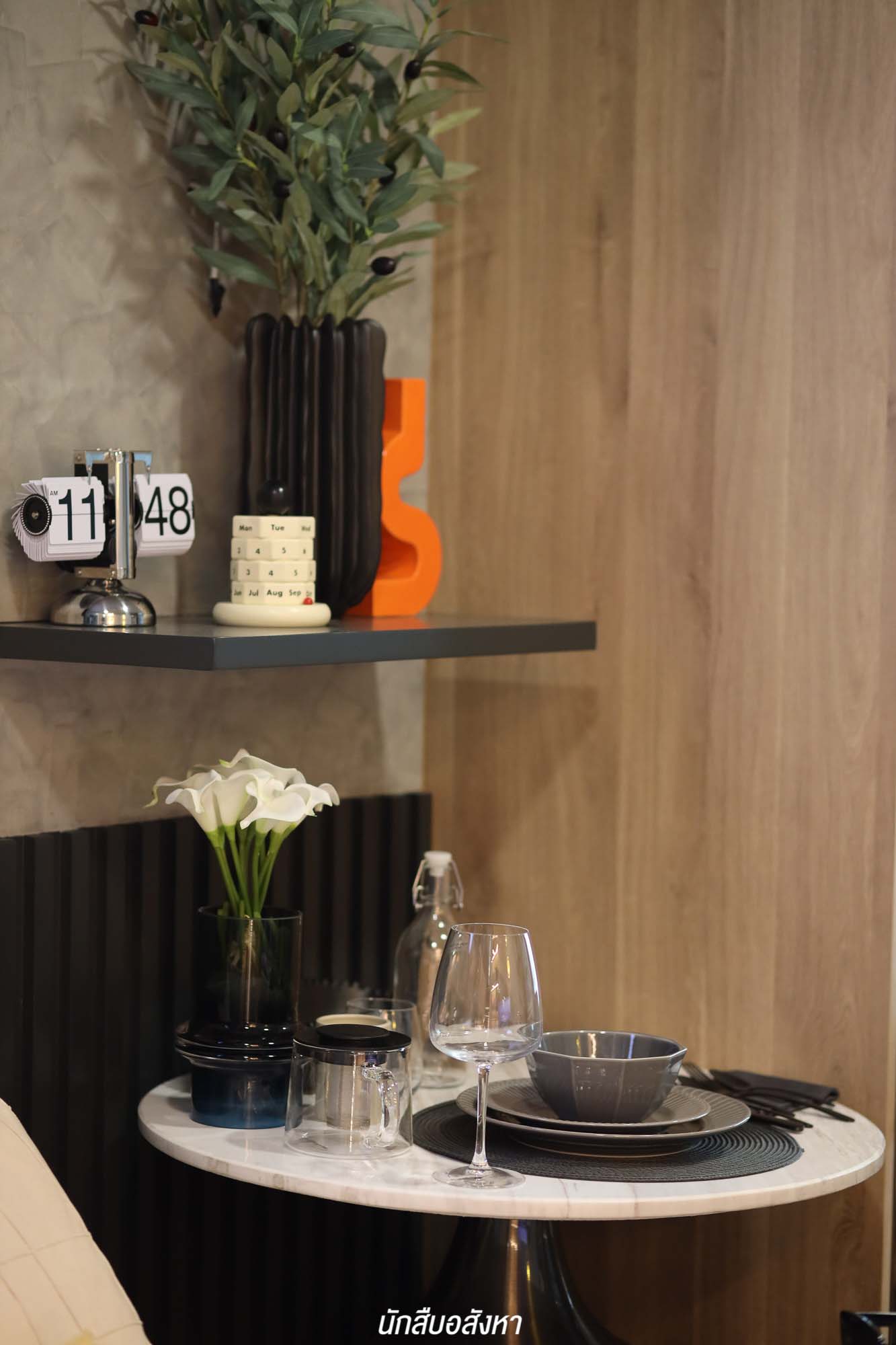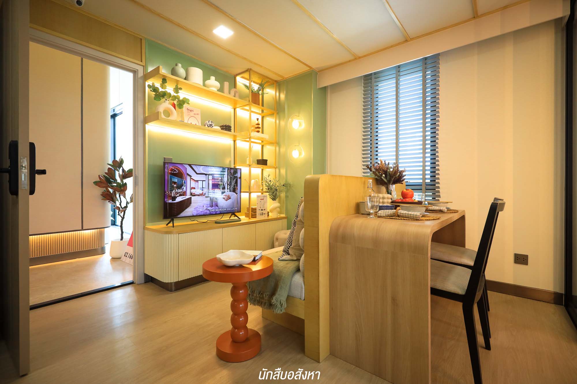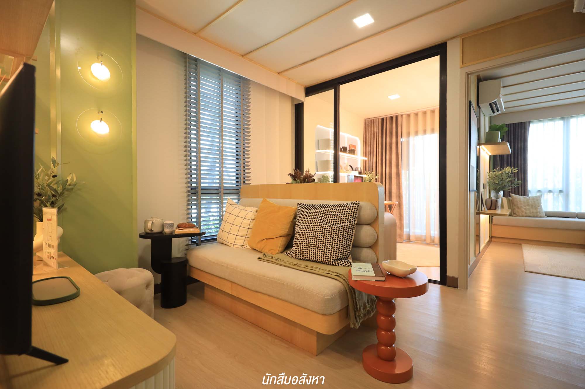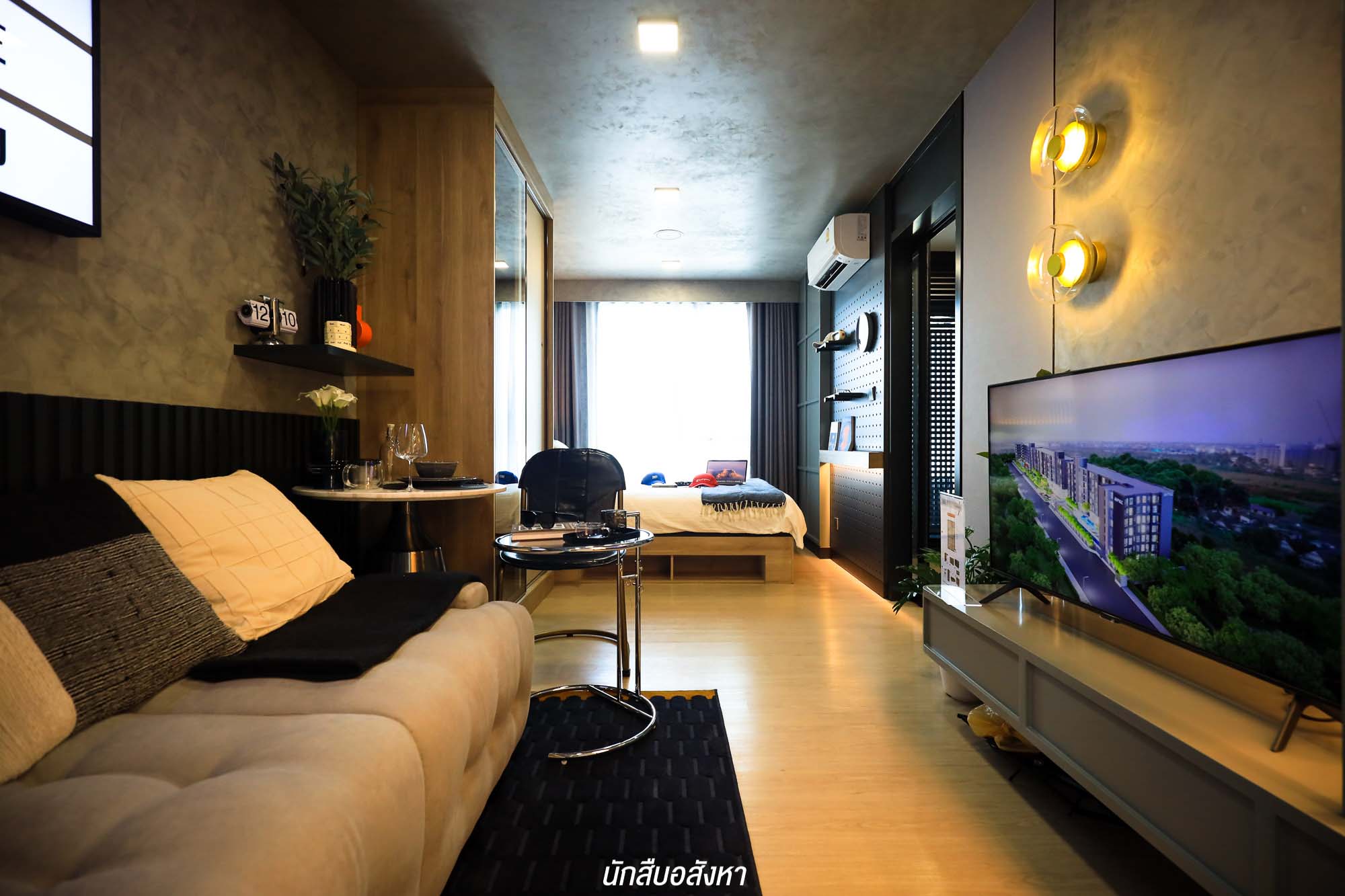 เมื่อเข้ามาภายในห้อง จะเจอกับมุมนั่งเล่น รับแขกใดๆ ก่อนเลย ซึ่งสามารถวางโซฟาขนาด 2 ที่นั่ง ส่วนฝั่งตรงข้าม โครงการมีชั้นวางทีวีให้ จะติดตั้งทีวีกับผนังหรือตั้งกับพื้นก็ได้ครับ สามารถวางทีวีขนาด 40-50 นิ้ว ได้สบาย ติดกันเลยจะเป็นมุมอเนกประสงค์ของจริงทางโครงการจะให้เป็นโต๊ะที่สามารถพับเก็บได้ จะใช้เป็นโต๊ะรับประทานอาหารหรือจะทำเป็นมุมอ่านหนังสืออันนี้ก็สามารถปรับได้ตามไลฟ์สไตล์ ซึ่งเชื่อมต่อกันกับเตียงนอน เราสามารถเลือกวางเตียง 5 ฟุตได้สบาย ๆ แต่ตัวของเตียงนั้นทางโครงการจะให้เฉพาะฐานเตียงมาครับ และตู้เสื้อผ้าทางโครงการก็มีมาให้เช่นกัน