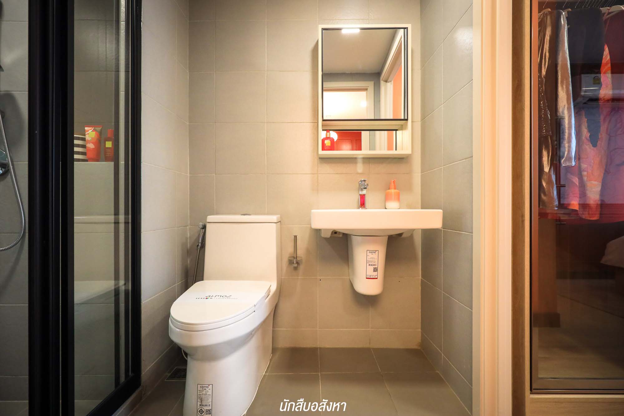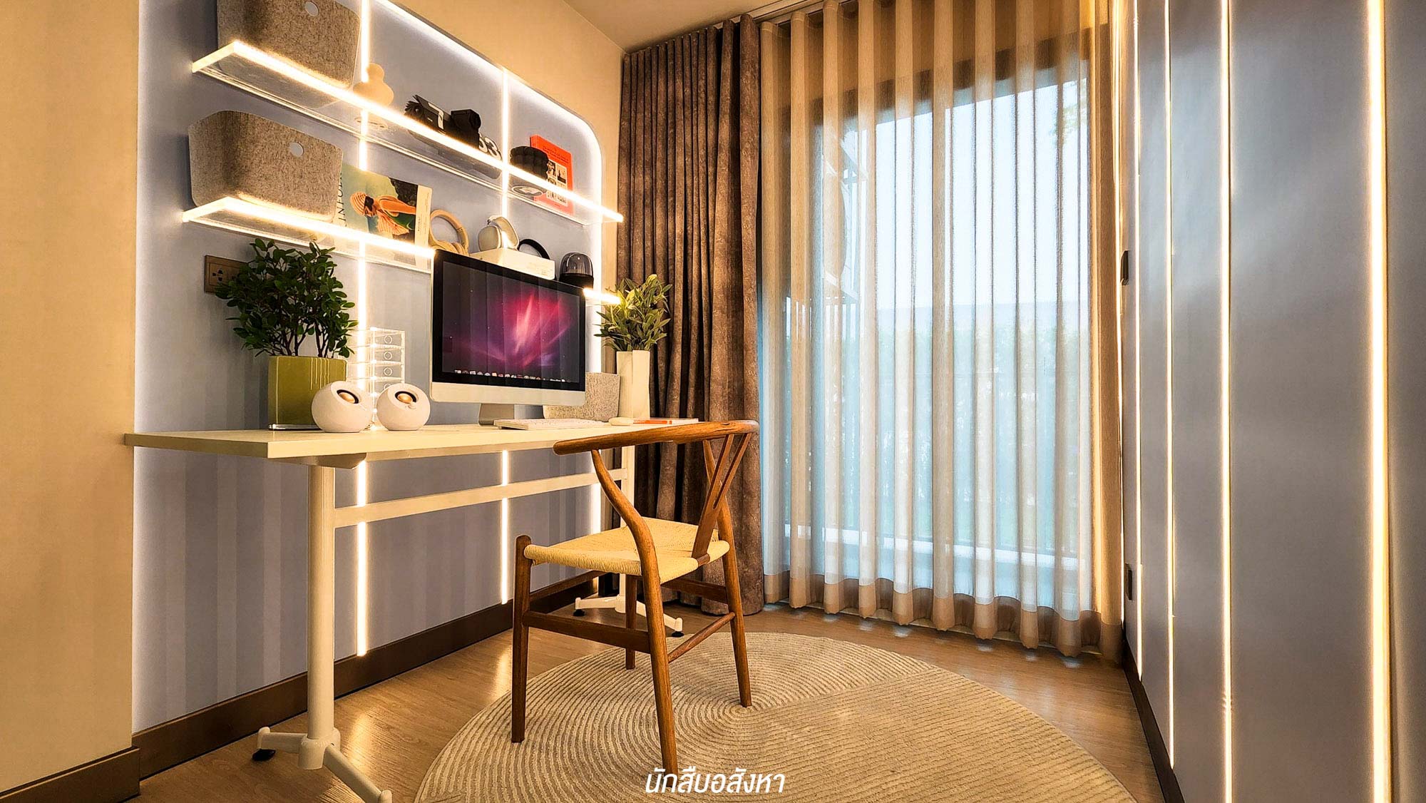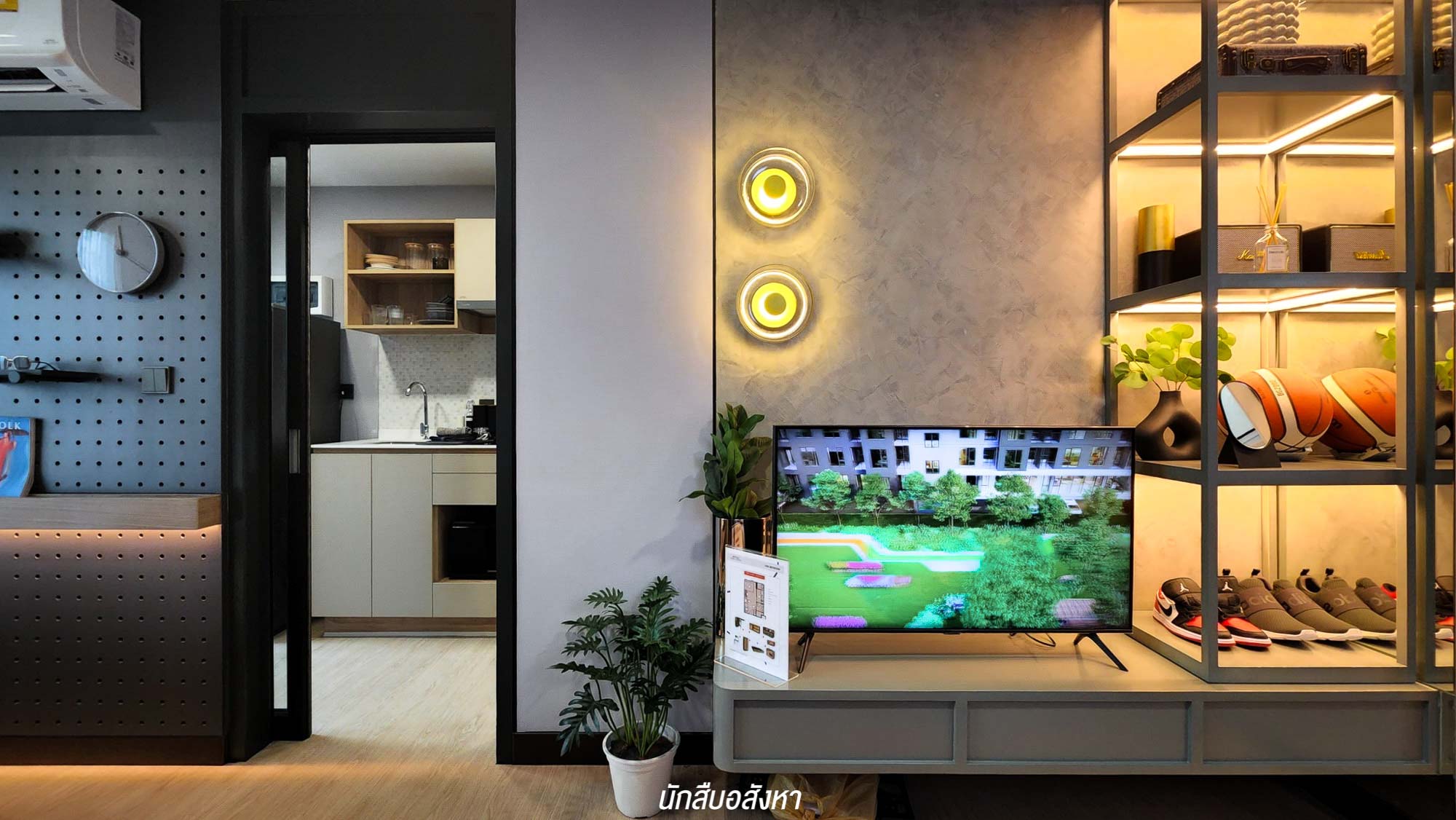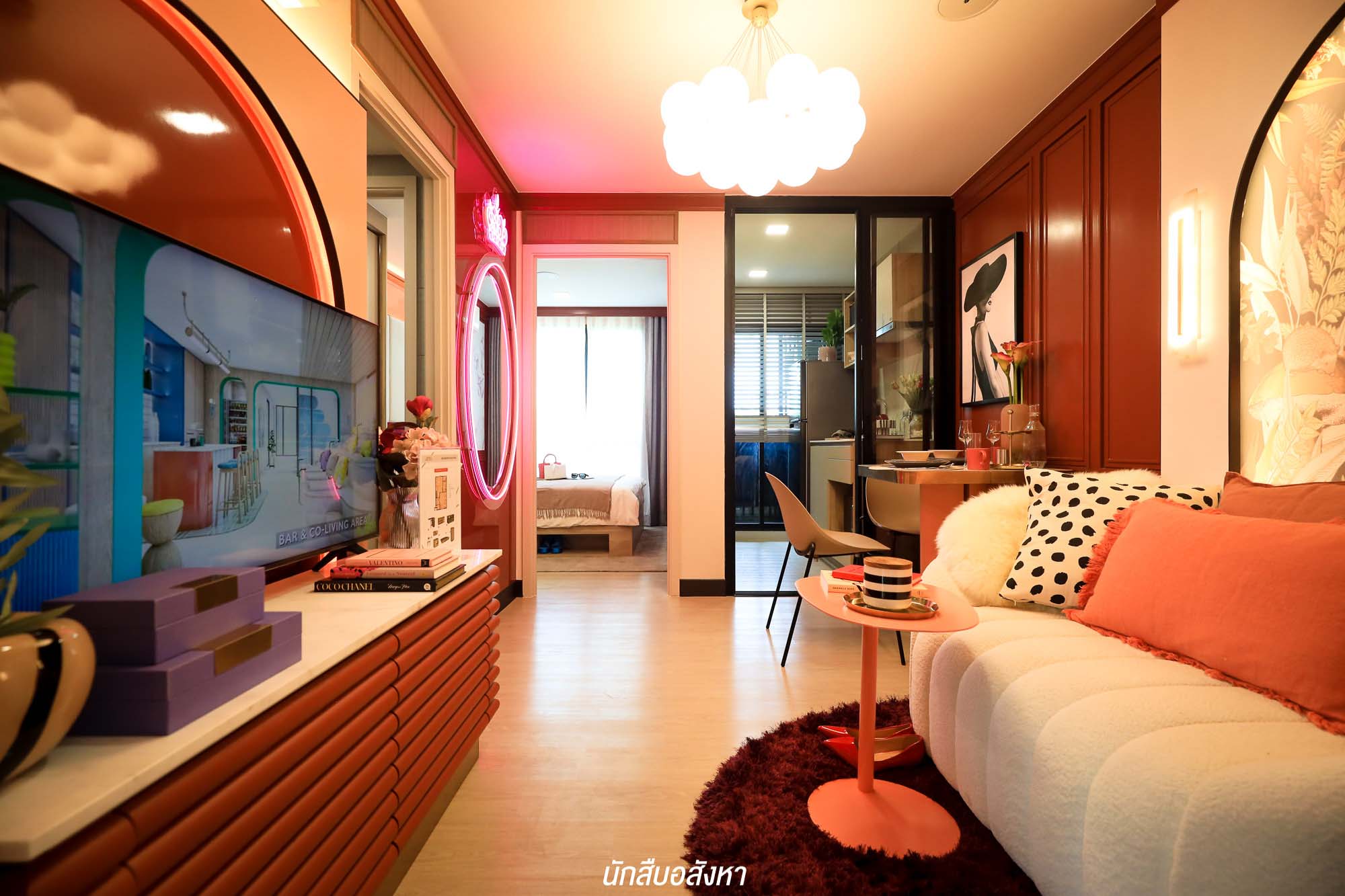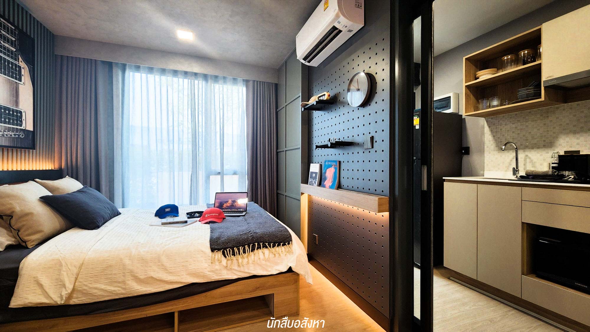 เมื่อเข้ามาภายในห้อง จะเจอกับมุมนั่งเล่น รับแขกใดๆ ก่อนเลย ซึ่งสามารถวางโซฟาขนาด 2 ที่นั่ง ส่วนฝั่งตรงข้าม โครงการมีชั้นวางทีวีให้ จะติดตั้งทีวีกับผนังหรือตั้งกับพื้นก็ได้ครับ สามารถวางทีวีขนาด 40-50 นิ้ว ได้สบาย ติดกันเลยจะเป็นมุมอเนกประสงค์ของจริงทางโครงการจะให้เป็นโต๊ะที่สามารถพับเก็บได้ จะใช้เป็นโต๊ะรับประทานอาหารหรือจะทำเป็นมุมอ่านหนังสืออันนี้ก็สามารถปรับได้ตามไลฟ์สไตล์ ซึ่งเชื่อมต่อกันกับเตียงนอน เราสามารถเลือกวางเตียง 5 ฟุตได้สบาย ๆ แต่ตัวของเตียงนั้นทางโครงการจะให้เฉพาะฐานเตียงมาครับ และตู้เสื้อผ้าทางโครงการก็มีมาให้เช่นกัน