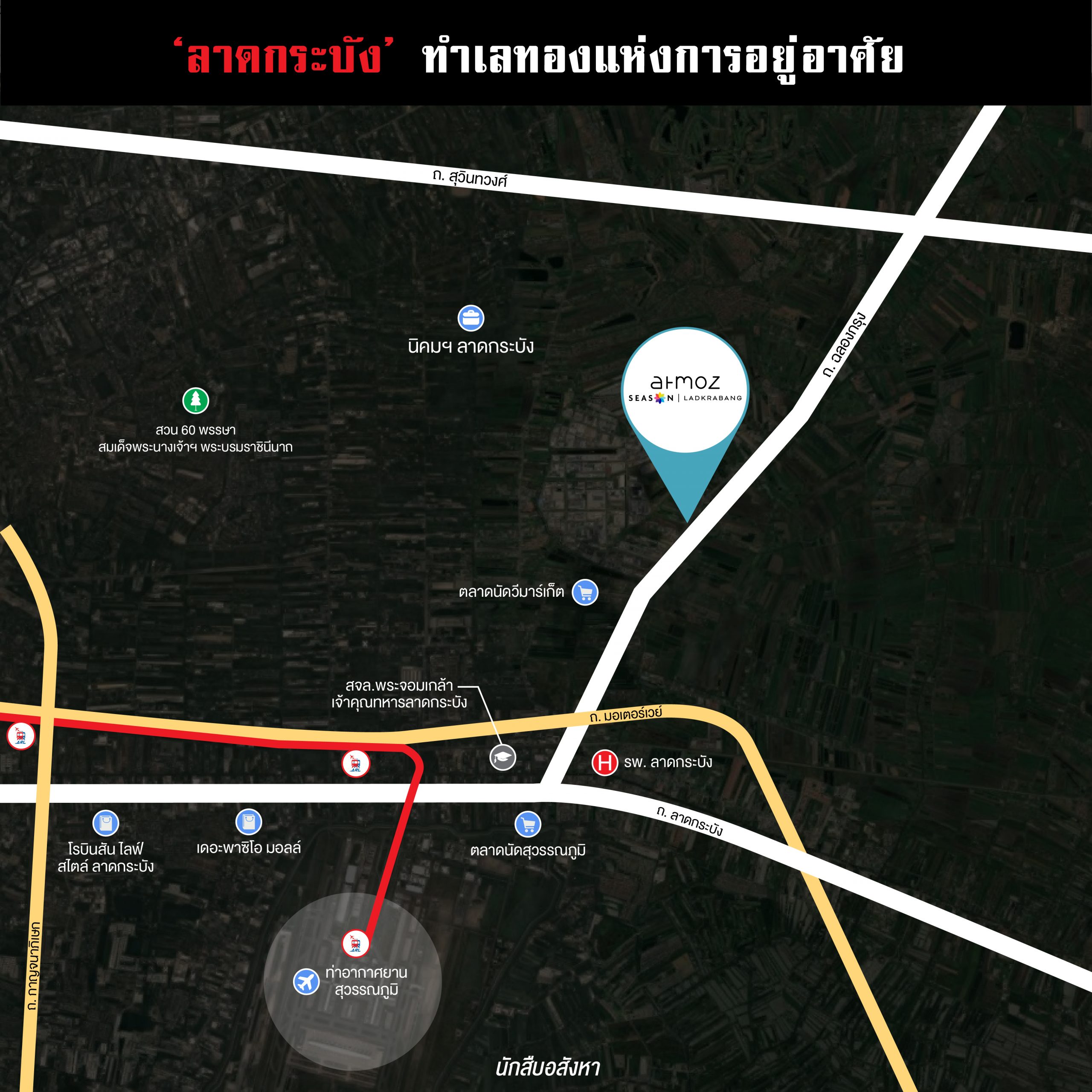 โครงการ Atmoz Season ลาดกระบัง ตั้งอยู่บนถนนฉลองกรุง ทำเลนี้นับว่าเป็นพื้นที่ที่ค่อนข้างลงตัวกับการอยู่อาศัย เพราะตัวโครงการที่ติดถนนใหญ่ ทำให้การเดินทางค่อนข้างสะดวก และจากที่ตั้งโครงการ ขับรถไม่ถึง 5 นาที ก็ถึงแหล่งงานอย่าง นิคมอุตสาหกรรมลาดกระบัง หากเดินทางต่อไปอีกประมาณ 2 นาทีก็ถึง พระจอมเกล้าฯ ลาดกระบัง และแน่นอนครับว่า ทำเลใกล้ทั้งแหล่งงานและสถาบันการศึกษาขนาดใหญ่ โซนนี้จึงค่อนข้างเจริญและเป็นชุมชนที่คึกคักตลอดเวลา มีทั้งตลาด คอมมูนิตี้ใหม่ๆ ร้านค้าปลีก ร้านสะดวกซื้อ ฯลฯ เข้ามามากมาย รองรับการขยายตัวของเมือง และโซนนี้เองมีโครงการที่อยู่อาศัยทั้งแนวราบและแนวสูง เข้ามาปักหมุดอย่างไม่ขาดสาย ก็เพื่อตอบสนองความต้องการผู้อยู่อาศัยที่เข้ามาใหม่