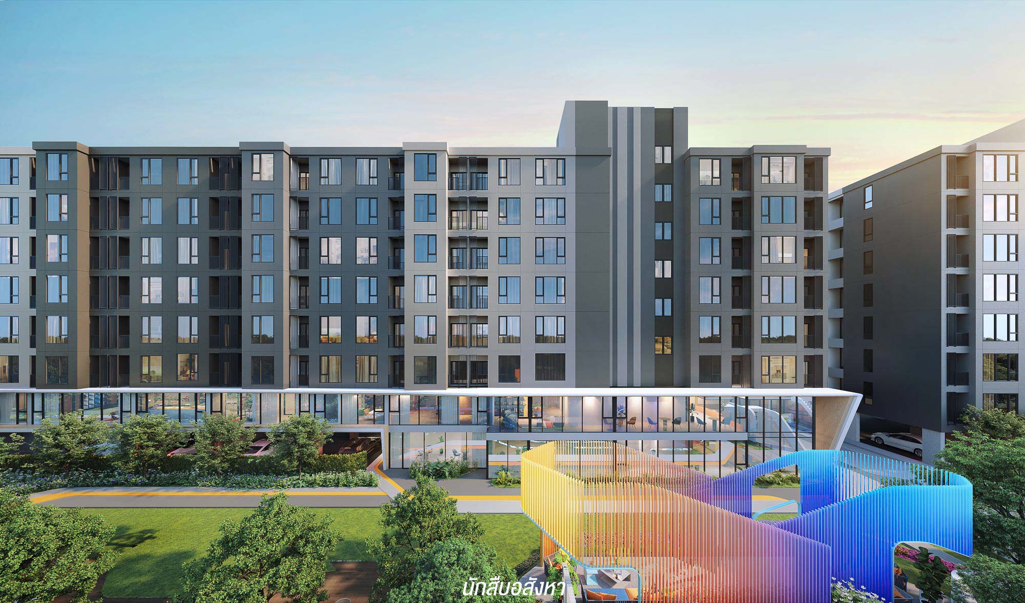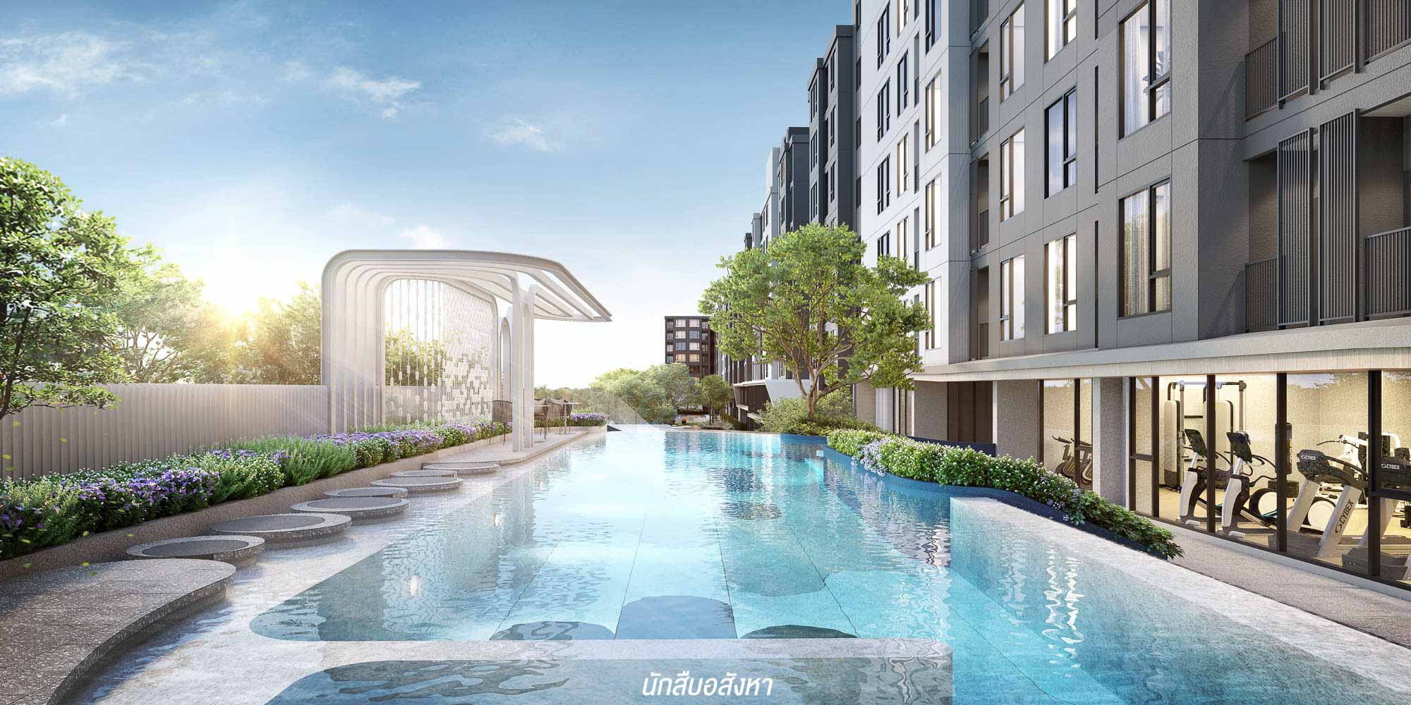 ตัวโครงการเป็นคอนโด Low Rise จำนวน 3 อาคาร สูง 8 ชั้น ราคาเริ่มต้น 1.29 ลบ.* จำนวน 706 ยูนิต จอดรถได้ถึง 41% รวมจอดซ้อนคัน เป็นโครงการที่ไม่ใหญ่มาก เพราะแต่ละอาคารจะมีห้องพักเพียง 2-300 ห้องเท่านั้นครับ ทำให้ได้ความเป็นส่วนตัวพอสมควร และ Facility มีกระจายอยู่ทุกอาคาร ทำให้ลูกบ้านสามารถใช้งานได้ทั่วถึง ซึ่งการวางแปลนตัวอาคารเป็นแถวตรง มีแนวคิดจาก Season Change หรือ ‘ฤดูกาลที่เปลี่ยนแปลง’ และสอดรับกับทิศทางของลมและแสงแดดทำให้การอยู่อาศัยที่ยั่งยืนมากขึ้น นอกจากนี้ Function และสเปกของเฟอร์นิเจอร์ต้องบอกว่า อัปเกรดขึ้นที่นี่ที่แรกด้วย