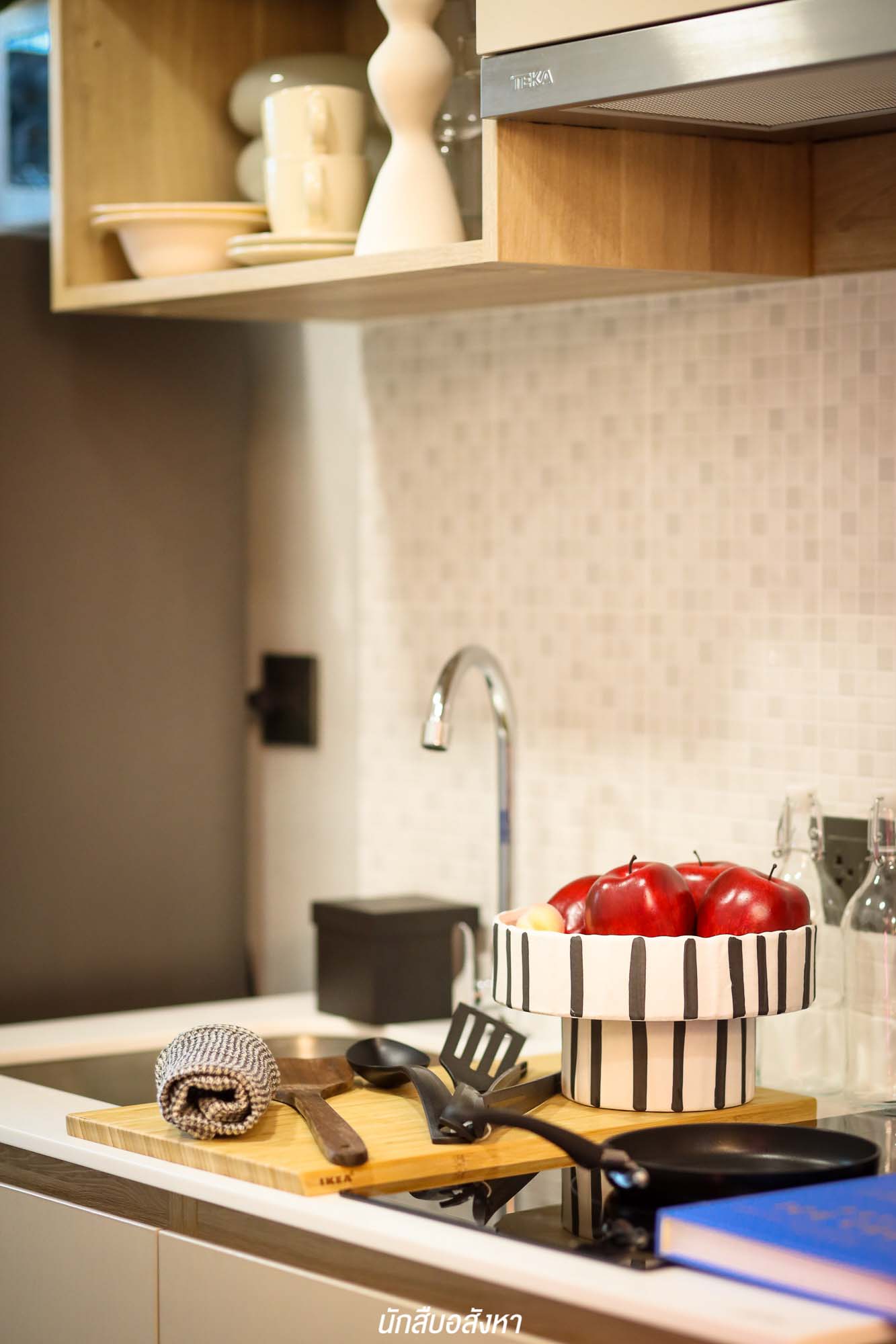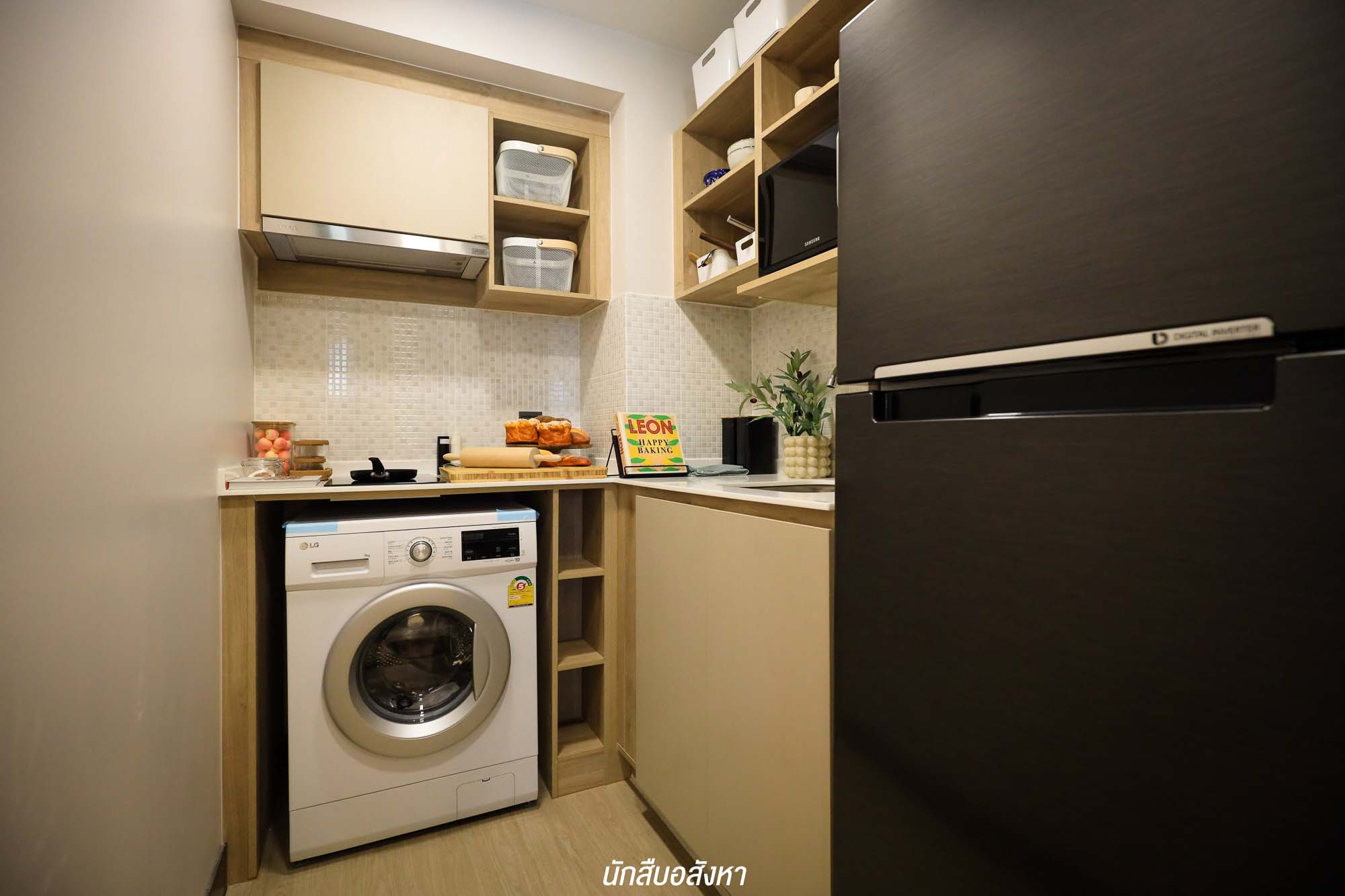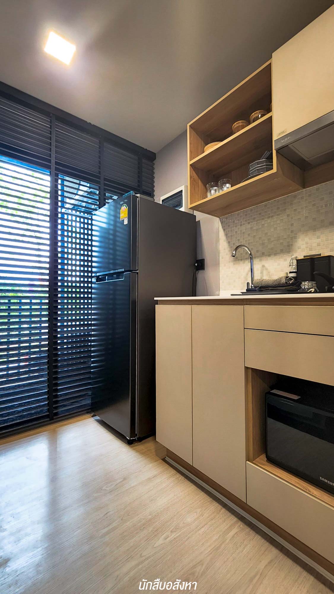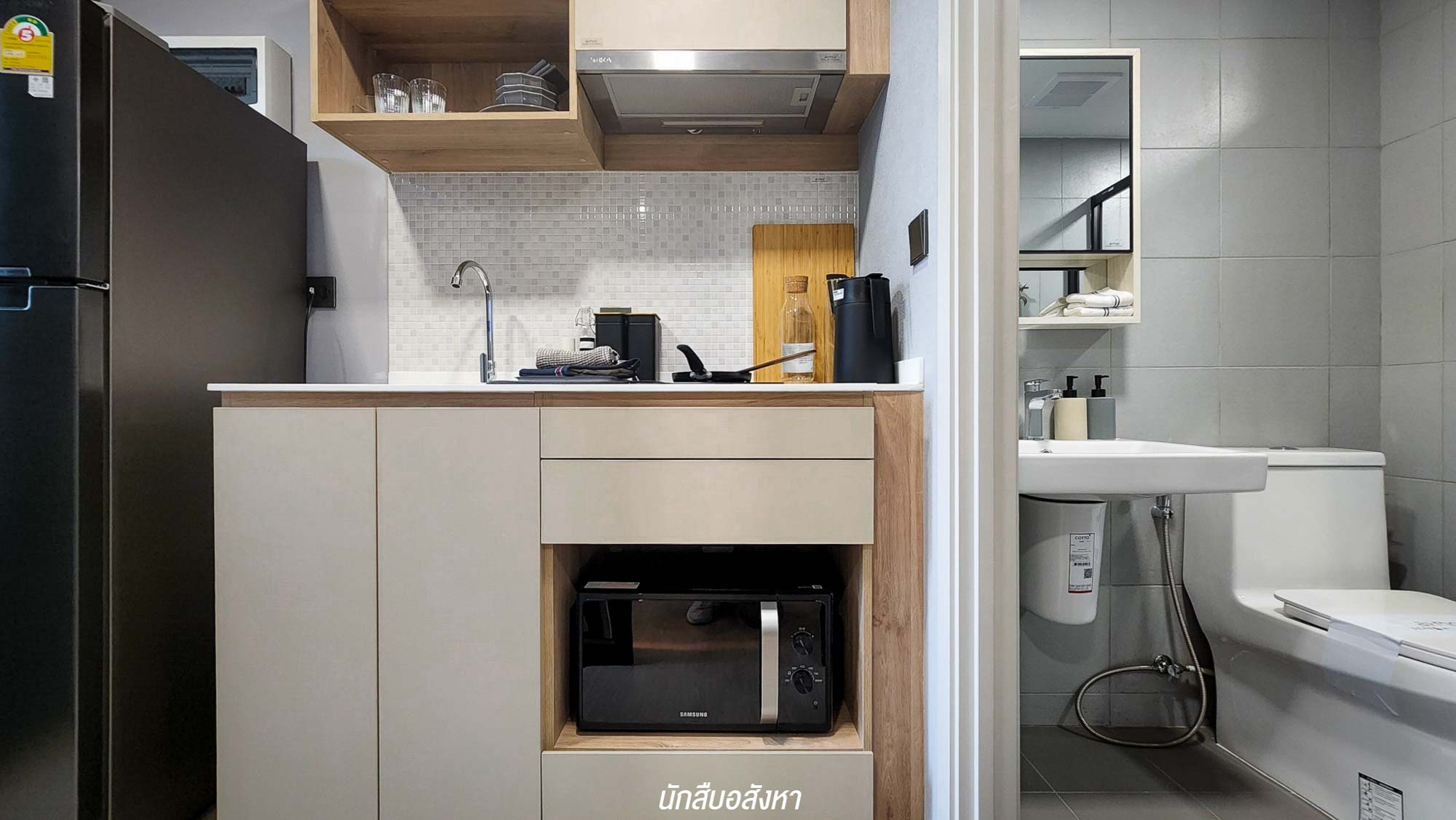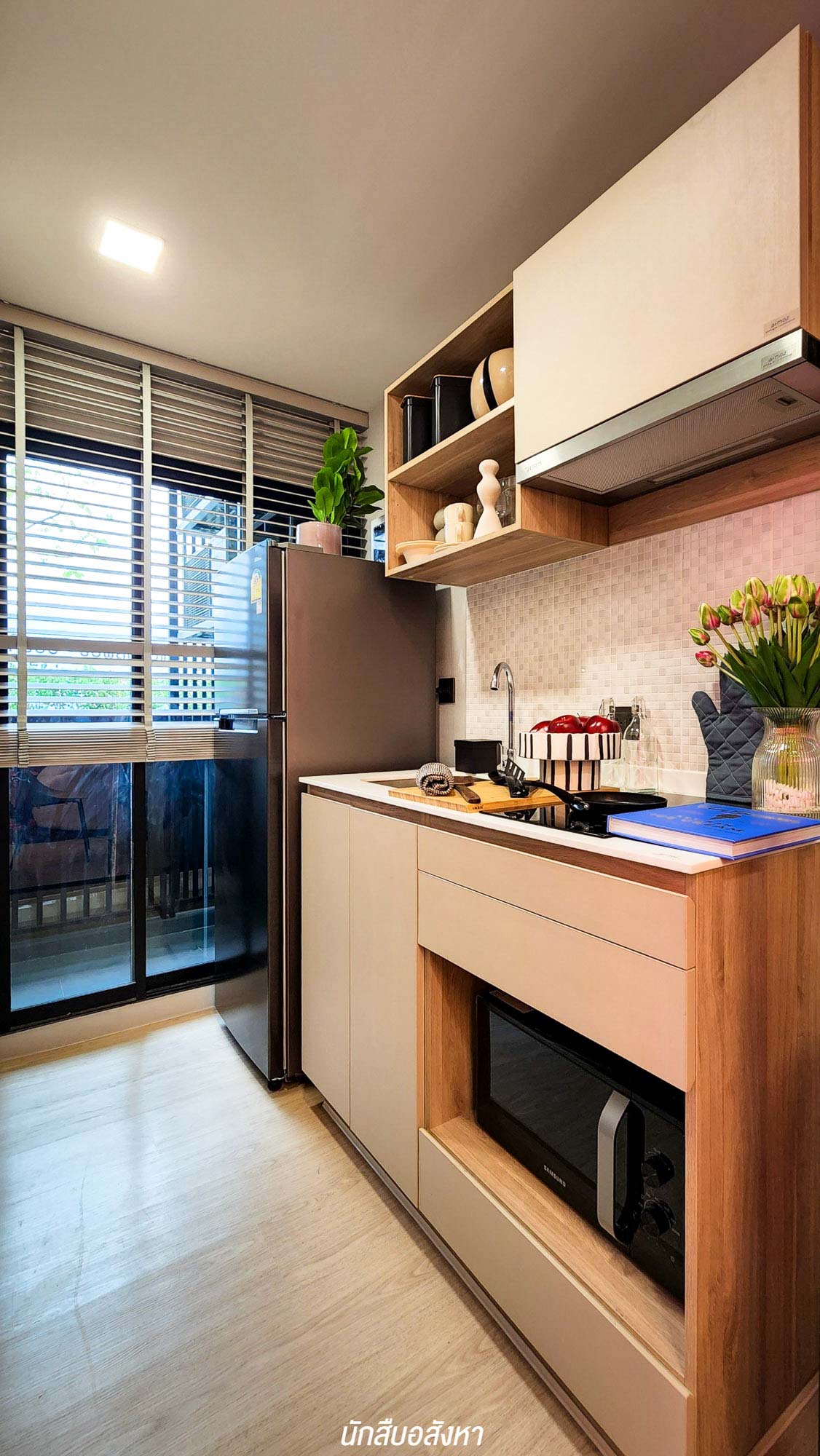 ถัดเข้าไปจะเป็นส่วนของครัวที่ติดกับระเบียง มี Cooker Hood ติดตั้งมาให้ สำหรับใครที่ชอบทำอาหารแต่กังวลเรื่องกลิ่นหายห่วงเพราะ เราสามารถเปิดระเบียงระบายอากาศ บวกกับมีประตูกระจกกั้นโซนชัดเจน ข้าง ๆกันจะเชื่อมต่อไปยังโซนห้องน้ำ ที่แบ่งโซนเปียก และแห้งมาให้พร้อม ซึ่งห้อง 23.50 ตร.ม. วาง Lay Out แบบนี้ทำให้ดูห้องกว้างมาก