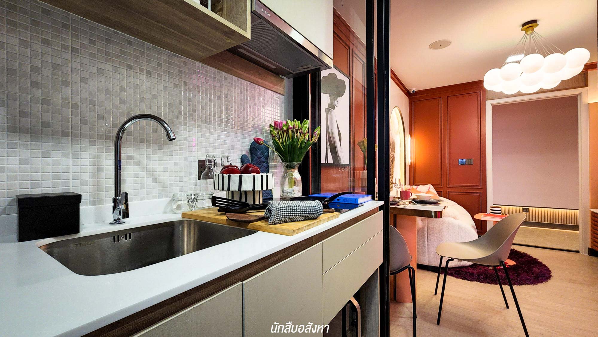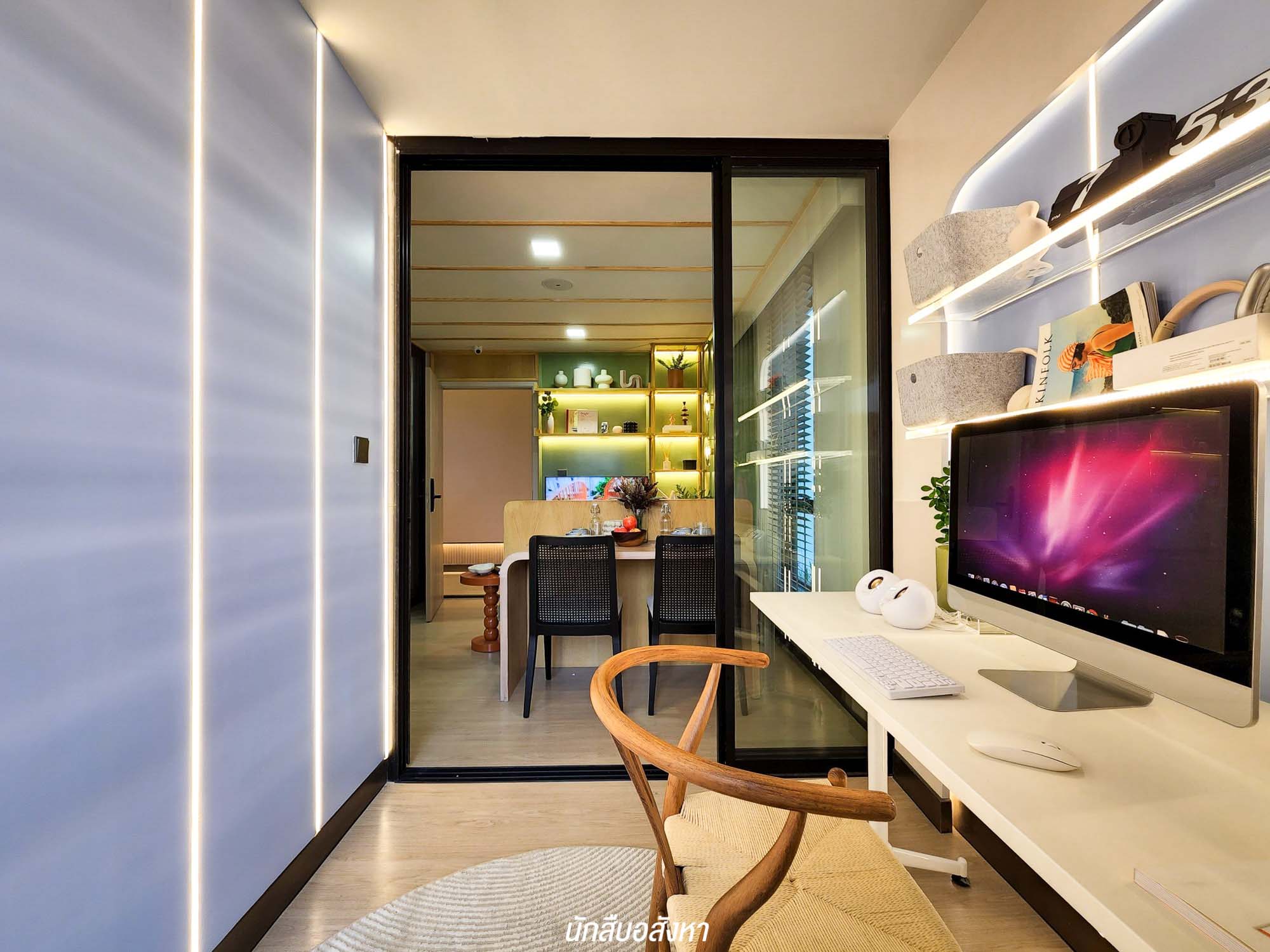 รูปแบบห้องแรก ขนาดห้องกำลังพอดี โซนครัวอยู่ด้านหลังติดระเบียง มีการแบ่งโซนทำครัวด้วยกระจกบานเลื่อนชัดเจน ซึ่งปกติโครงการอื่นครัวจะอยู่ตรงโถงทางเข้าเลย ด้วยขนาดของพื้นที่ที่มีความลงตัว จึงเหมาะกับอยู่คนเดียว และยังตอบโจทย์สำหรับคนที่ชื่นชอบการทำอาหารครับ