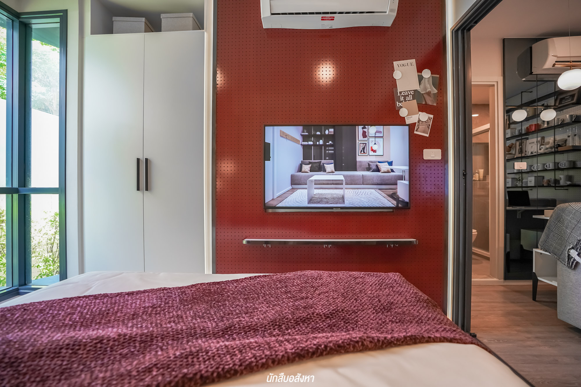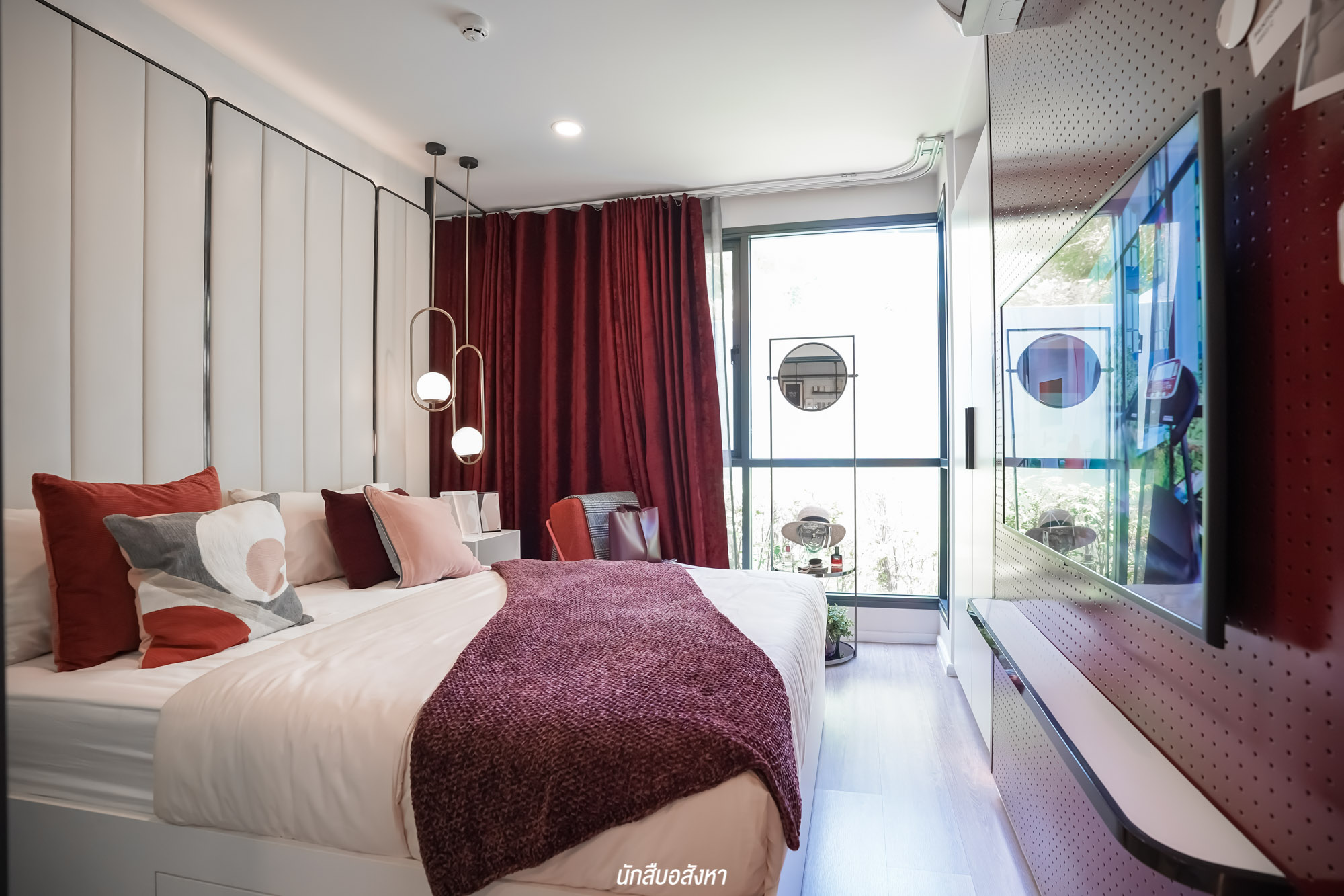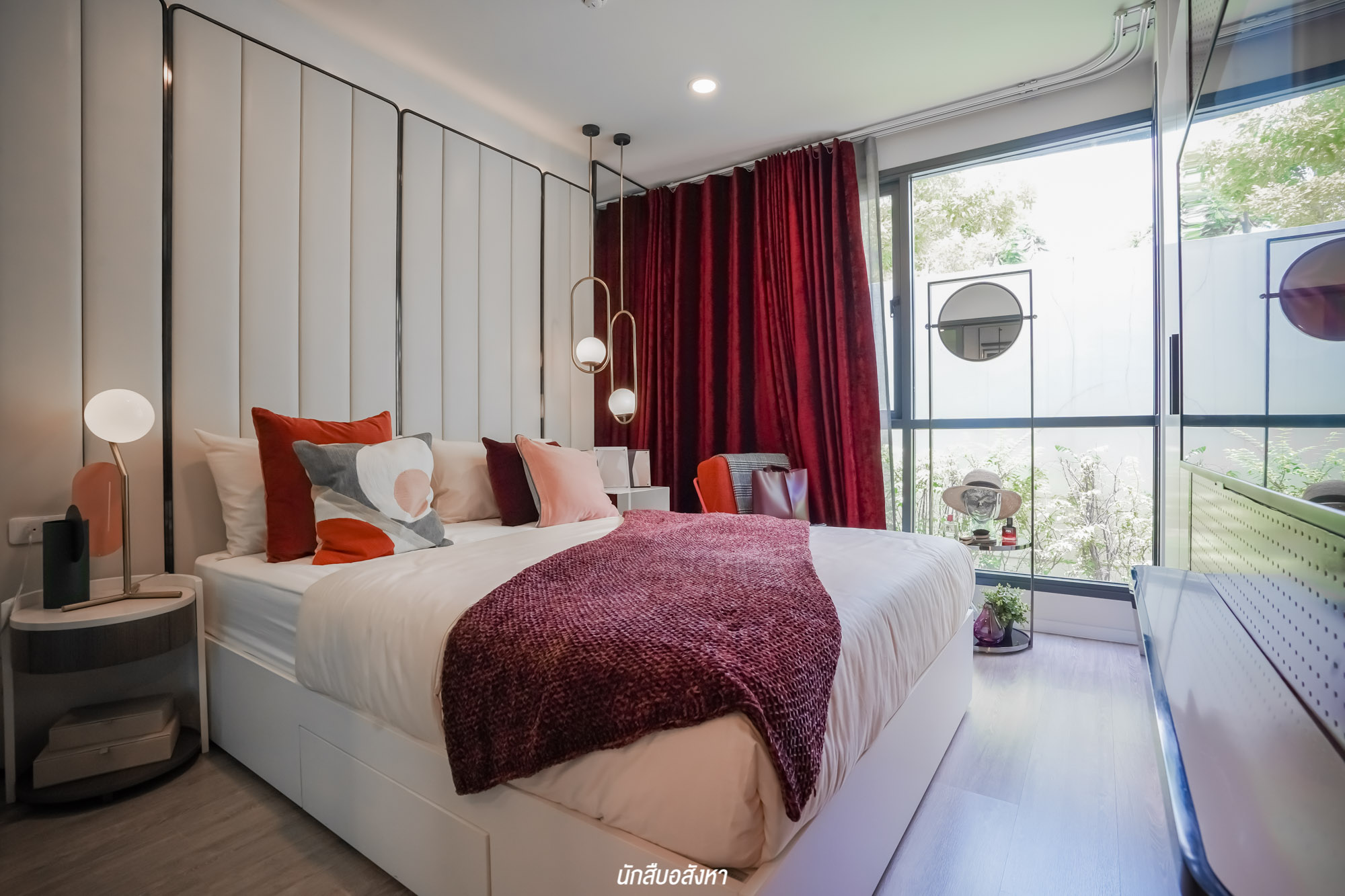 เตียงนอนอยู่ติดกับหน้าต่างบานกว้าง ทำให้ห้องรับแสงแบบเต็ม ๆ ช่วยให้ห้องดูโปร่งโล่ง สบายมากครับ