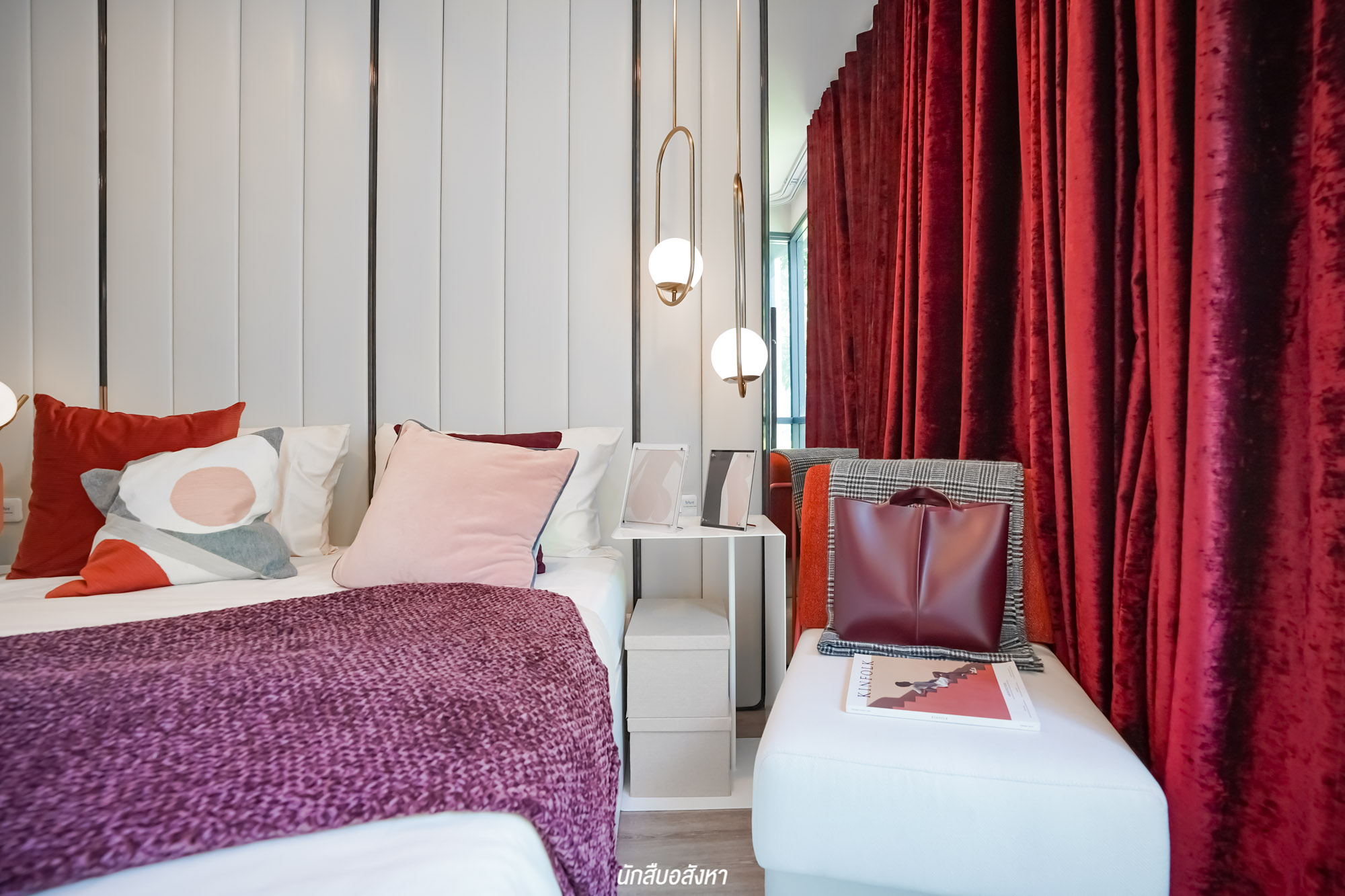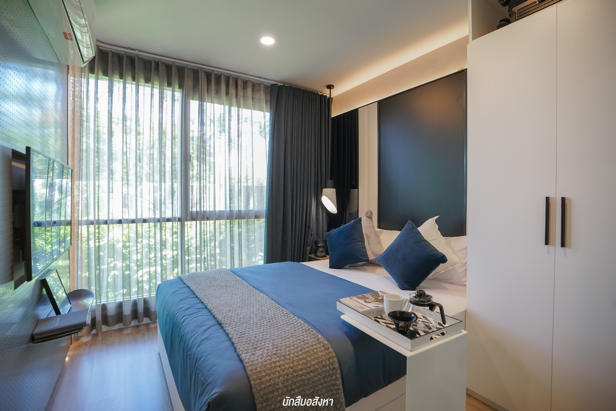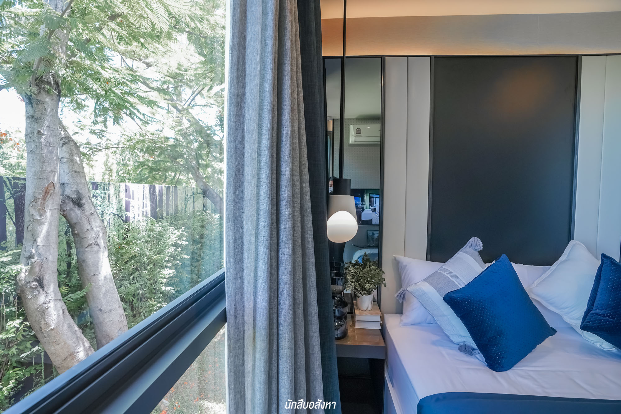 เตียงนอนอยู่ติดกับหน้าต่างบานกว้าง ทำให้ห้องรับแสงแบบเต็ม ๆ ช่วยให้ห้องดูโปร่งโล่ง สบายมากครับ