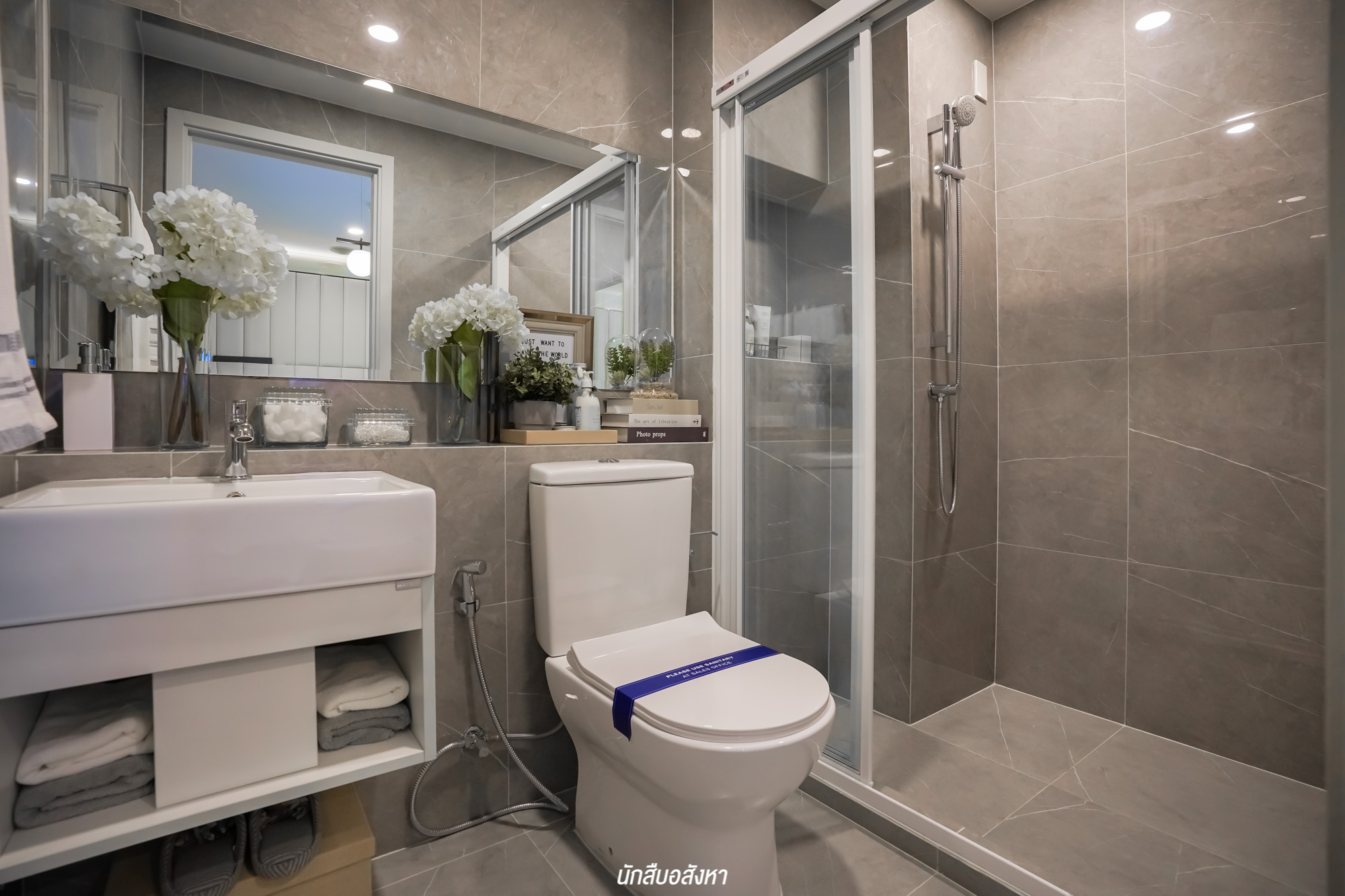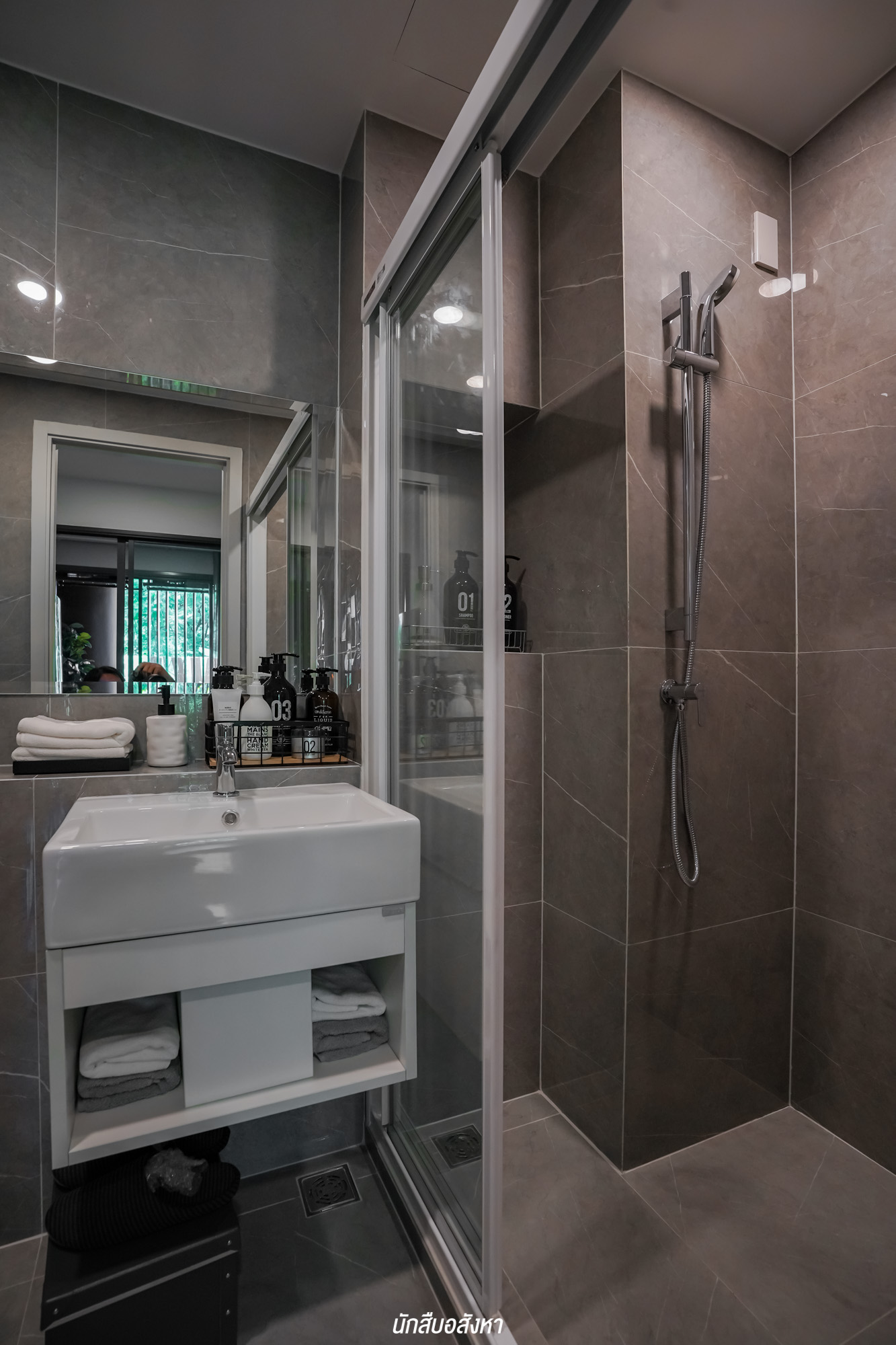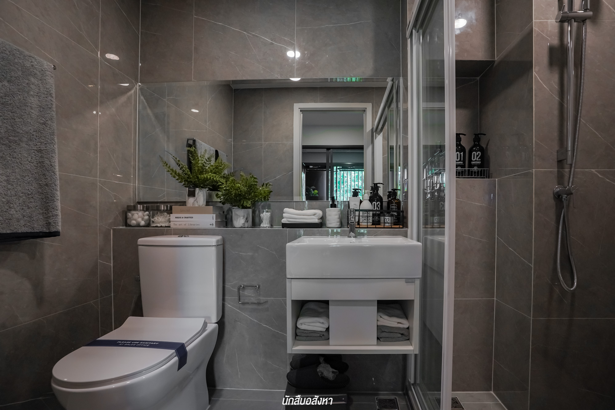 ห้องน้ำมีการแบ่งโซนแห้ง โซนเปียกด้วยฉากกั้นอาบน้ำ อย่างชัดเจน สามารถใช้งานได้อย่างสะดวก