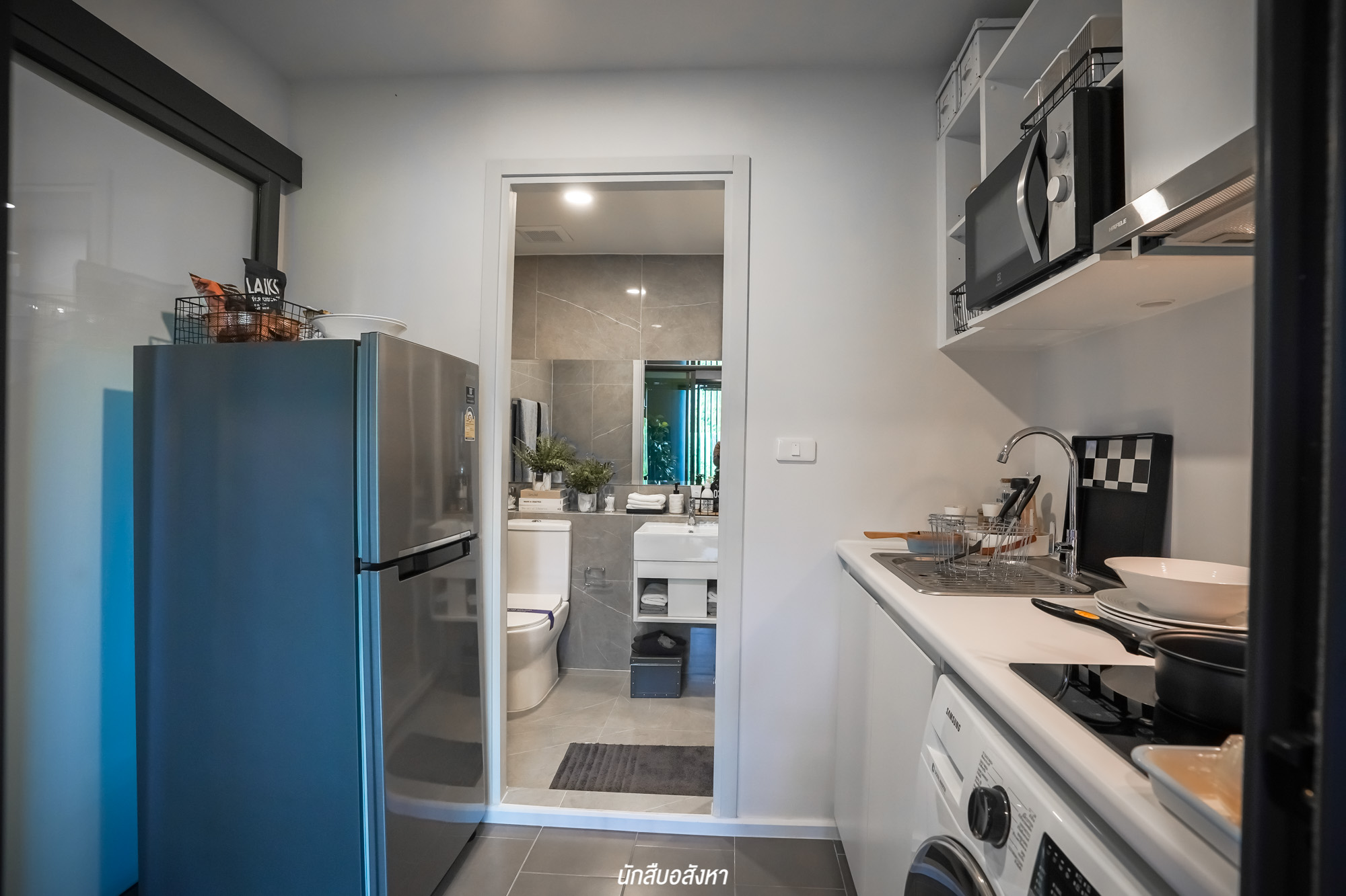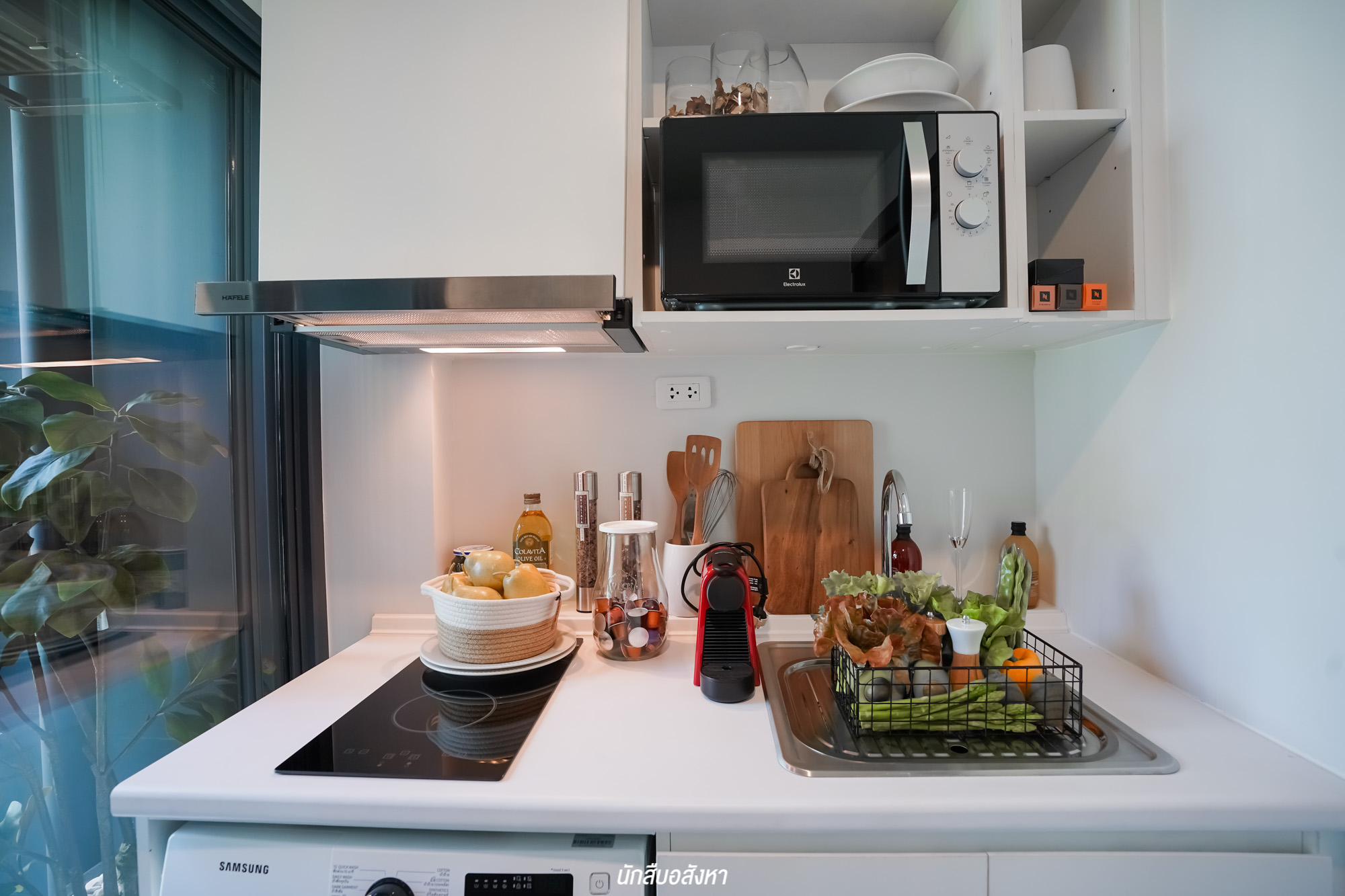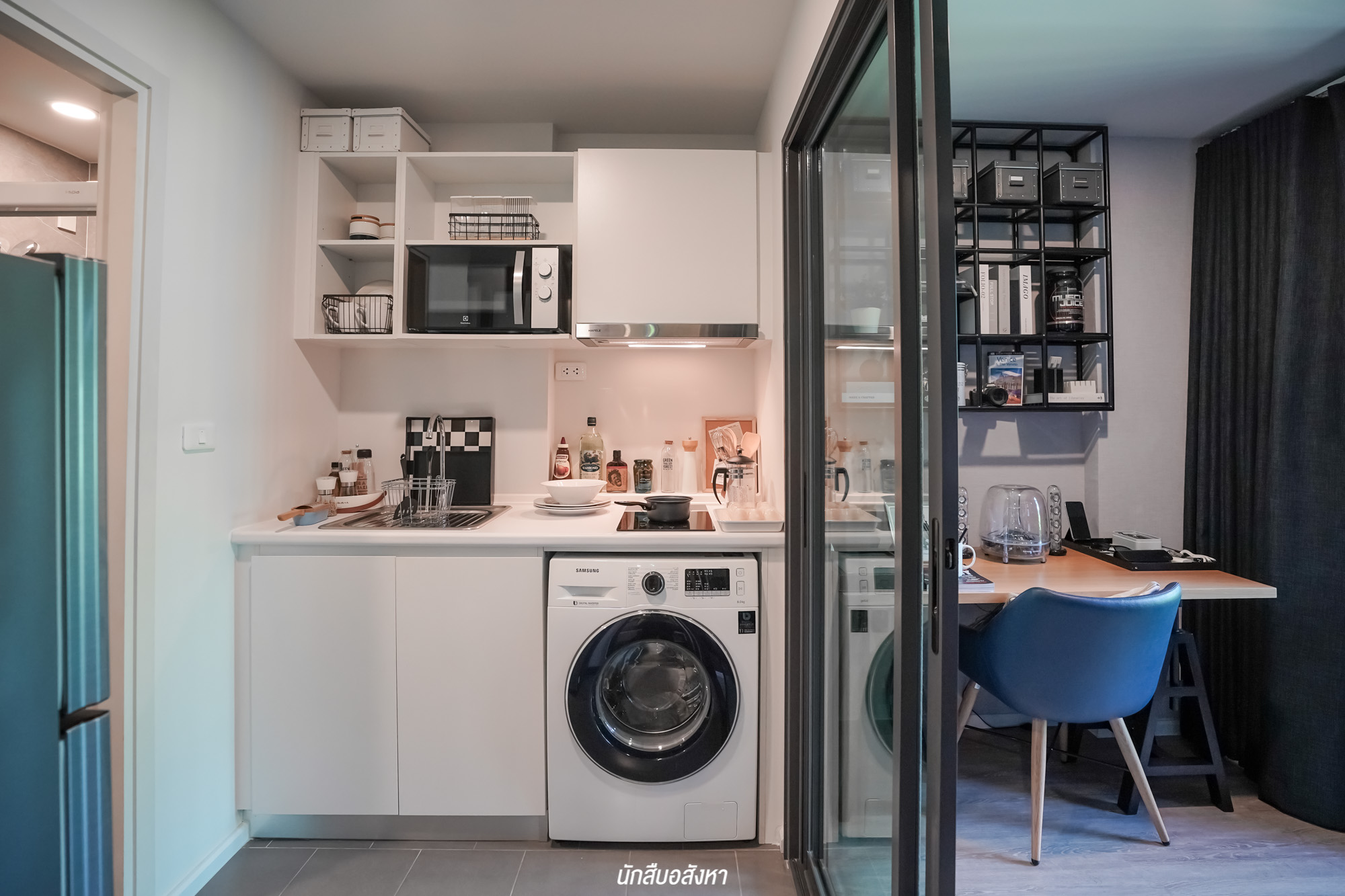 ภายในห้องครัว Built in เคาน์เตอร์แนวยาวมาให้ พร้อมชั้นวางของด้านบน, อ่างล้างจานแบบ 1 หลุม และ Hob Hood จาก HAFELE หรือเทียบเท่า อีกทั้งยังมีช่องด้านล่างสำหรับติดตั้งเครื่องซักผ้าครับ