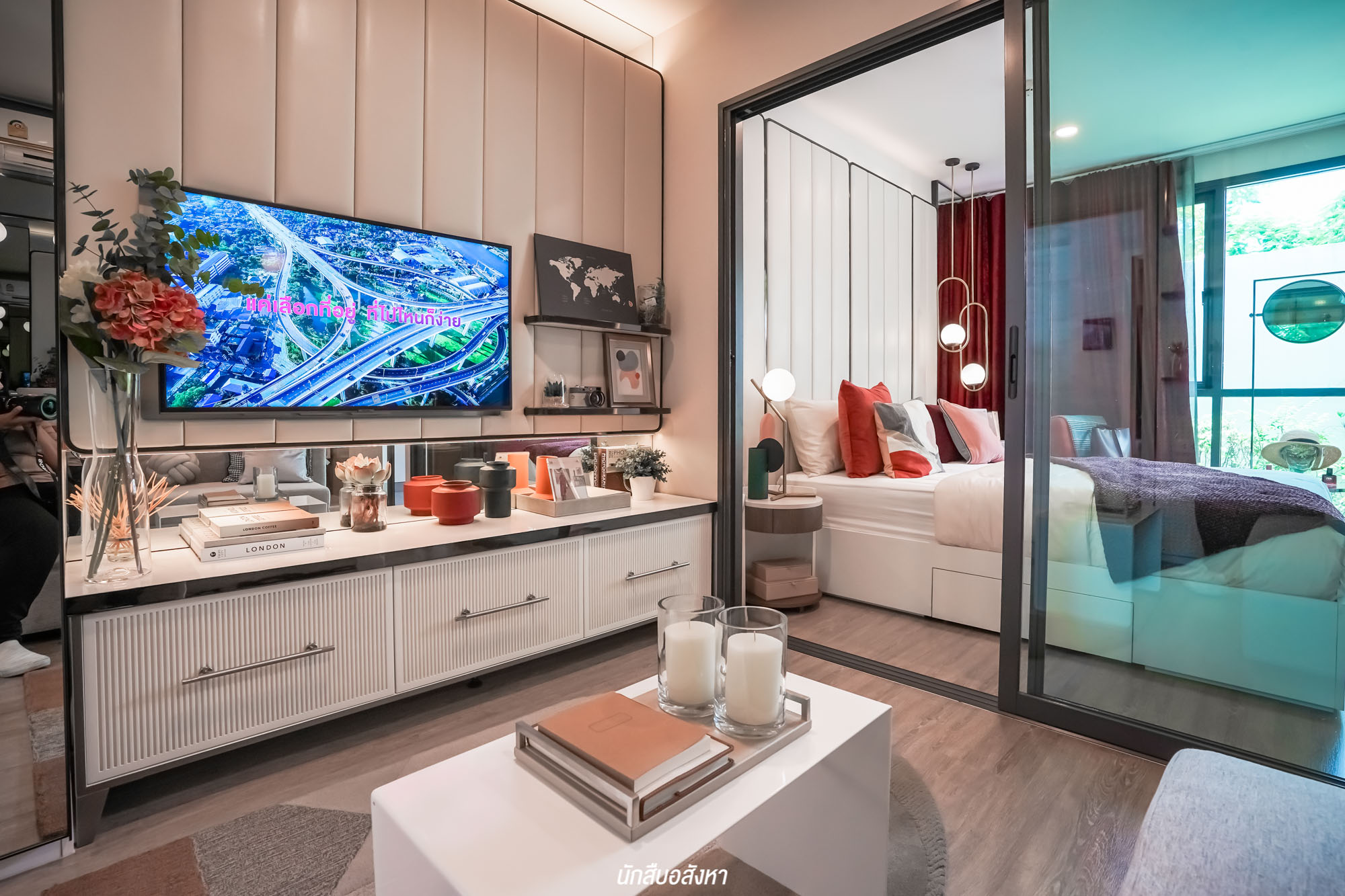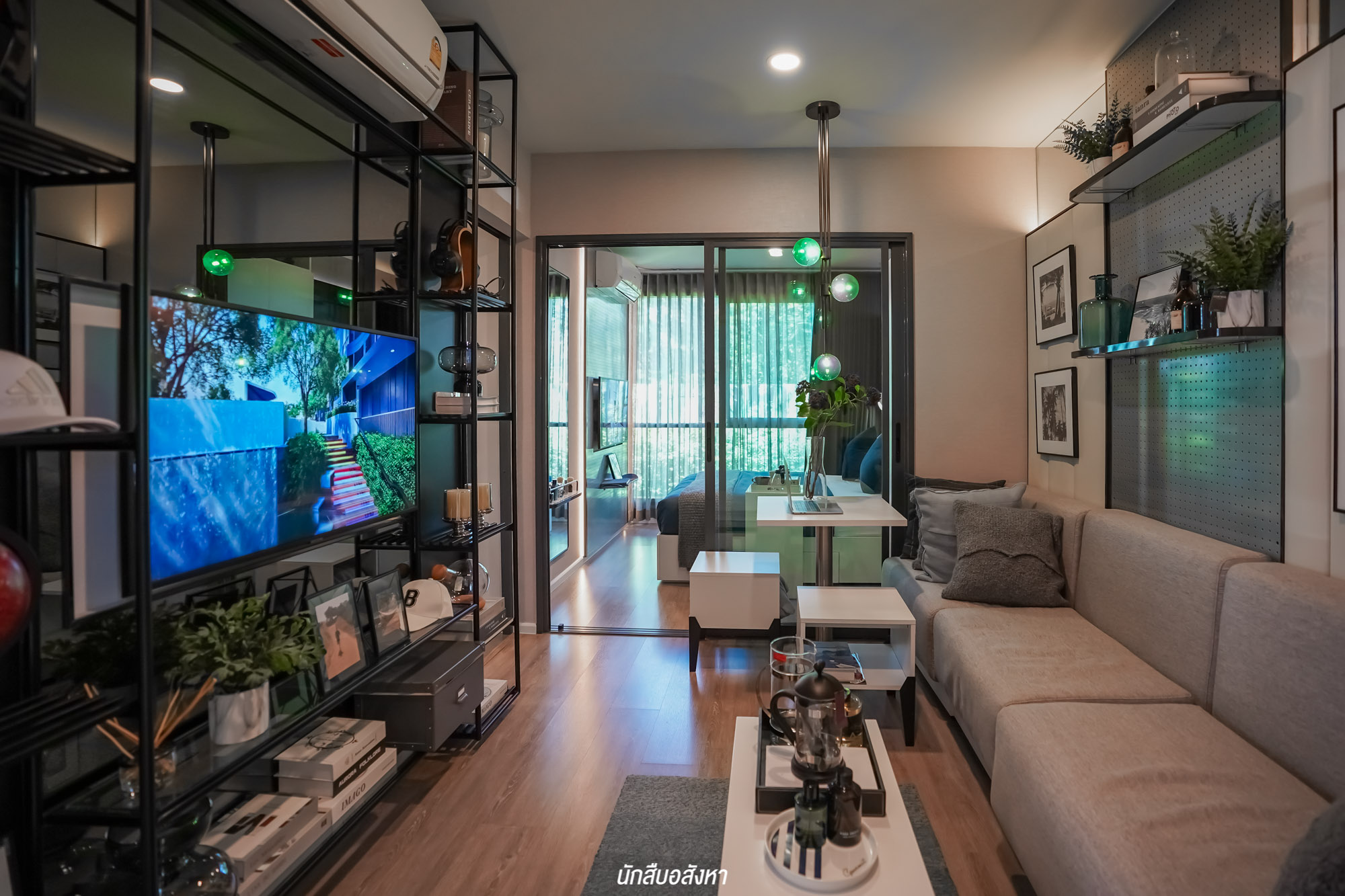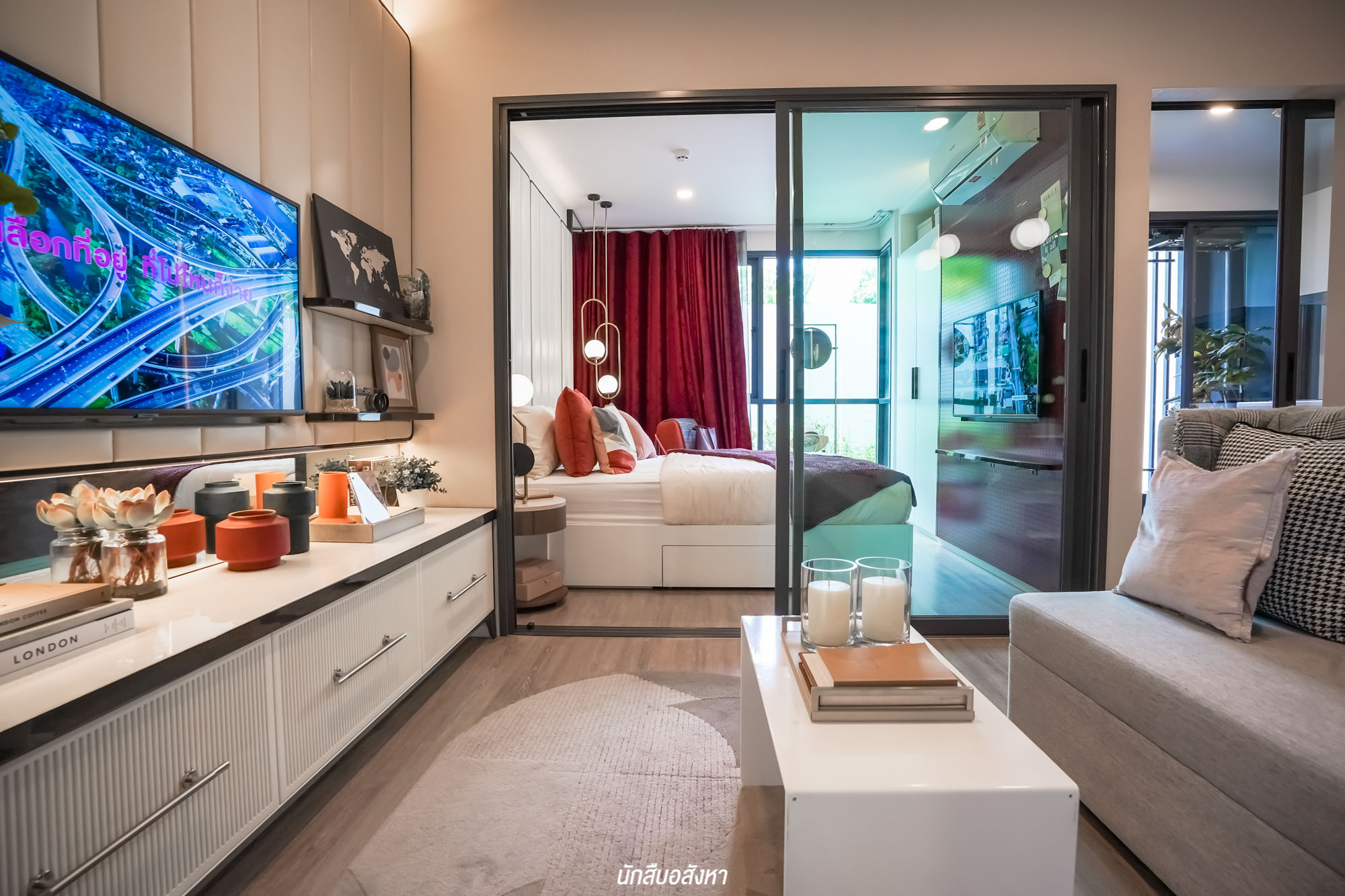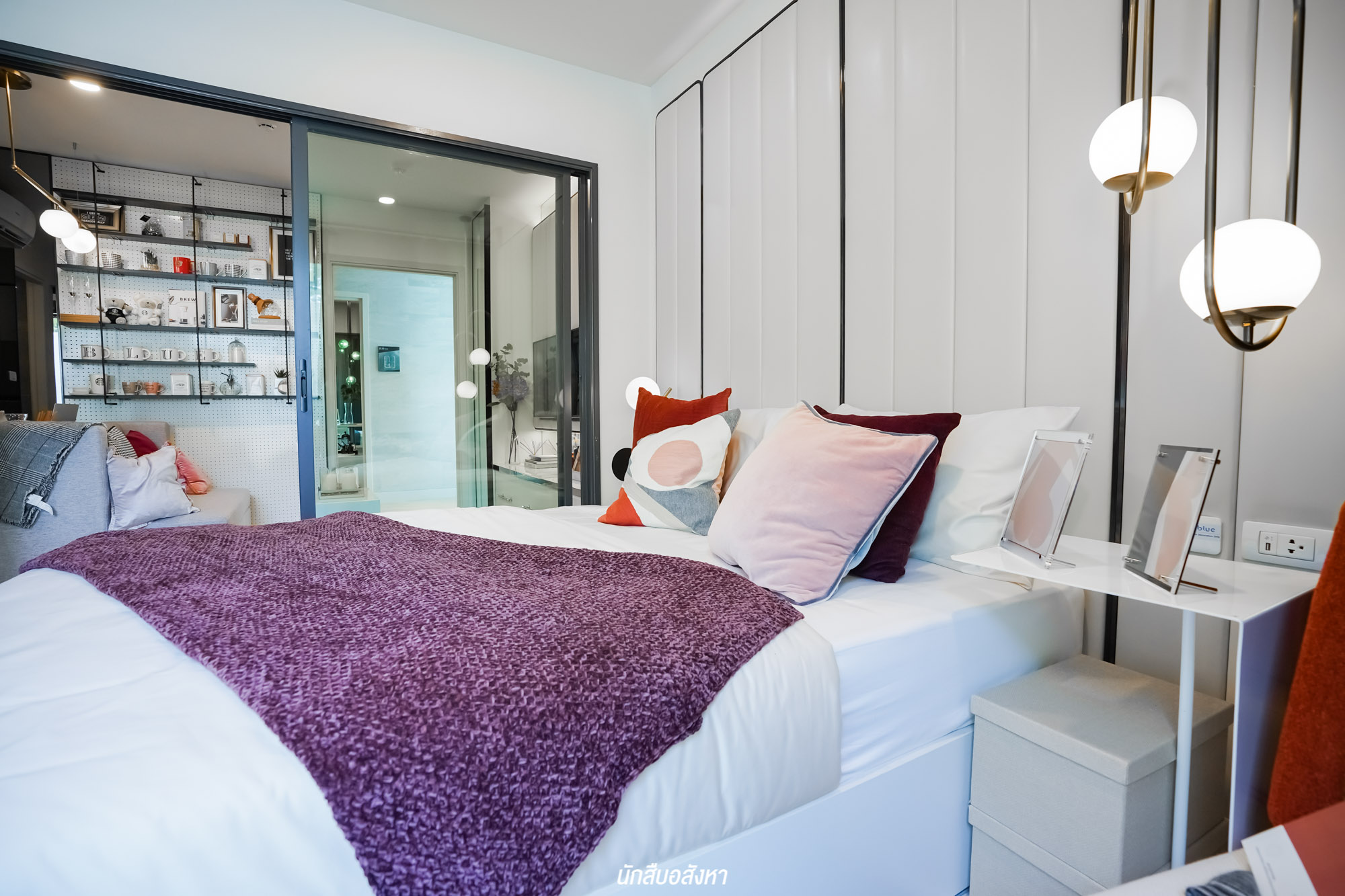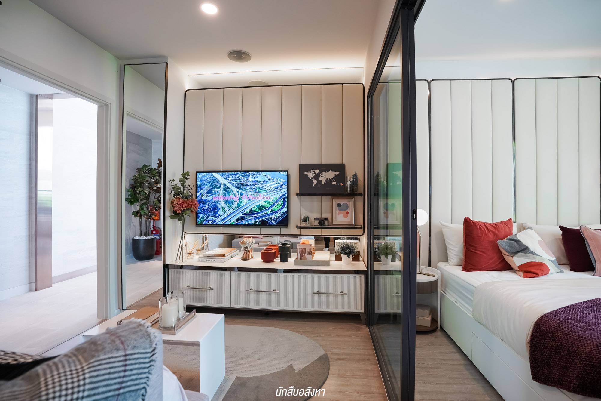 ถัดเข้ามาเป็นห้องนอน โดยกั้นระหว่างโซนนั่งเล่นอย่างเป็นสัดส่วน ภายในห้องกว้างสามารถวางเตียงขนาด 5 ฟุต, ตู้เสื้อผ้า และเหลือพื้นที่ข้างเตียงสำหรับวางโต๊ะข้างเตียงอีกด้วยครับ