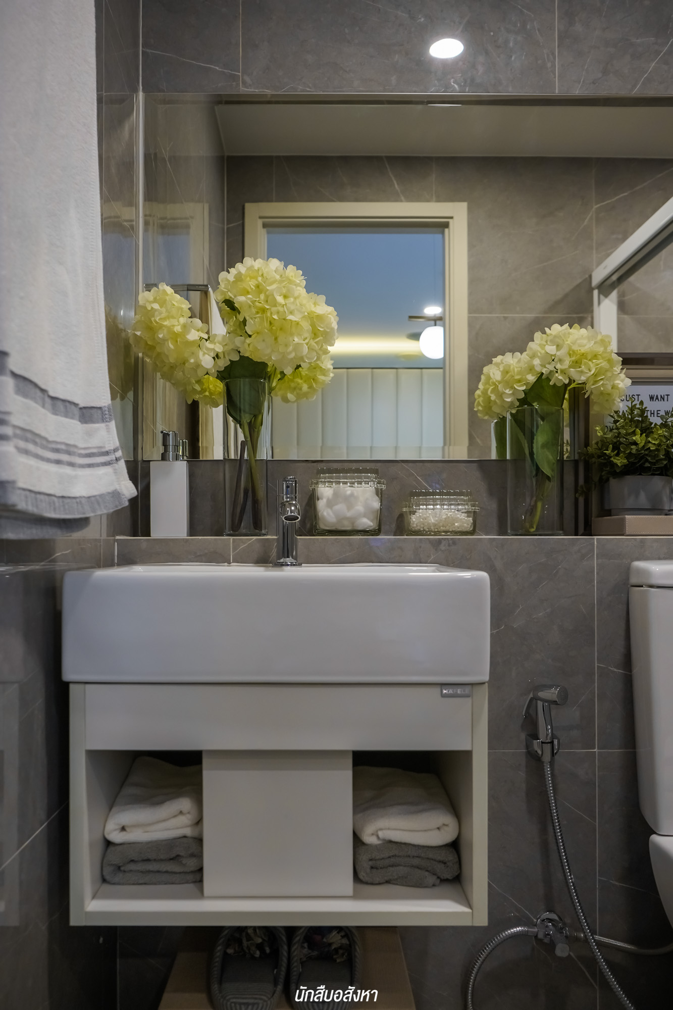 สำหรับห้องน้ำ มีระยะการใช้งานได้อย่างสะดวก ภายในแยกโซนเปียก โซนแห้ง ด้วยฉากกั้นอาบน้ำแบบบานเลื่อน พร้อมโถสุขภัณฑ์, อ่างอาบน้ำ และฝักบัวอาบน้ำ จาก HAFELE หรือเทียบเท่า