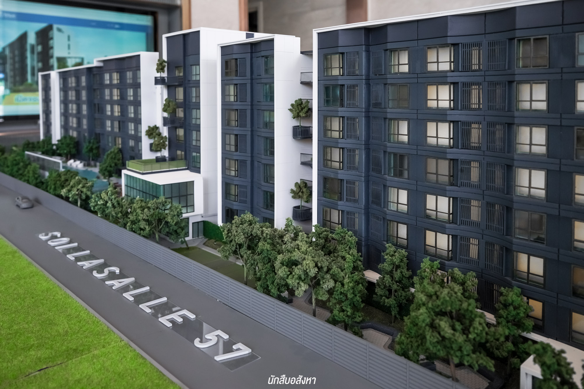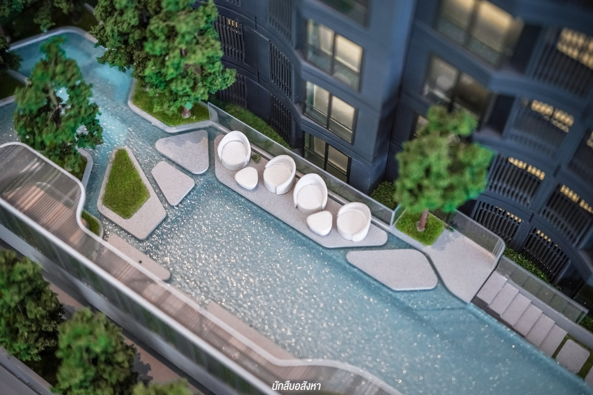 โดยเมื่ออยู่บริเวณพื้นที่ส่วนกลาง จะมองเห็นดีไซน์ตัวอาคารพักอาศัยที่ผนังให้มีองศาเอียงเล็กน้อยดูมีมิติ เหมือนคลื่น และ ถูกออกแบบให้ตัวอาคารคู่ขนานไปกับพื้นที่สีเขียว สอดแทรกไว้ด้วยพื้นที่ส่วนกลาง และกระจายไปตามอาคารทำให้มีความร่มรื่น