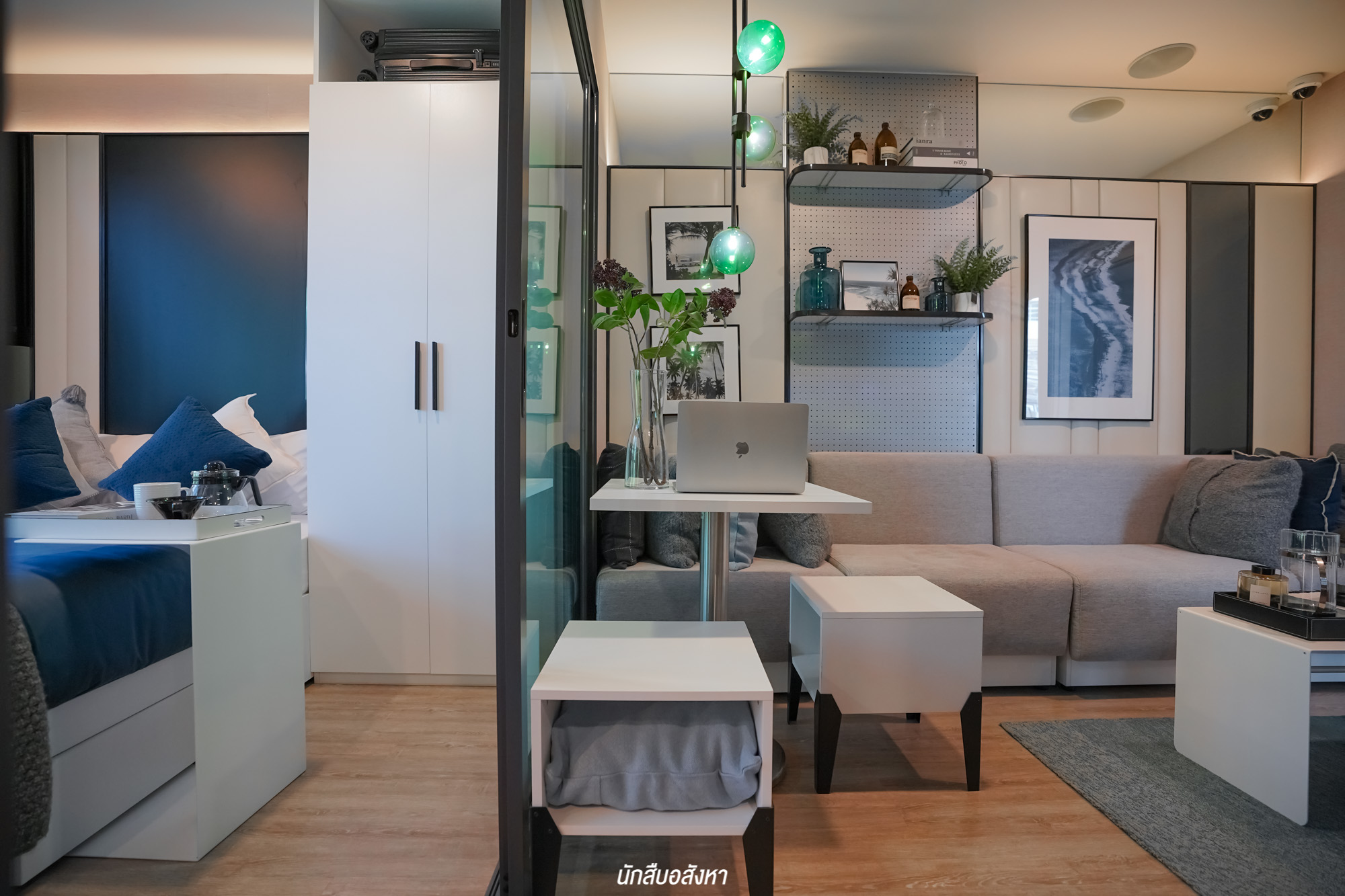 โซฟาและโต๊ะตัวกลางให้ตามแบบในรูปเลยครับ ซึ่งโซฟาสามารถปรับให้เอนนอนได้ครับ และยังสามารถเพิ่มพื้นที่ทำงานจากโซฟา ที่เป็น Adaptive Furniture ออกแบบเองจากโครงการ blue มาเพื่อรองรับกับพื้นที่ให้เกิดความคุ้มค่ามากที่สุด