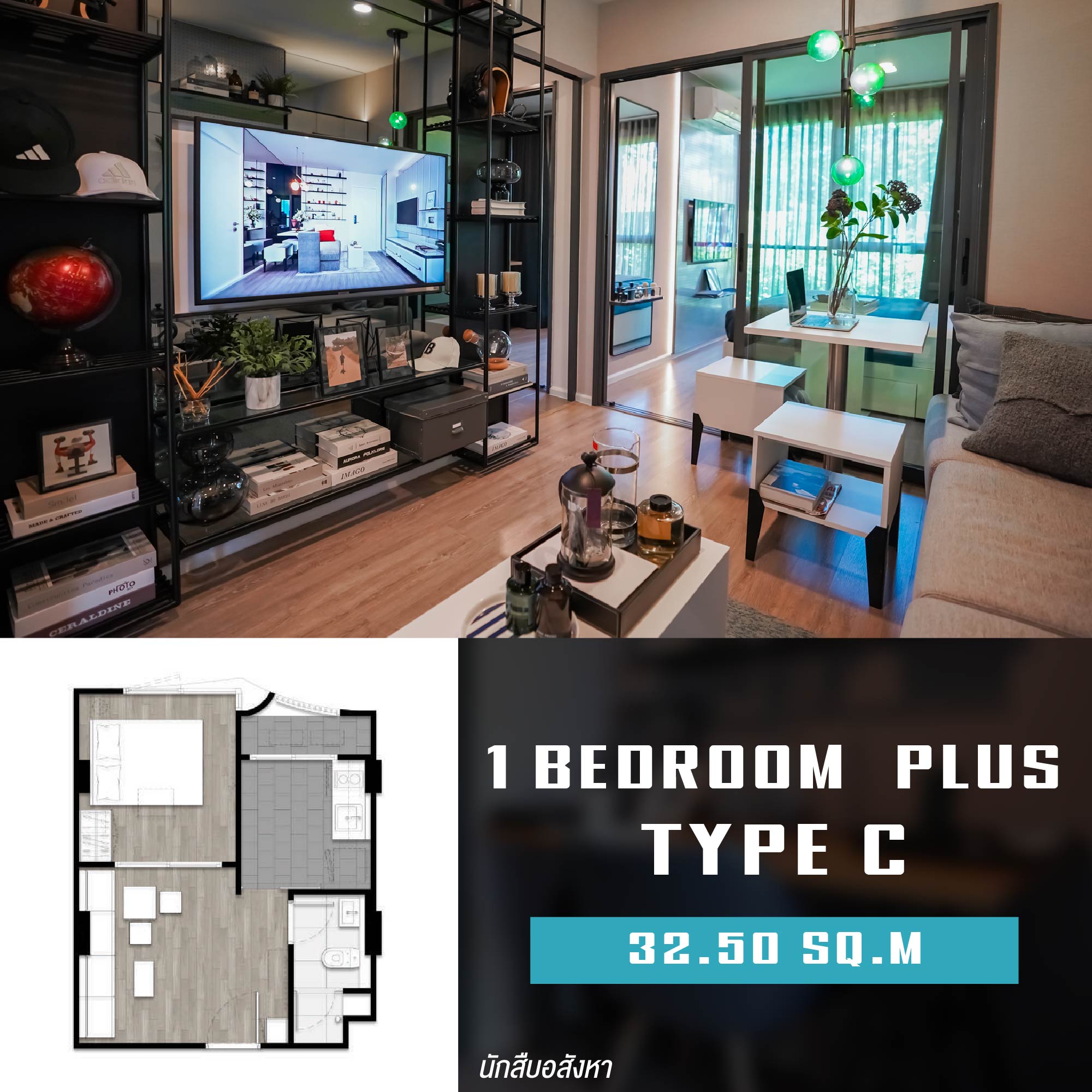 ห้องถัดมา กับ 1 Bedroom Plus Type ขนาดพื้นที่ 32.50 ตร.ม. โดยห้อง Type นี้จะมีห้องอเนกประสงค์ครับ รองรับการปรับเปลี่ยนได้ตามไลฟ์ไตล์ และ Layout ห้องยังมีการแบ่งจัดสรรพื้นที่อย่างเป็นสัดสรรอีกด้วยครับ