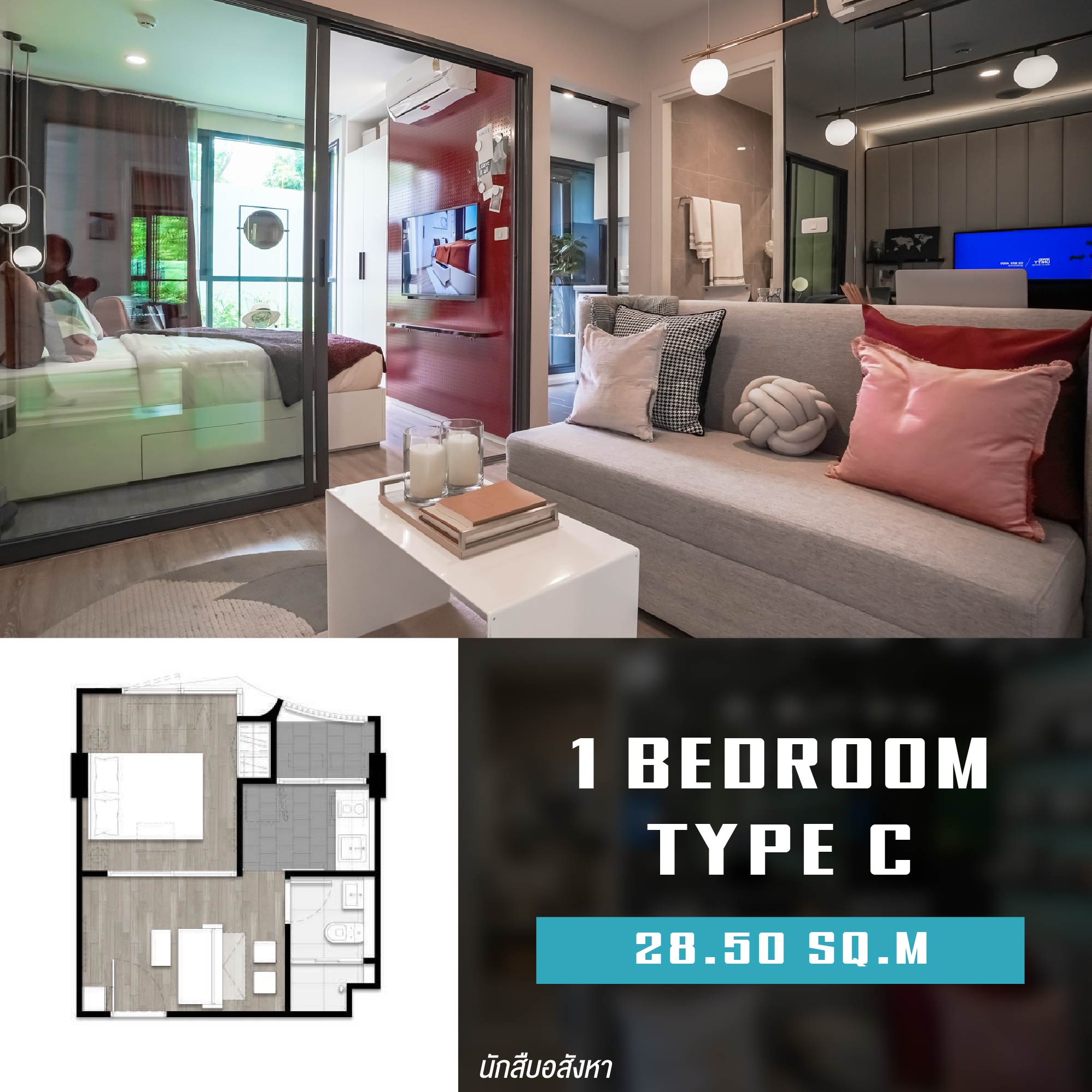 เริ่มต้นด้วยห้อง 1 Bedroom Type ขนาดพื้นที่ 28.50 ตร.ม. ภายในห้องมี Layout ห้องหน้ากว้าง อย่างเป็นสัดส่วน แบ่งพื้นที่ชัดเจน อยู่ 1-2 คนสบายๆ ที่สำคัญคือได้ครัวติดระเบียง เหมาะสำหรับคนที่ชื่นชอบการทำอาหารครับ
