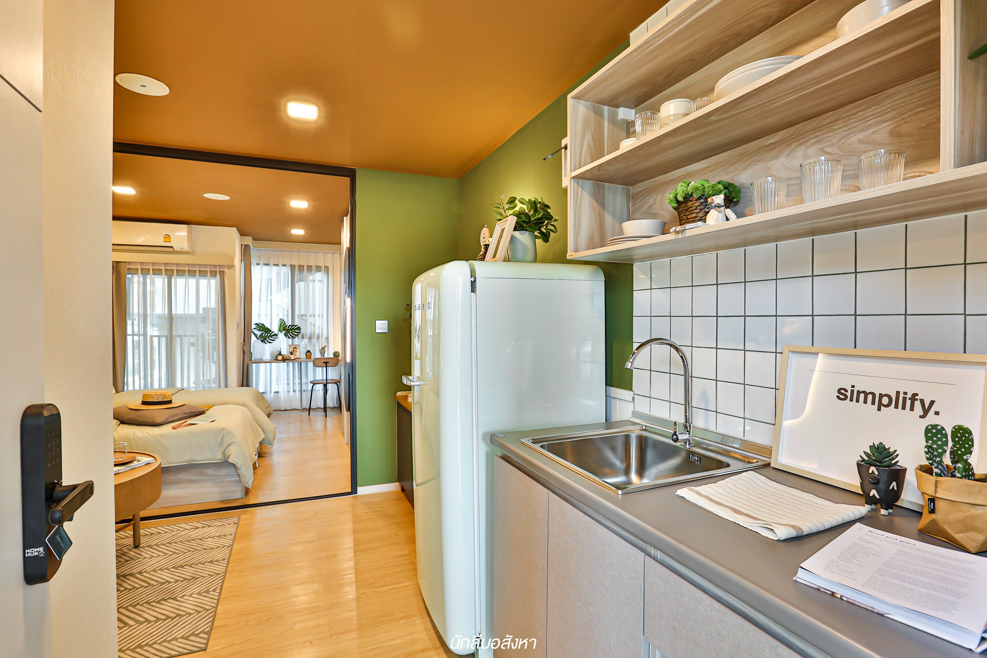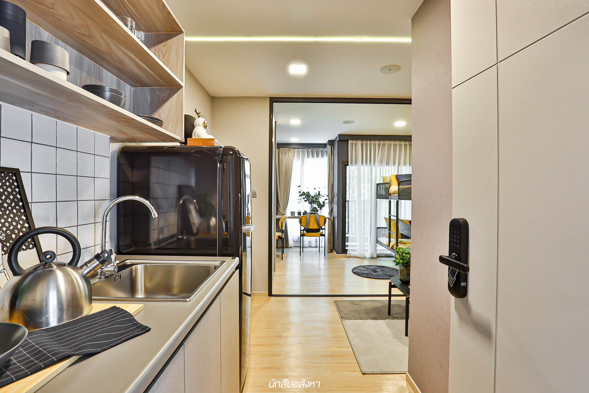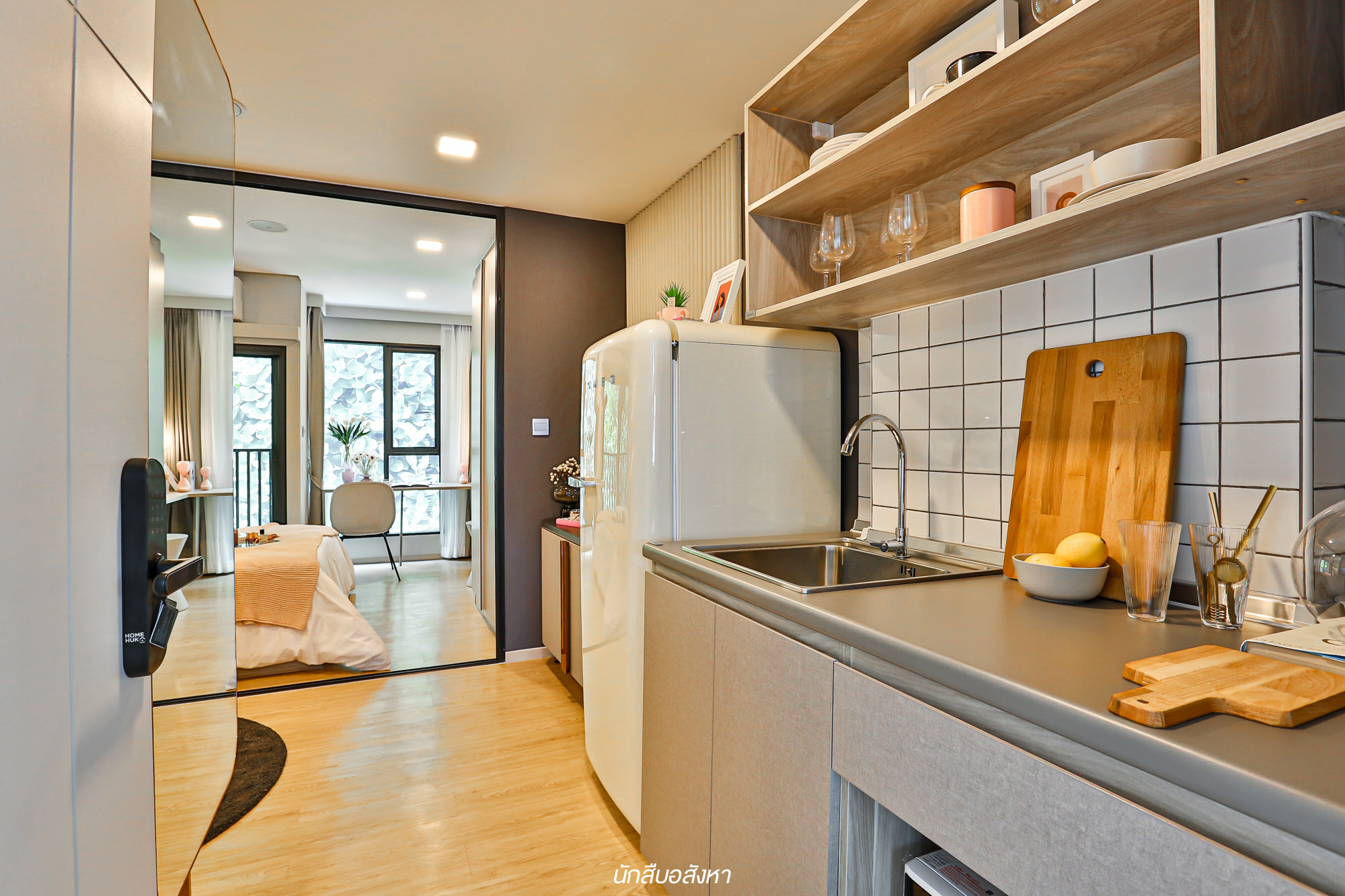 เราลองมาดูห้องตัวอย่างที่ 2 กันบ้างครับ สำหรับห้อง 1 Bedroom Extra ขนาด 27.36 ตร.ม. พื้นที่ใช้สอยห้องนี้จะจัดเต็มมากยิ่งขึ้นครับ ซึ่งโซนแรกที่เปิดห้องเข้ามาก็จะยังคงเป็นส่วนของห้องครัว และฝั่งตรงข้ามก็จะเป็นห้องน้ำที่แยกโซนแห้ง โซนเปียกไว้เป็นสัดส่วน ตัวสุขภัณฑ์เป็นแบรนด์มาตรฐาน