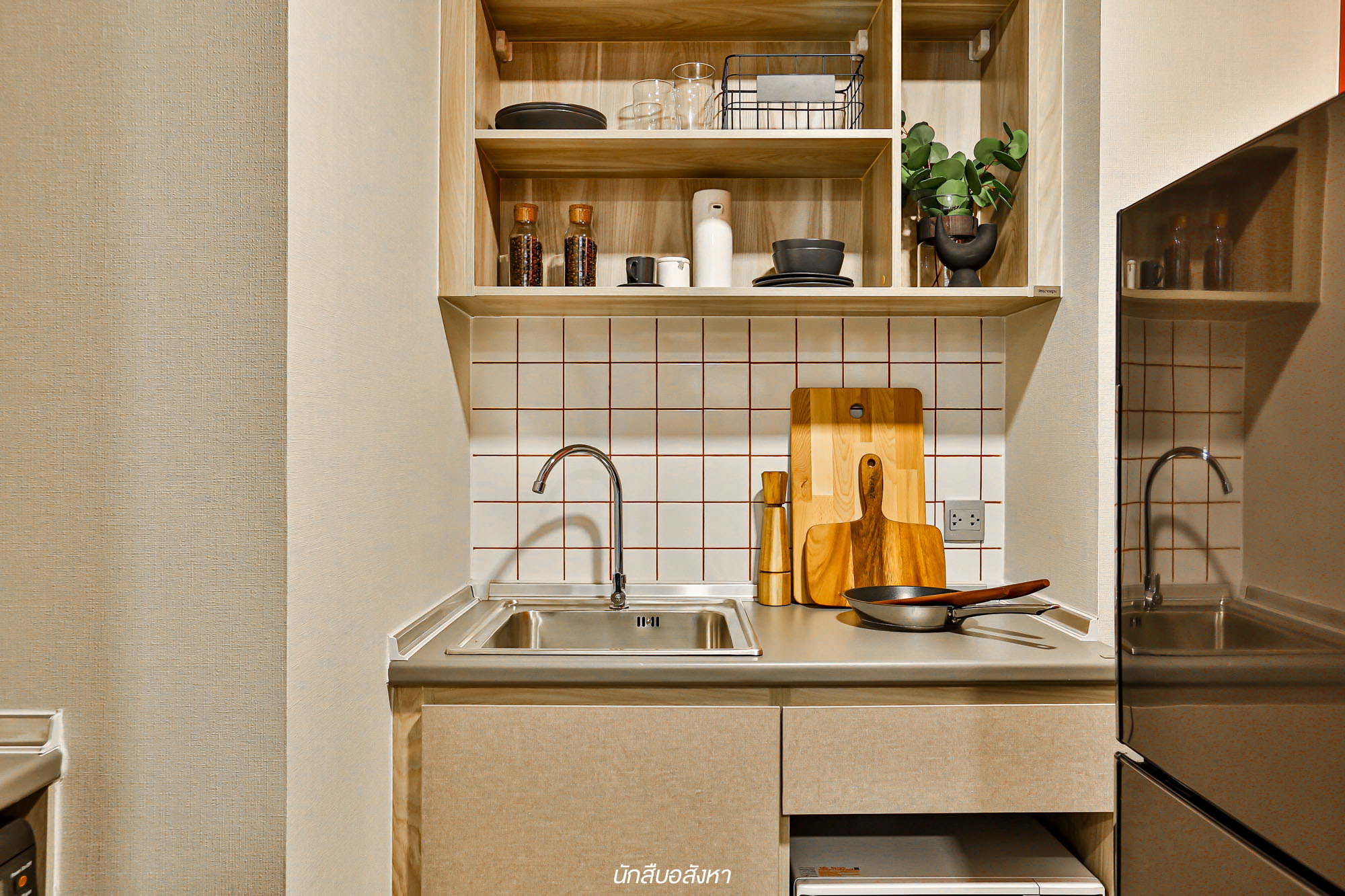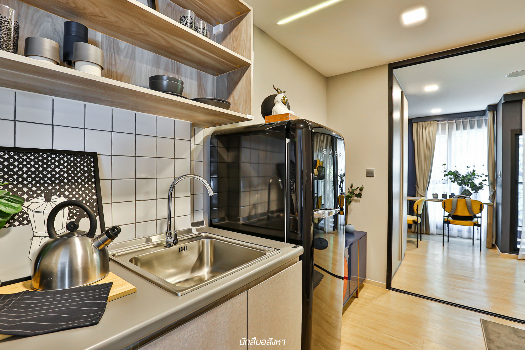 สำหรับรูปแบบนี้ต้องบอกก่อนครับว่าทางโครงการตกแต่งมาเพื่อเป็นไอเดียให้กับลูกบ้านนั่นเอง ซึ่งไอเดียนี้ผมชอบนะครับ เพราะว่าพื้นที่ใช้สอยภายในห้องนั้นค่อนข้างเหลือเยอะเลยครับ สำหรับห้องนี้เมื่อเปิดประตูเข้ามาจะเจอกับพื้นที่ของครัวเปิดก่อนครับ ซึ่งทางโครงการตกแต่งครัวมาเป็นแบบ I – Shape Kitchen เป็นฟังก์ชันที่ค่อนข้างลงตัวกับพื้นที่เล็กๆ ให้เหลือพื้นที่ใช้สอยมากยิ่งขึ้น ผมมองว่าพื้นที่ในส่วนของครัวค่อนข้างกว้างเลยนะครับ แม้ว่าห้อง Type นี้จะเป็น Type เล็กก็ตาม