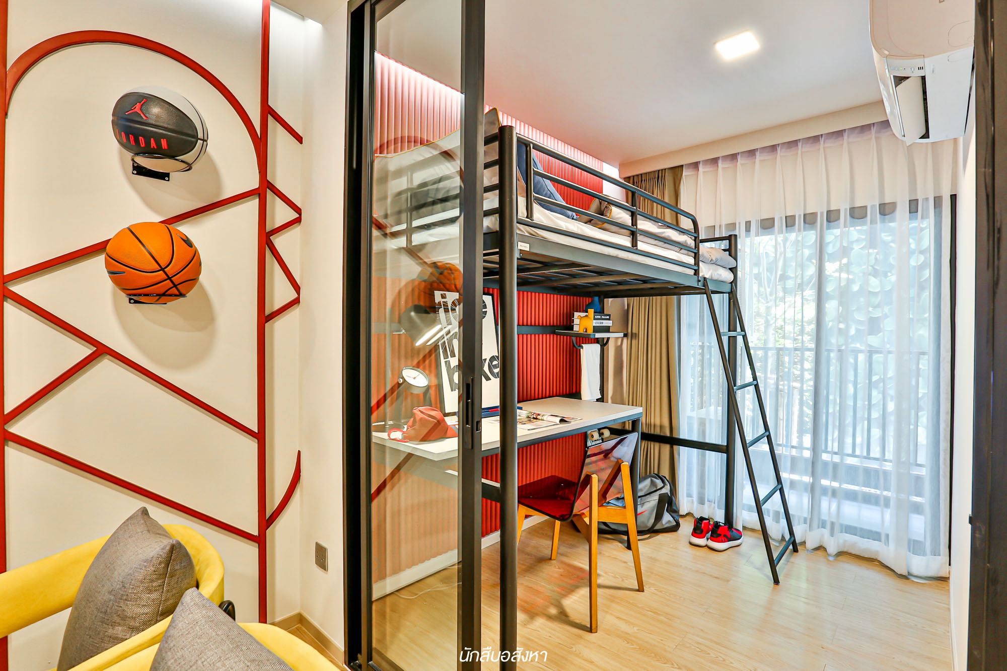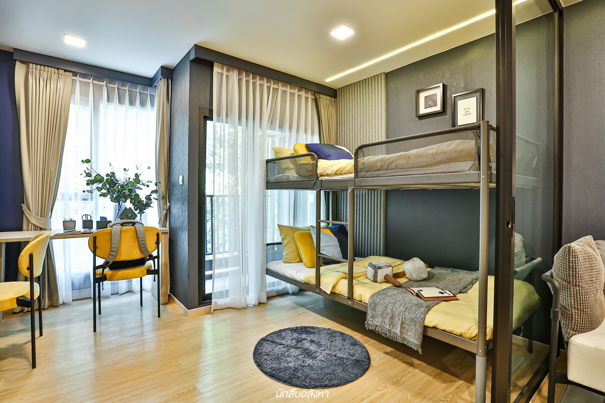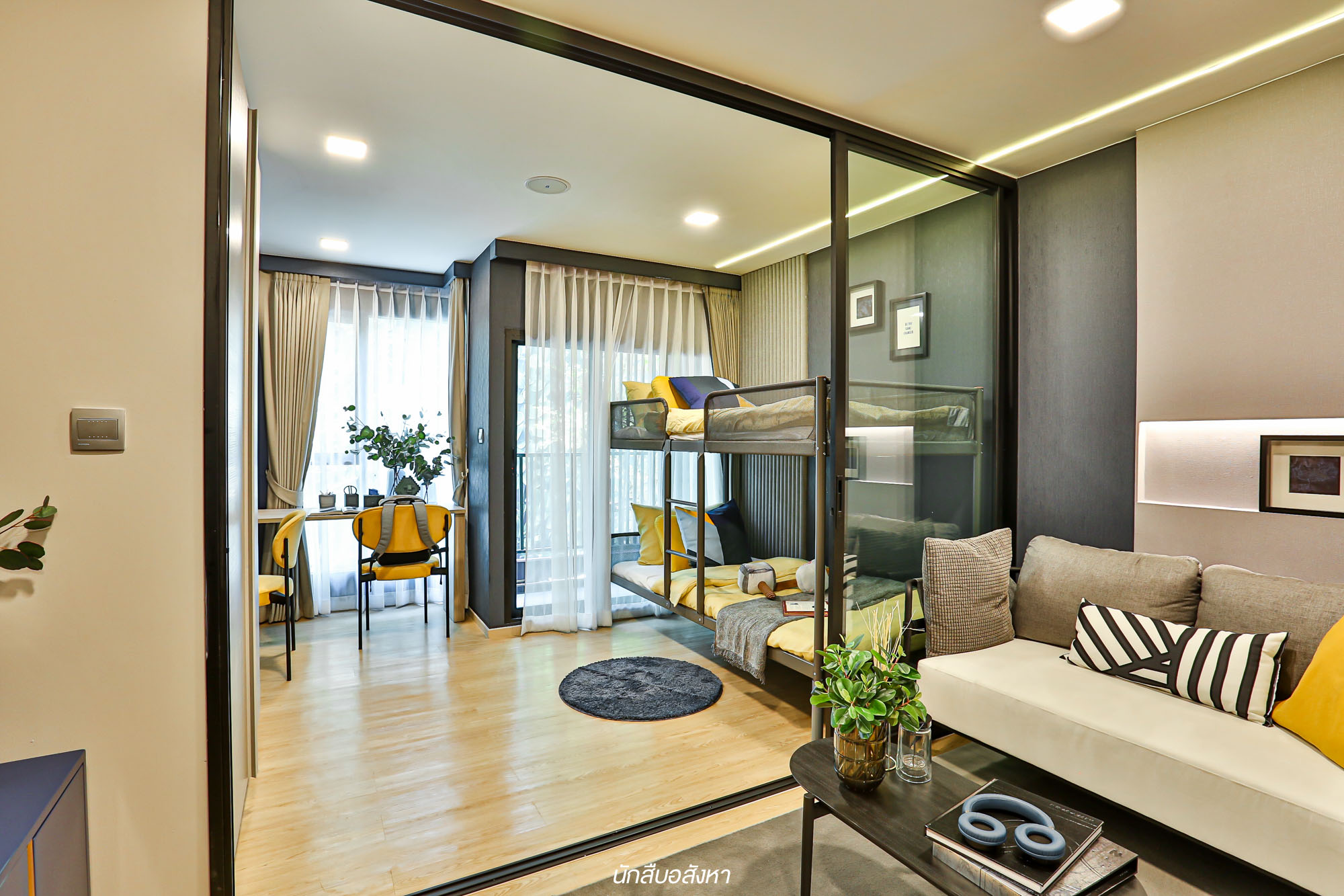 มาต่อกันที่ห้องนอนครับ อย่างที่เห็นในภาพเลยจะเห็นว่าพื้นที่ระหว่าง Living Area กับห้องนอนนั้นจะมีกระจกบานเลื่อนกั้นไว้เพื่อความเป็นส่วนตัวและสัดส่วนมากยิ่งขึ้น พื้นที่ห้องนอนนั้นกว้างชนิดที่ทำเป็นมุมนั่งทำงานเพิ่มได้สบายๆ เลยครับ ซึ่งไอเดียการวางเตียง 2 ชั้นผมว่าเหมาะกับนักศึกษาที่อยู่กับรูมเมทมาก ด้วยขนาดเตียงที่พอดีกับพื้นที่ห้อง ทำให้พื้นที่ภายในสามารถใช้สอยได้อย่างเต็มที่