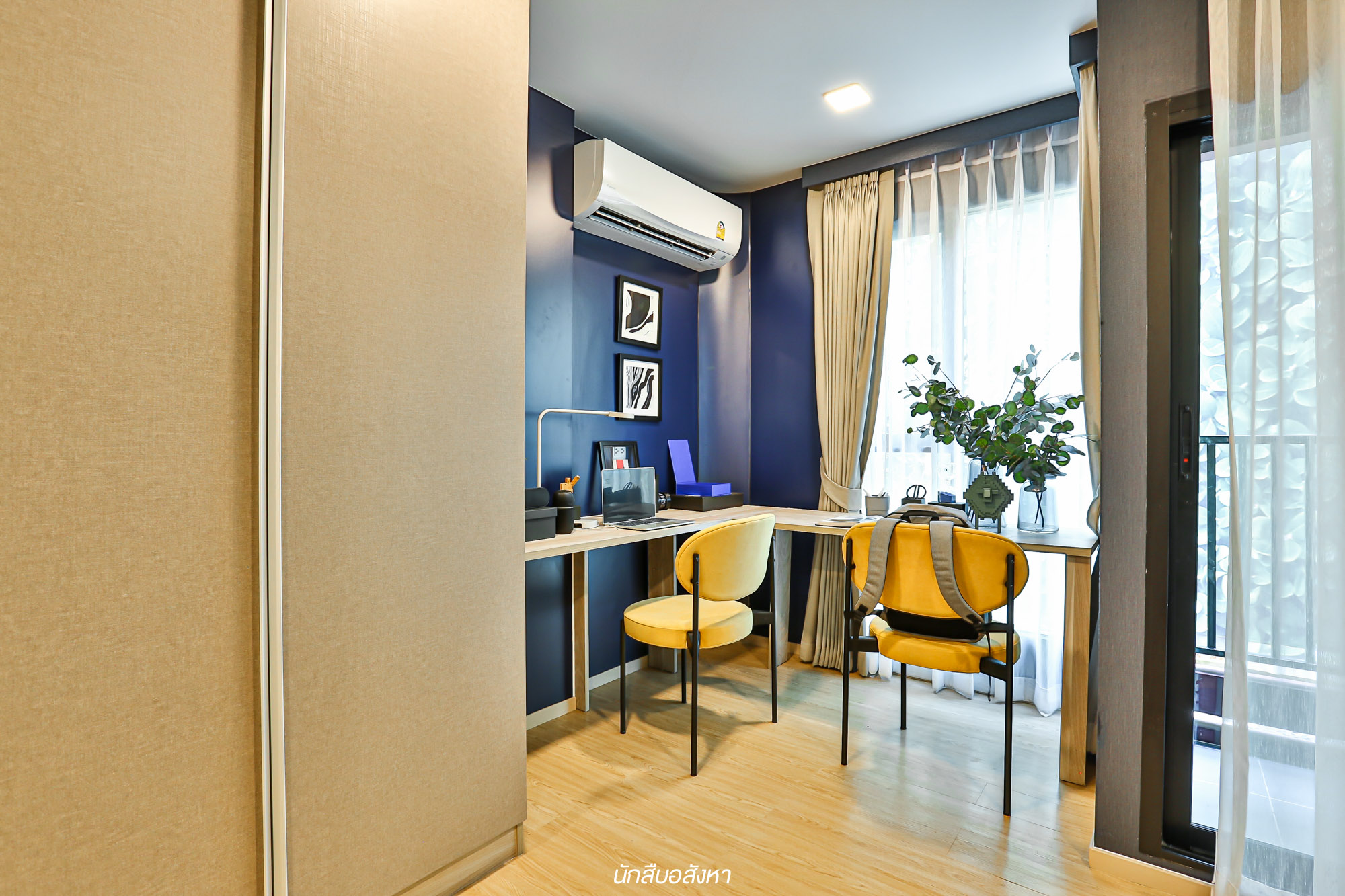 สำหรับมุมทำงานนั้น ทางโครงการตกแต่งมาในรูปแบบของ L – Shape สำหรับ 2 ที่นั่ง อีกทั้งยังเป็นมุมที่แสงสว่างสามารถส่องผ่านเข้ามาได้ครับ ในขณะเดียวกันนั้นพื้นที่ระเบียงห้องนี้ ผมว่าโครงการให้มากว้าง สามารถใช้งานได้จริง ใครจะใช้เป็นมุมสำหรับตากผ้า ใช้สอยประโยชน์ต่างๆ หรือแม้แต่ใช้เทควิวก็ได้เช่นกันครับ