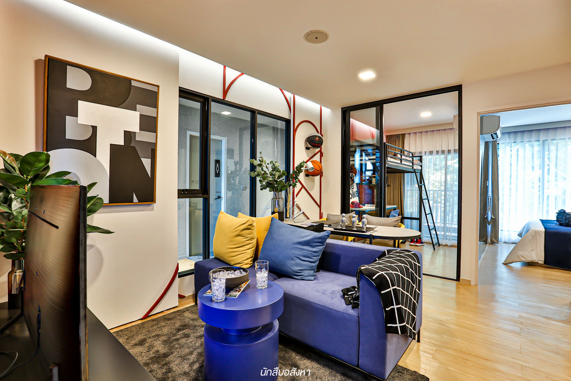 ถัดมาจะเป็นมุม Living Area ซึ่งฟังก์ชันห้องจะคล้ายกับห้องตัวอย่างแรกที่ผมพาไปดูเลยครับ โดยมุมนี้จะเชื่อมต่อกับพื้นที่ห้องนอน และมีกระจกบานเลื่อนกั้นไว้ โดยเซตโซฟานั้นสามารถวางได้ 2 ที่นั่งกำลังพอดีครับ มีโต๊ะกลางขนาดพอดีวาง มุมนี้ใช้พักผ่อนได้ นอกจากนี้แล้ว Space ระหว่างโซฟากับหน้าทีวีก็ค่อนข้างเหลือเยอะเลยครับ