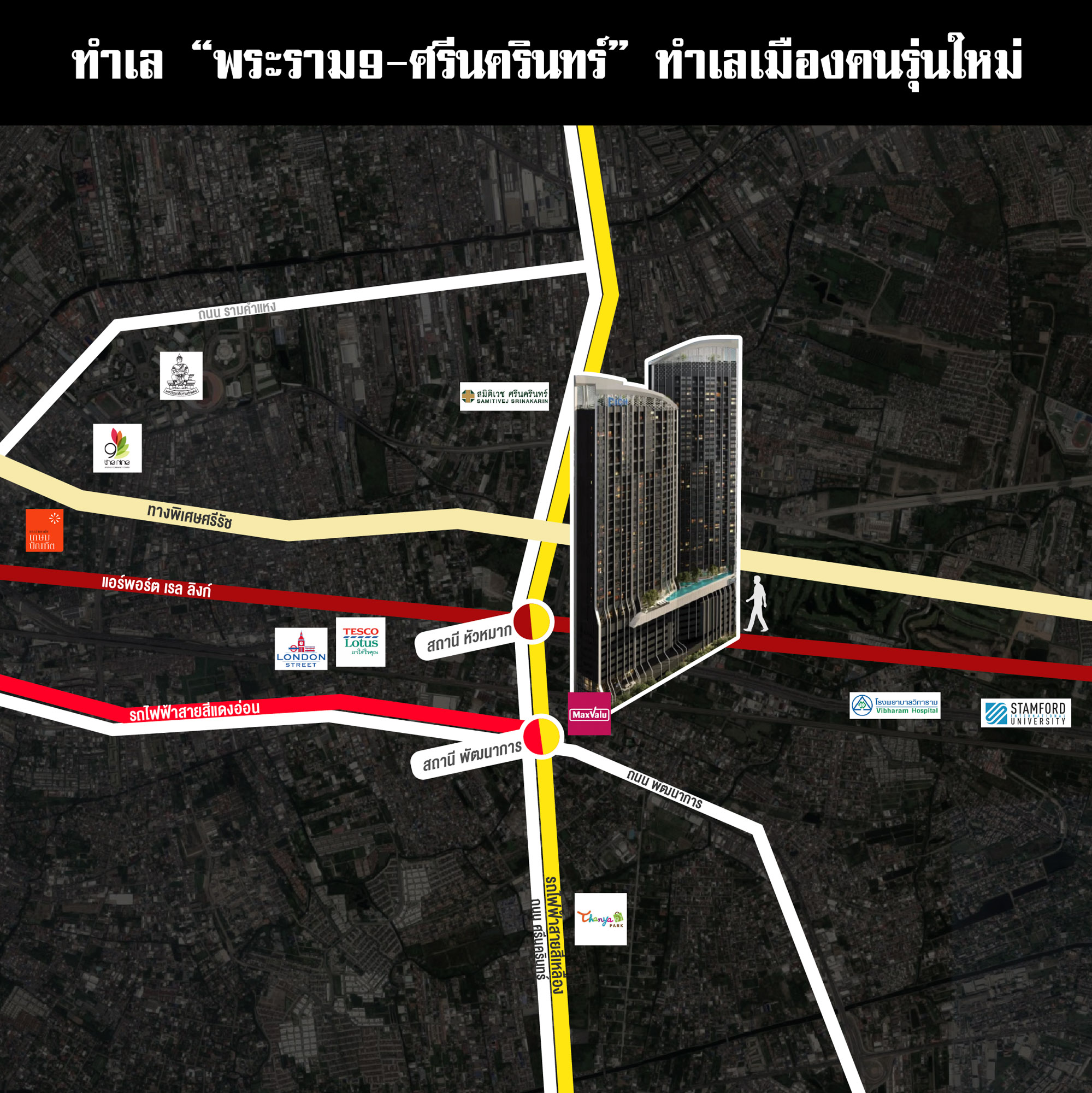 1.ทำเล : ทำเลดี มีศักยภาพในอนาคต เพราะทำเลนี้ติดรถไฟฟ้าถึง 3 สายและยังใกล้ทางด่วนศรีรัช ทำให้การเดินทางของโครงการนี้มีความสะดวกสบายมากเลยครับ นอกจากนั้นโครงการยังใกล้สิ่งอำนวยความสะดวกที่ตอบโจทย์การอยู่อาศัย ไม่ว่าจะเป็น Max Value ร้านอาหารต่างๆ เช่น Mc Donald’s, The Pizza Company, Swensen’s, KFC, S&P และธนาคารต่างๆ, Tesco Lotus สาขาพัฒนาการสำหรับแม่บ้านที่ชอบความคุ้มค่า, London Street ให้ไปเดินชอปปิ้งเลือกซื้อของกันเอง รวมไปถึงโรงพยาบาลชั้นนำต่างๆ อีกด้วยครับ