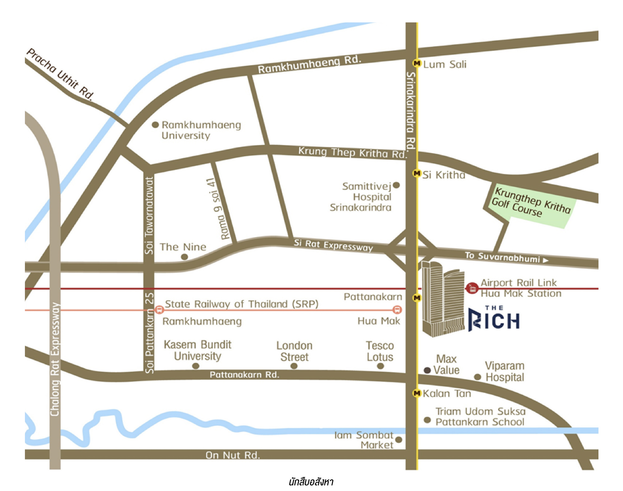 โครงการ The Rich พระราม 9 – ศรีนครินทร์ Triple Station โครงการติดถนนใหญ่อย่างถนนศรีนครินทร์ เชื่อมต่อเส้นทางเข้า-ออกเมืองได้หลายเส้นทางไม่ว่าจะเป็นเส้นถนนพัฒนาการ, ถนนกรุงเทพกรีฑา และถนนรามคำแหง ติดทางขึ้นทางด่วนศรีรัช สะดวกในการเดินทาง และติดรถไฟฟ้า 3 สาย 0 เมตรจากบันไดสถานีรถไฟฟ้าสายสีเหลือง สถานีพัฒนาการ รถไฟฟ้าสายสีแดงอ่อน , และ 200 เมตร แอร์พอร์ตลิงค์ สถานีหัวหมาก ซึ่งเดินทางเข้าเมืองได้ไม่ถึง 20 นาที และยังใกล้สิ่งอำนวยความสะดวกรายล้อมโครงการ ทั้ง Community เช่น Max Value, Tesco Lotus, London Street, Seacon Square, Thanya Park, ตลาดนัดตะวันนา และตลาดนัดรถไฟ, ใกล้ห้างสรรพสินค้าที่เป็นแหล่งรวมของคนย่านนี้ อย่างเดอะมอลล์ บางกะปิและใกล้โรงพยาบาลชั้นนำ เช่น โรง พยาบาลสมิติเวช, โรงพยาบาลวิภารามและโรงพยาบาลปิยะเวช เห็นไหมครับว่าทำเลนี้เป็นทำเลนึงที่มีพัฒนาการและความเจริญเข้ามาตลอด ซึ่งผมมองว่าน่าสนใจนะครับ