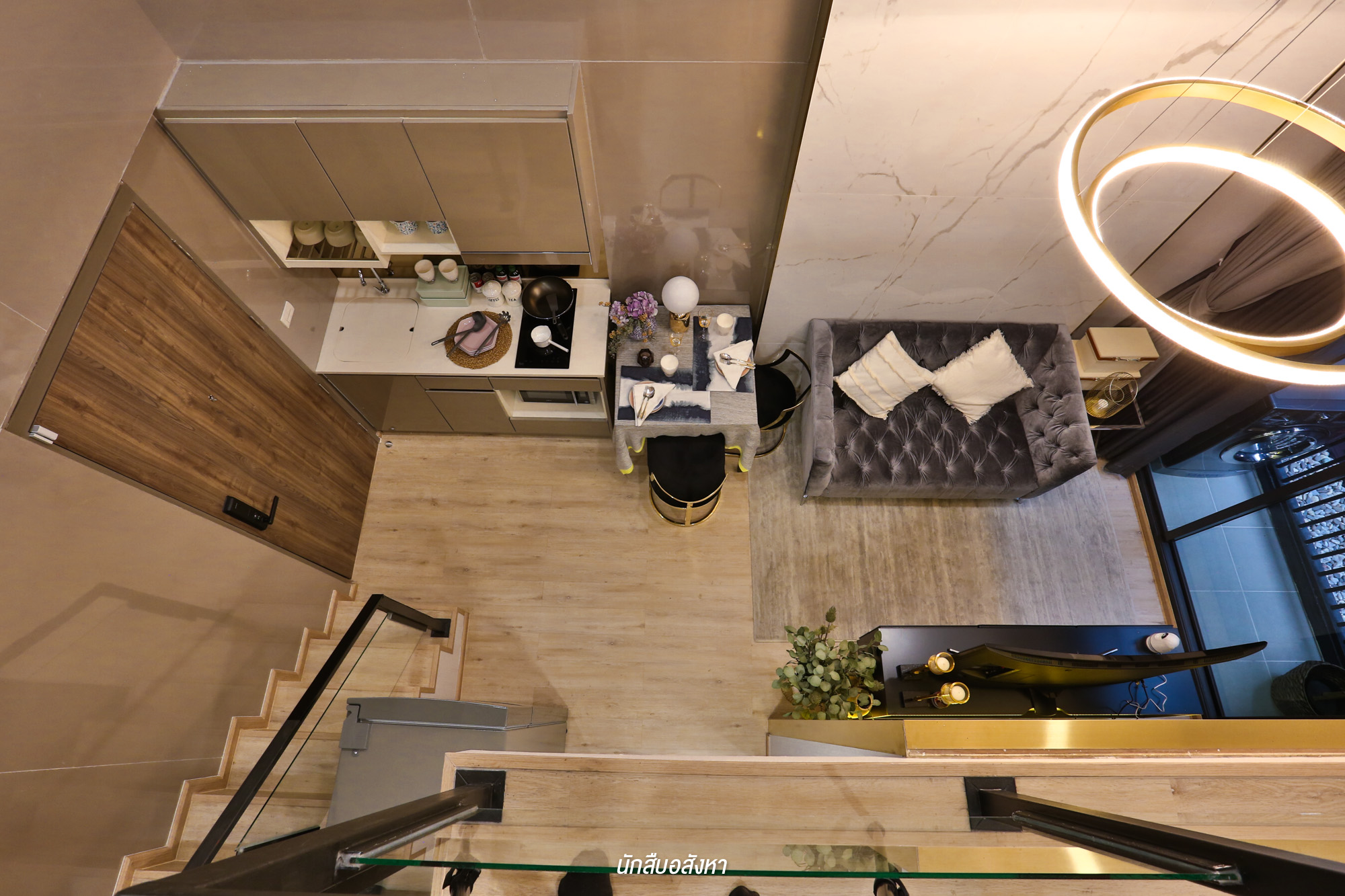 ห้องรูปแบนนี้ ผมชอบครับ เพราะเป็น Double Floor ในการพักอาศัย อารมณ์เหมือนได้อยู่บ้าน 2 ชั้นหรือห้อง Duplex เดินเข้ามาที่ห้องจะเจอครัวก่อนครับ ซึ่งจะมีฉากกั้นให้เป็นครัวกึ่งปิด ถัดมาจะเจอโซน Living Area ที่มีพื้นที่กว้าง และสามารถนั่งชมวิวข้างนอกได้ด้วยครับ ความสูงเพดานจะอยู่ที่ 4.4 เมตร ซึ่งถือว่าสูงมากนะครับ