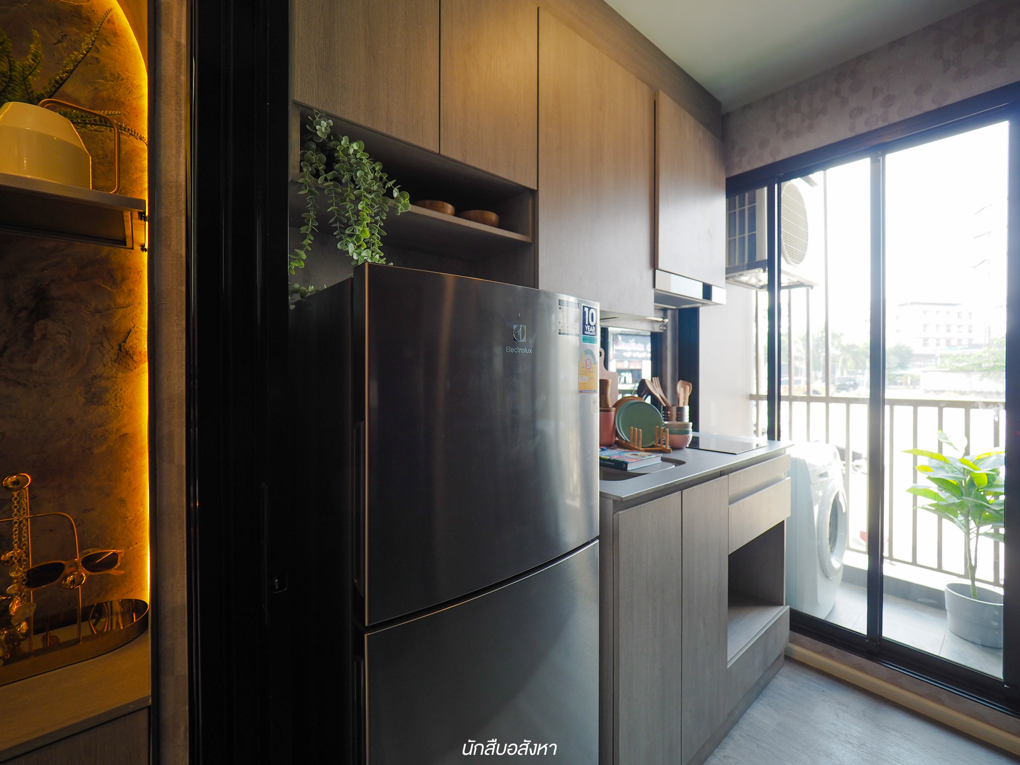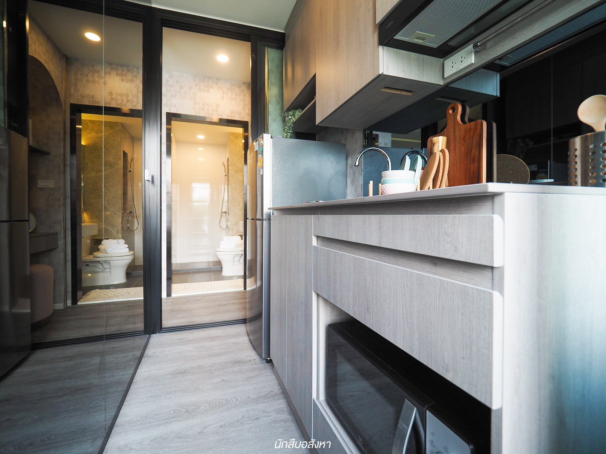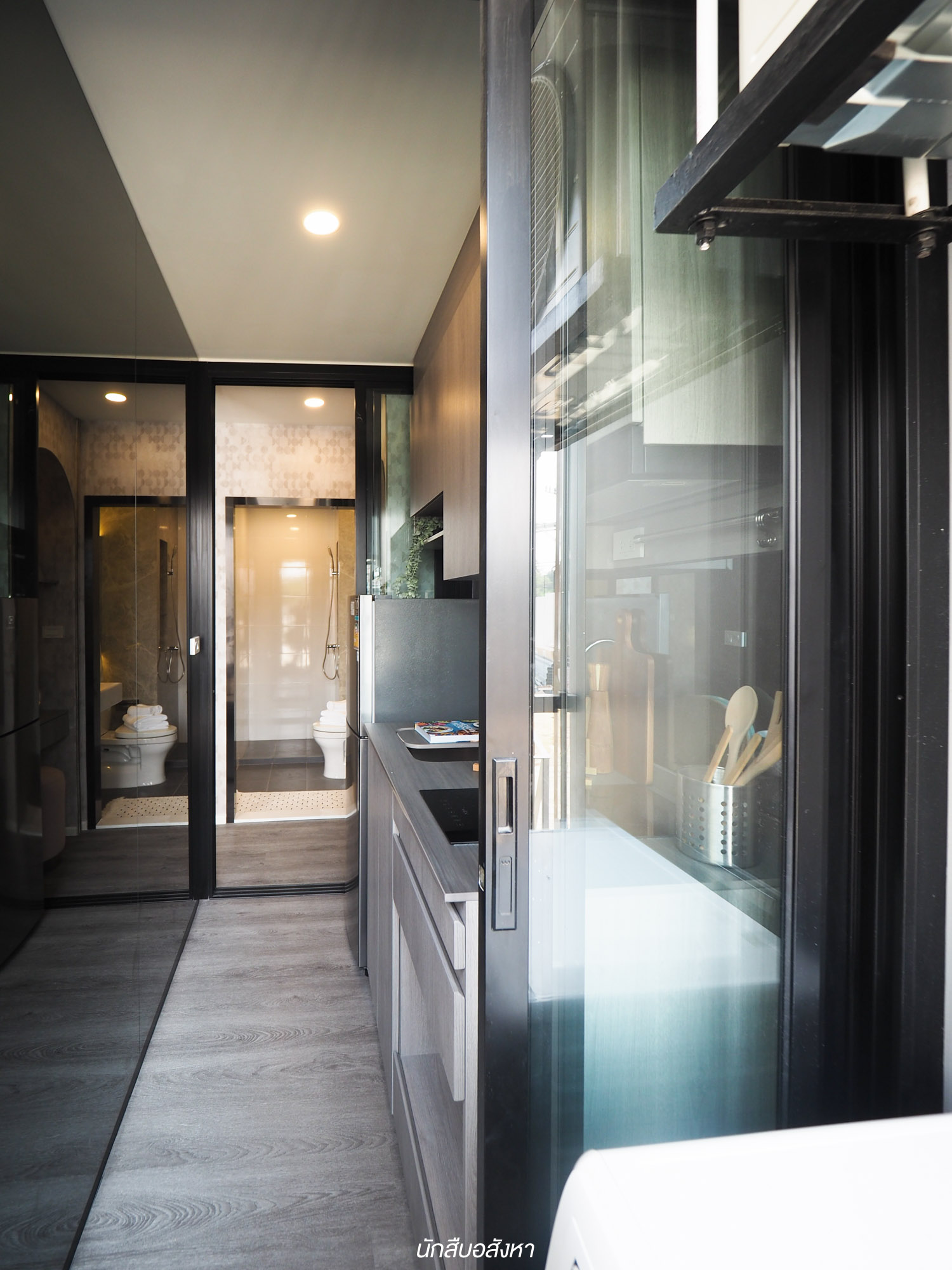 พื้นที่แรกที่อยู่ติดประตูจะเป็นครัวปิดที่ทางโครงการให้เซต Built-in มาพร้อมเหมือนในห้องตัวอย่างเลยครับ มีพื้นที่วางตู้เก็บรองเท้า ส่วน Partition ที่กั้นระหว่างพื้นที่ของห้องครัวกับห้องนั่งเล่นนั้น จะเป็นแบบ 3 บาน เปิดได้กว้างขึ้น ห้องไม่ดูแคบ