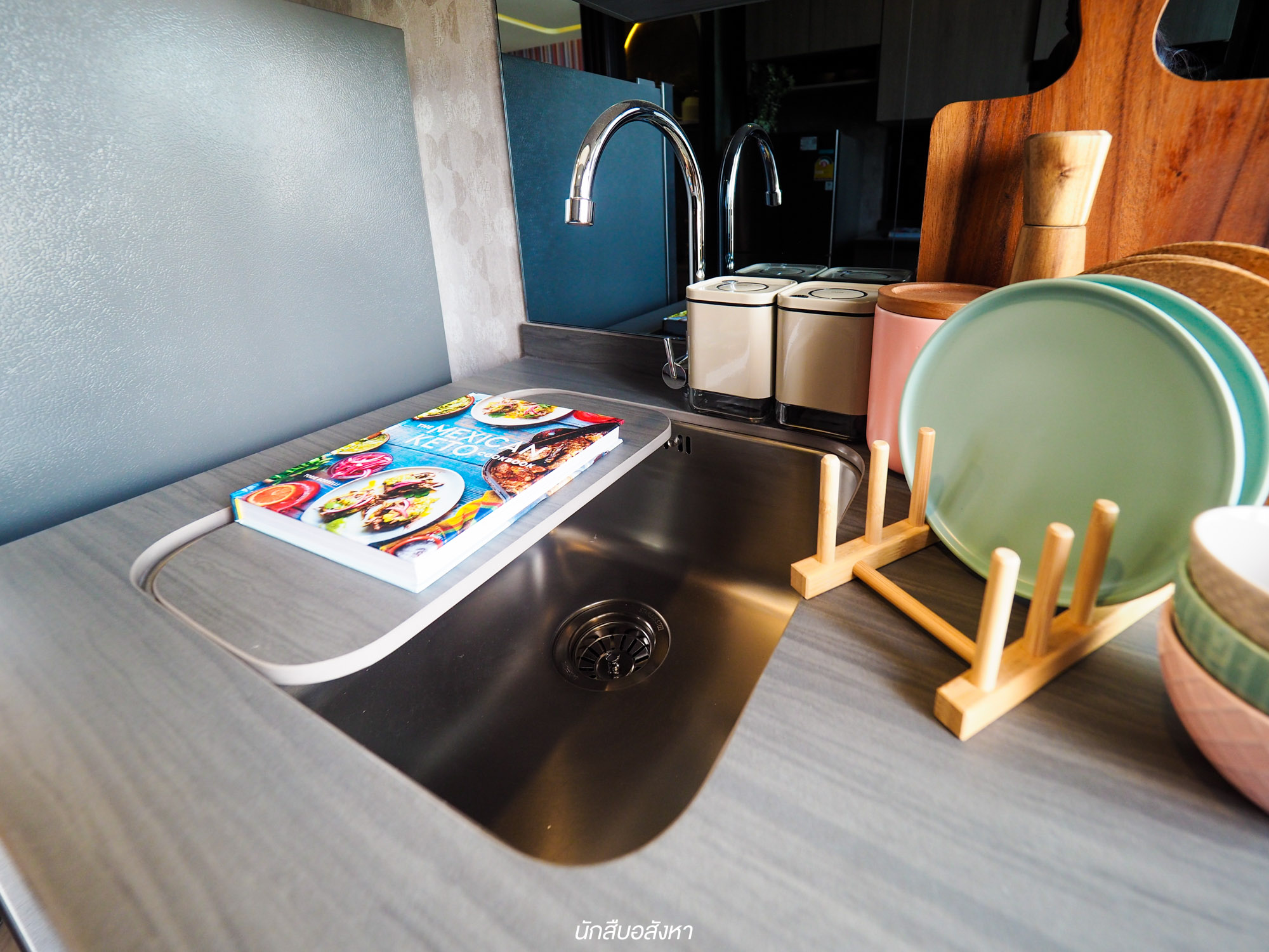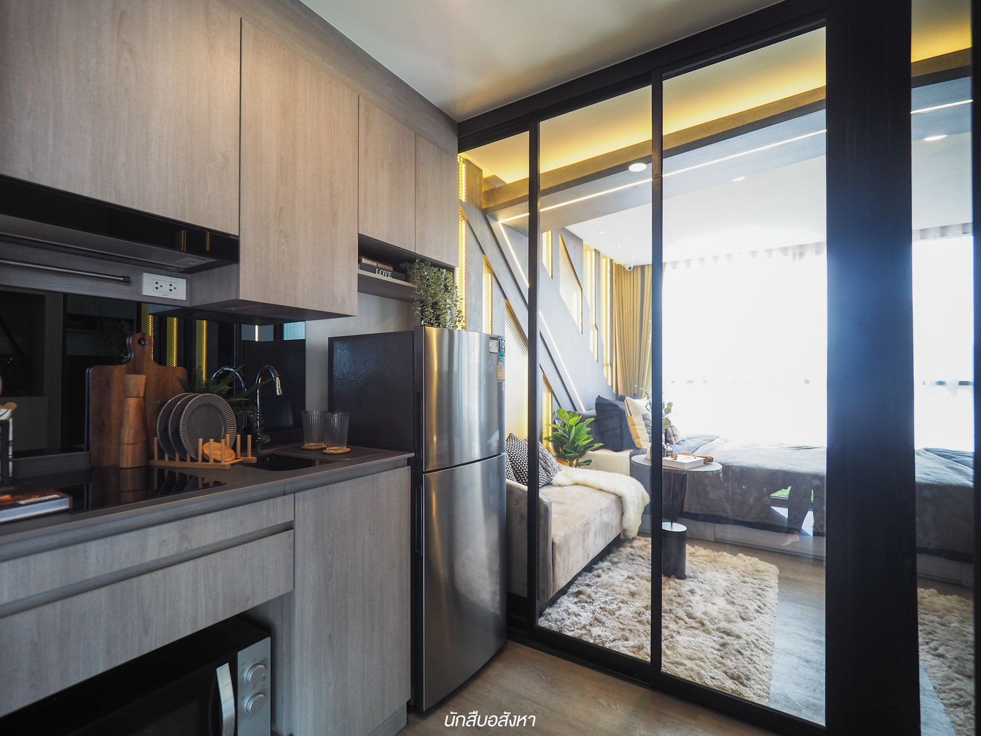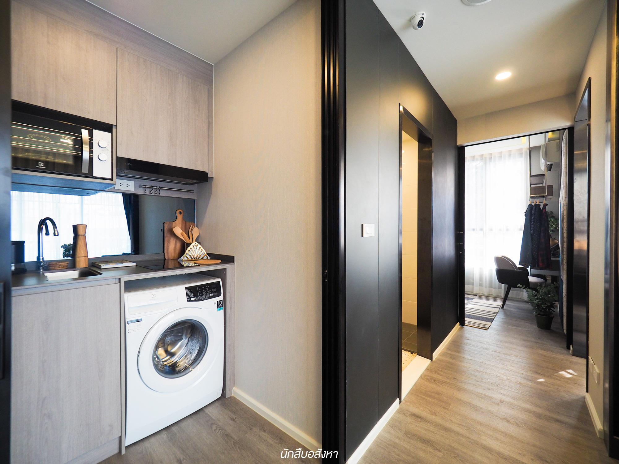 พื้นที่แรกที่อยู่ติดประตูจะเป็นครัวปิดที่ทางโครงการให้เซต Built-in มาพร้อมเหมือนในห้องตัวอย่างเลยครับ มีพื้นที่วางตู้เก็บรองเท้า ส่วน Partition ที่กั้นระหว่างพื้นที่ของห้องครัวกับห้องนั่งเล่นนั้น จะเป็นแบบ 3 บาน เปิดได้กว้างขึ้น ห้องไม่ดูแคบ